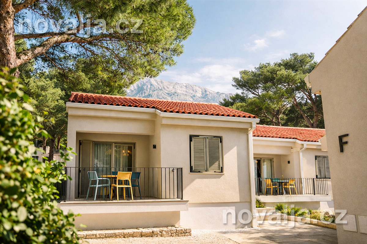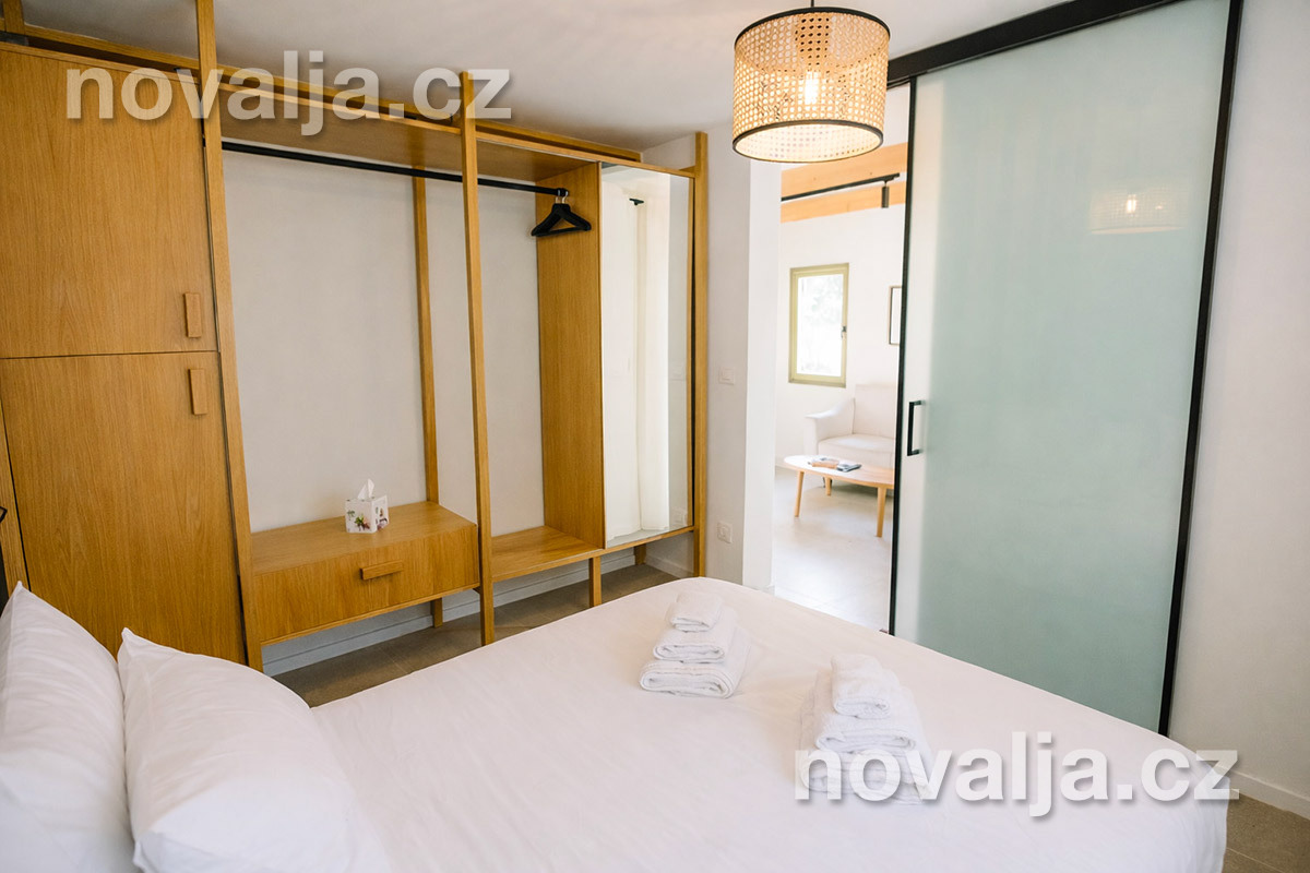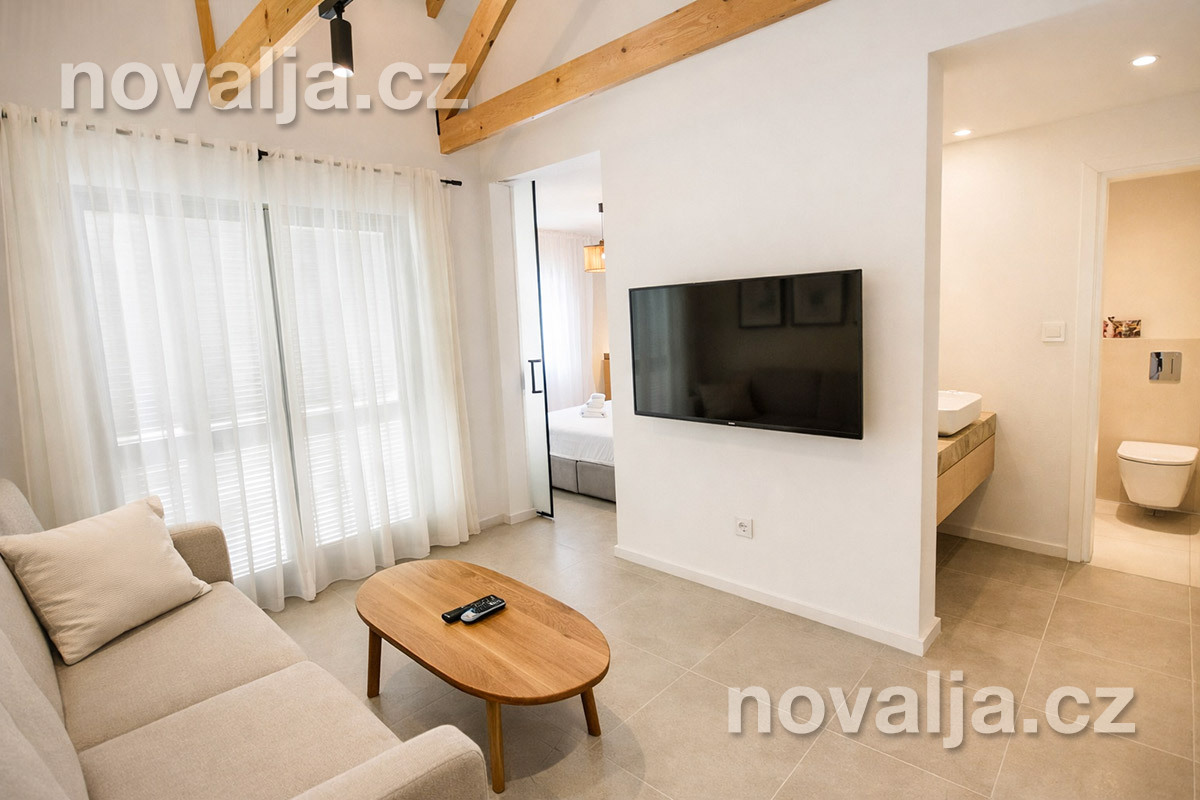 1 ložnice se dvěma lůžky (manželské lůžko), vybavená kuchyňka (indukční deska, lednička, varná konvice) s obývacím prostorem se dvěma rozkládacími pohovkami (nebo jednou větší) pro 1–2 děti, Smart TV, 2x sociální zařízení se sprchovým koutem a WC, fén, balkón se zahradním nábytkem.