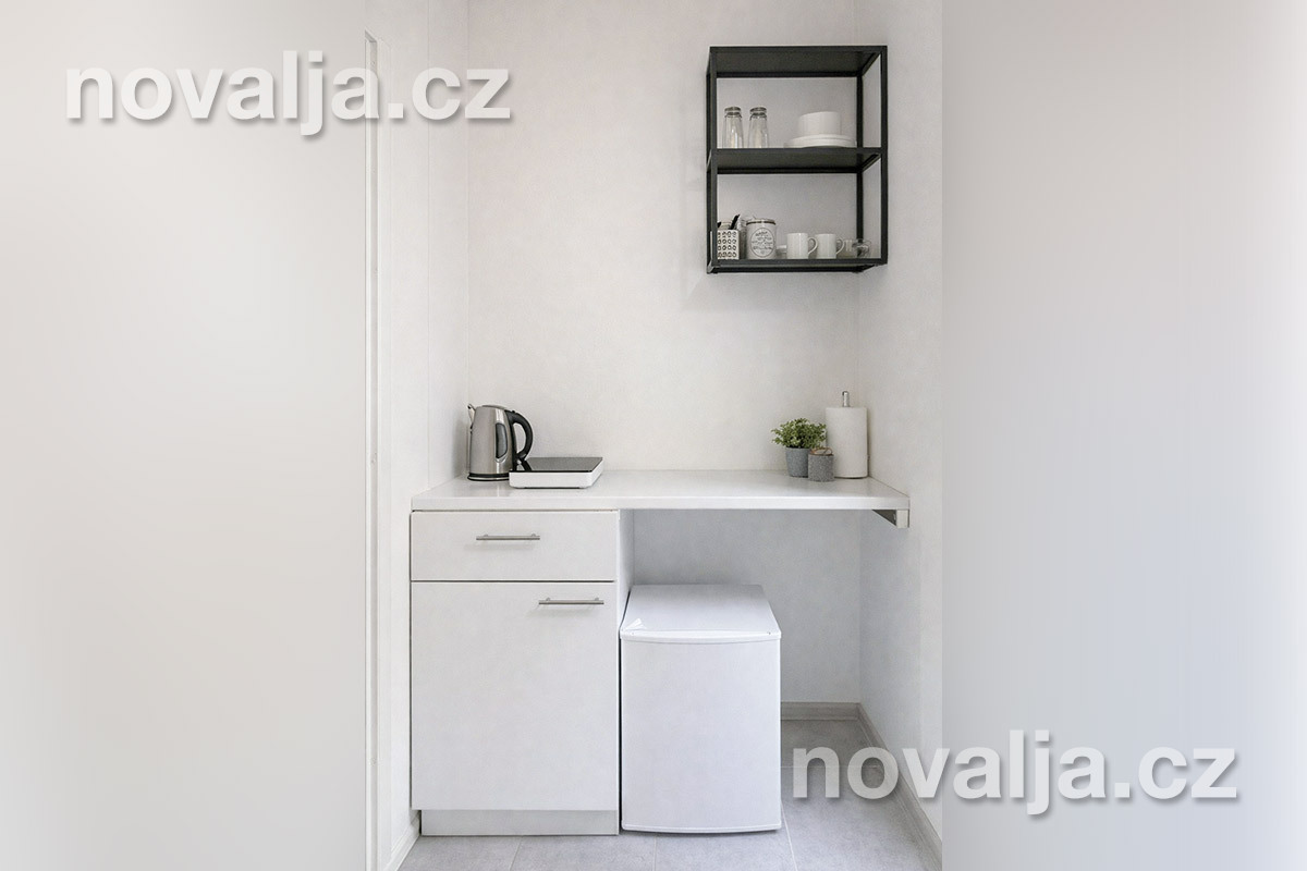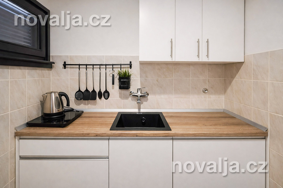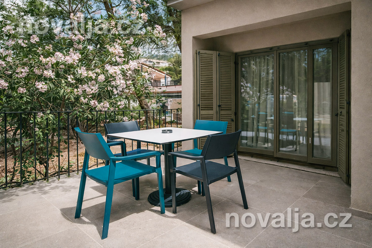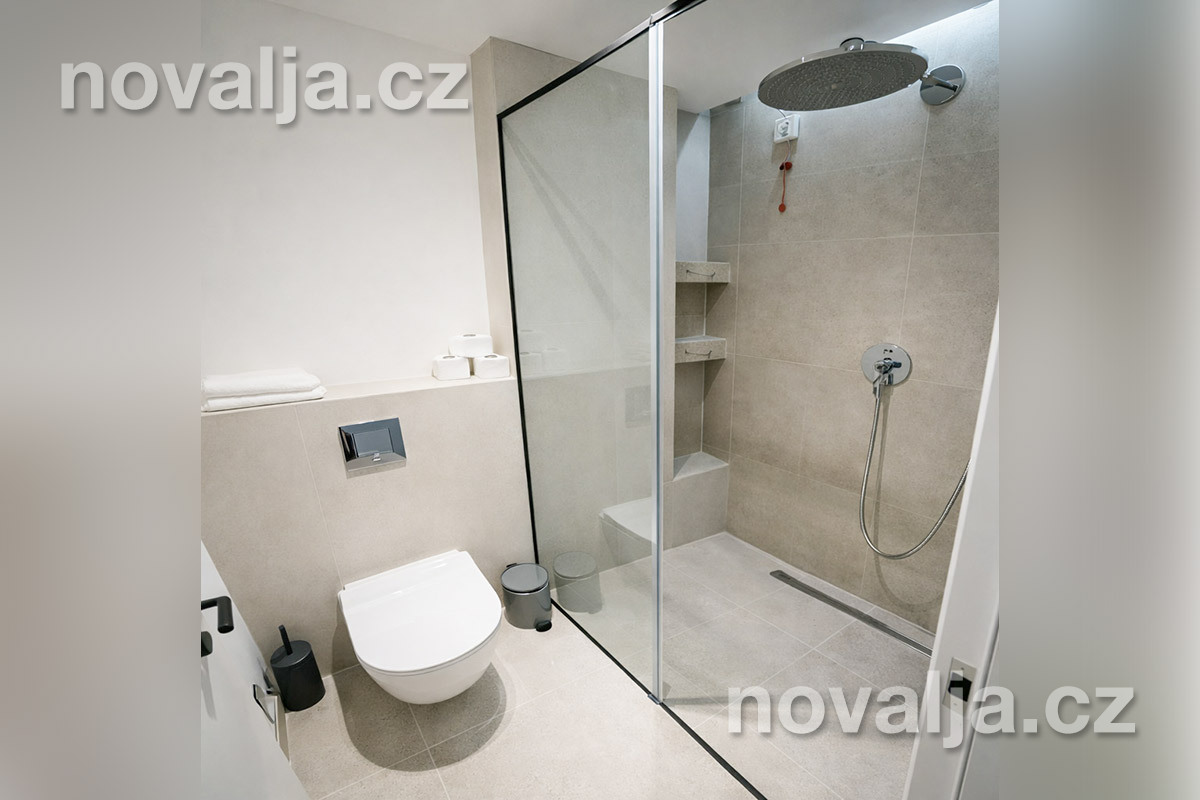 1 ložnice se dvěma lůžky (manželské lůžko), vybavená kuchyňka (indukční deska, lednička, varná konvice) s obývacím prostorem se dvěma rozkládacími pohovkami (nebo jednou větší) pro 1–2 děti, Smart TV, 2x sociální zařízení se sprchovým koutem a WC, fén, balkón se zahradním nábytkem.