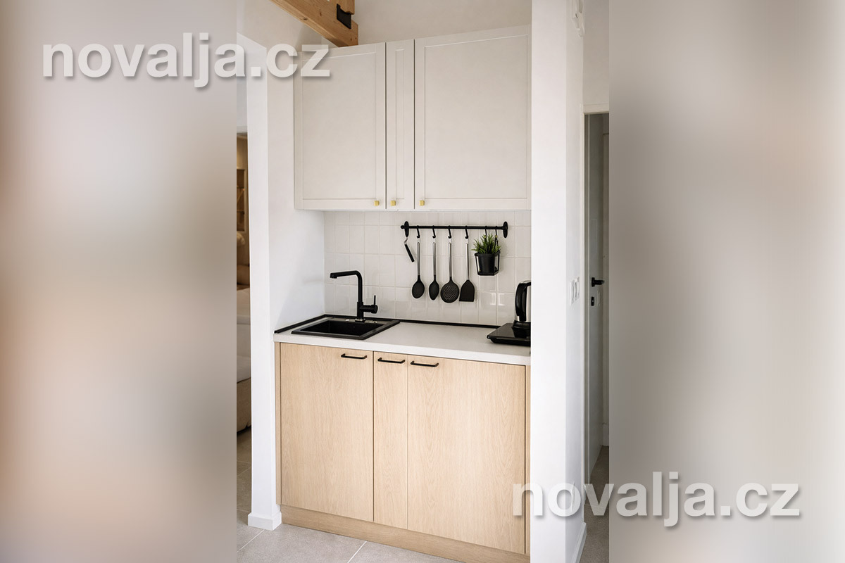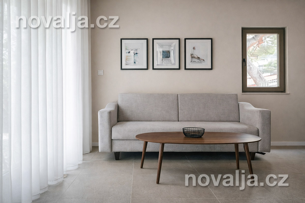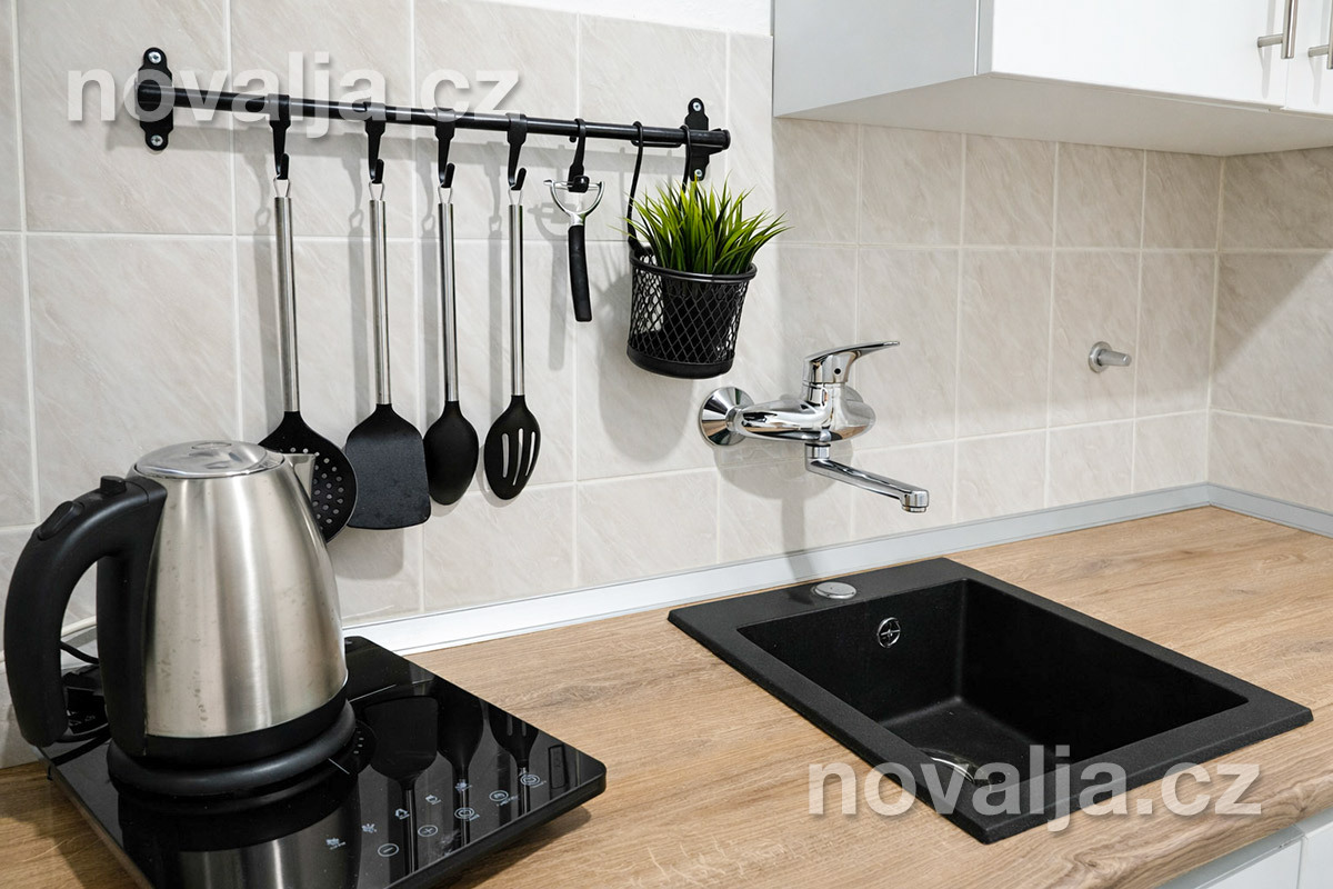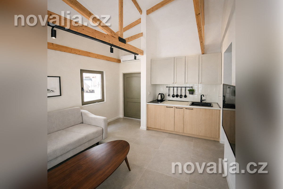 2 ložnice se dvěma lůžky (1x manželské lůžko 160 x 200 cm a 2 samostatná lůžka 90 x 200 cm), vybavená kuchyňka (indukční deska, lednička, varná konvice) s obývacím prostorem s rozkládacím gaučem pro 1–2 osoby, Smart TV, sociální zařízení se sprchovým koutem a WC, fén, balkón se zahradním nábytkem.