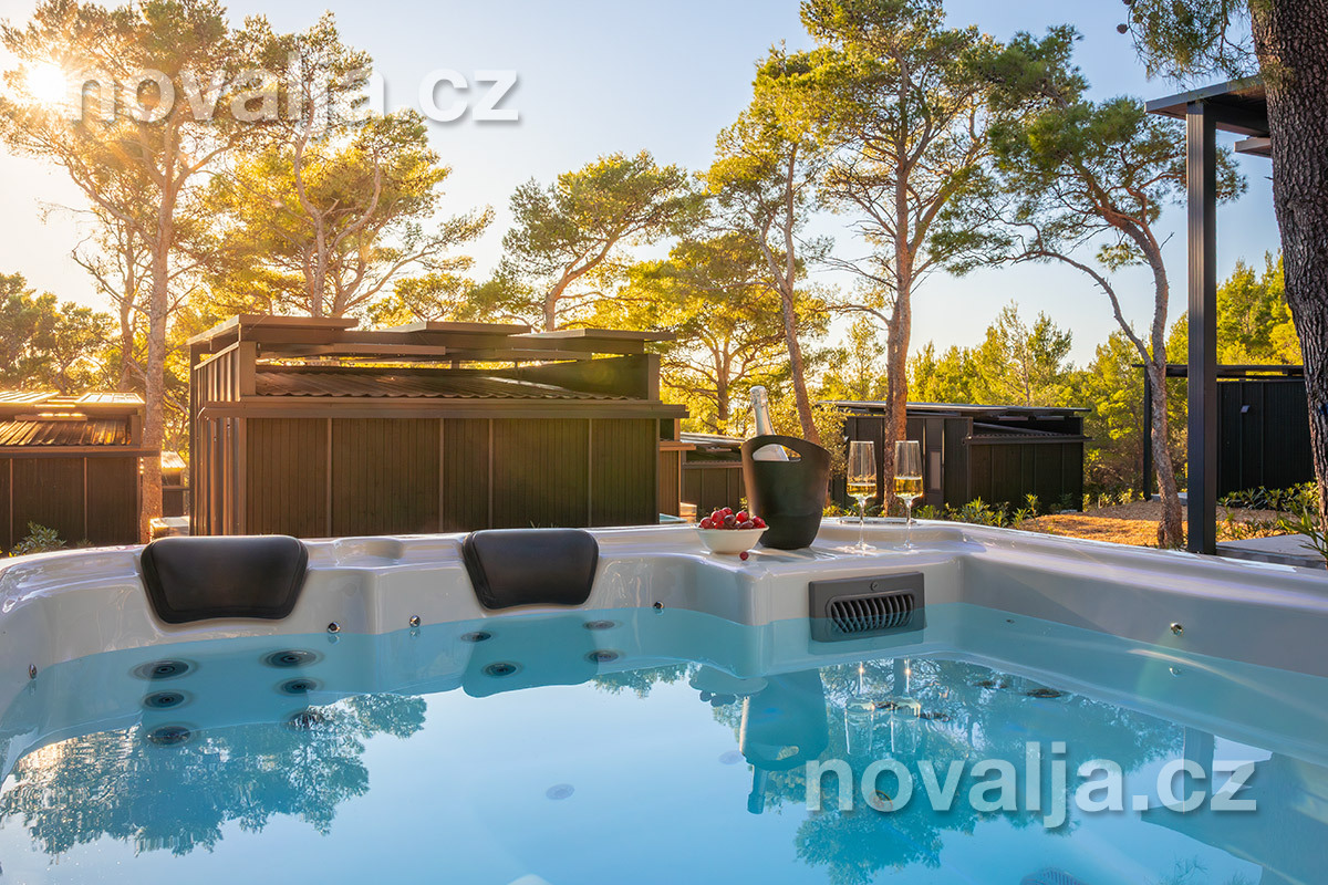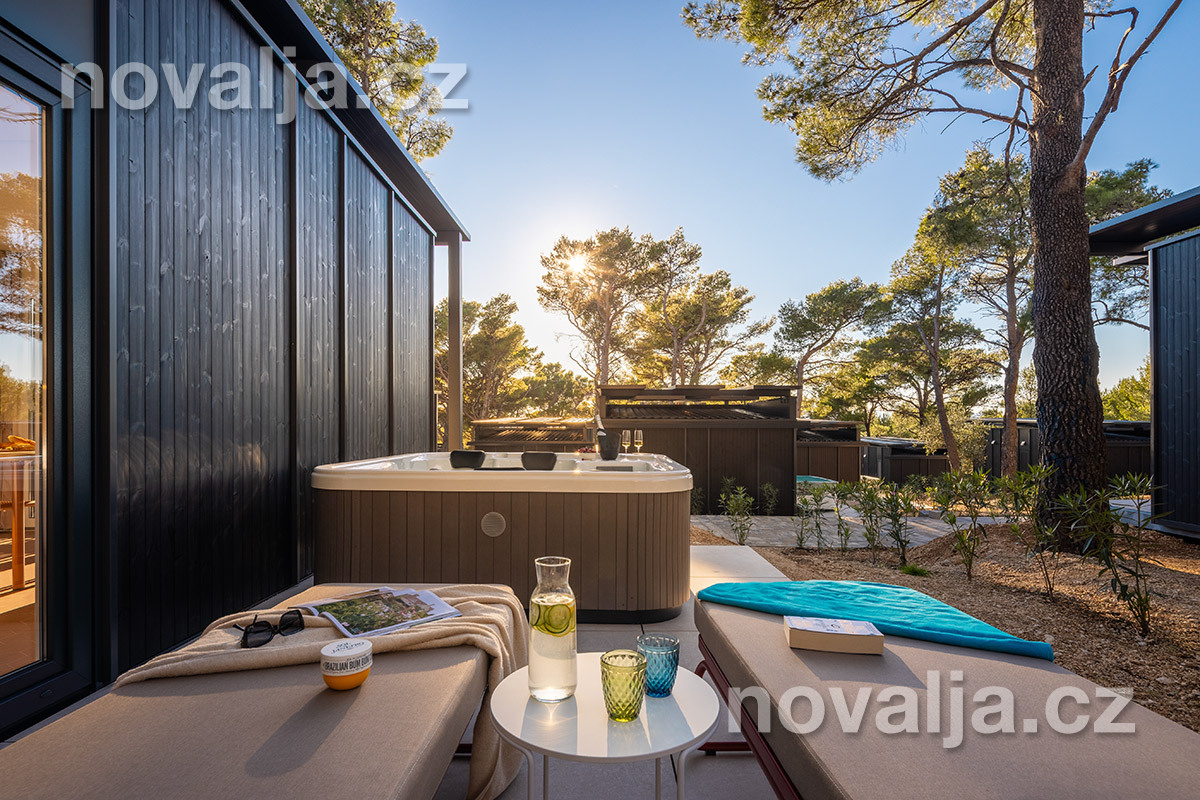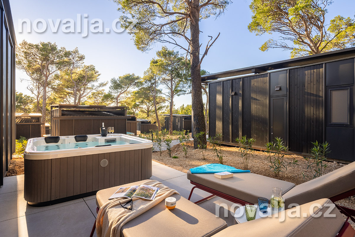 2 ložnice se dvěma lůžky (1x manželská postel 200 x 160 cm a 2x samostatné lůžko 200 x 80 cm), vybavená kuchyň (indukční varná deska, lednička, mrazák, myčka, varná konvice, kávovar) s obývacím prostorem s rozkládacím gaučem pro 1 osobu (v rozloženém stavu 150 x 185 cm), TV, 2x koupelna se sprchovým koutem a WC, fén, trezor, krytá terasa se zahradním nábytkem, dvěma lehátky a soukromou vířivkou. Klimatizace v kuchyni (v ceně).