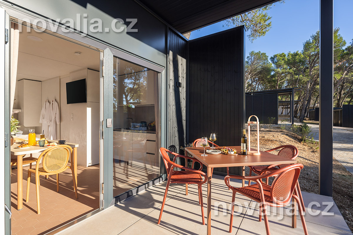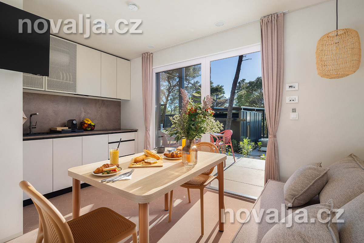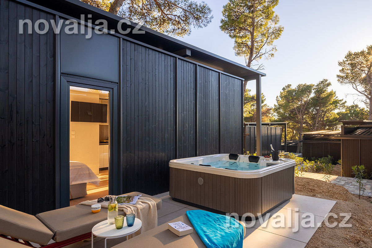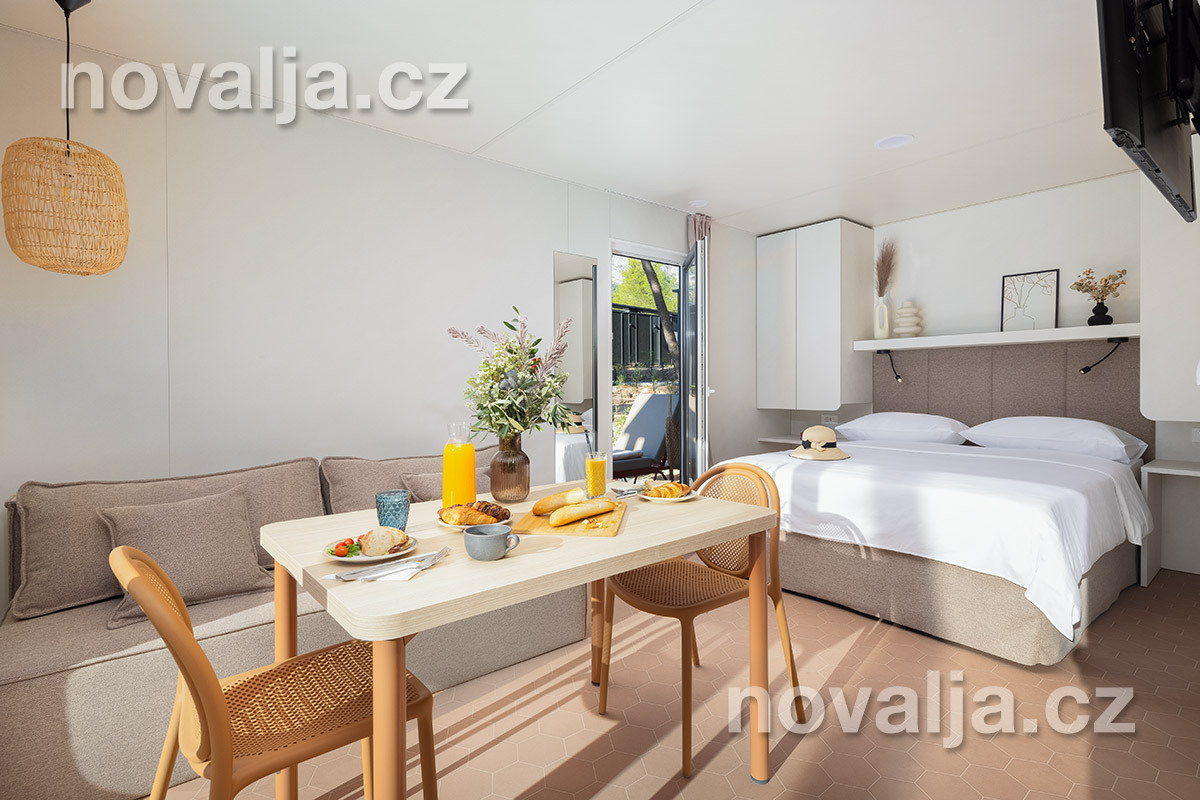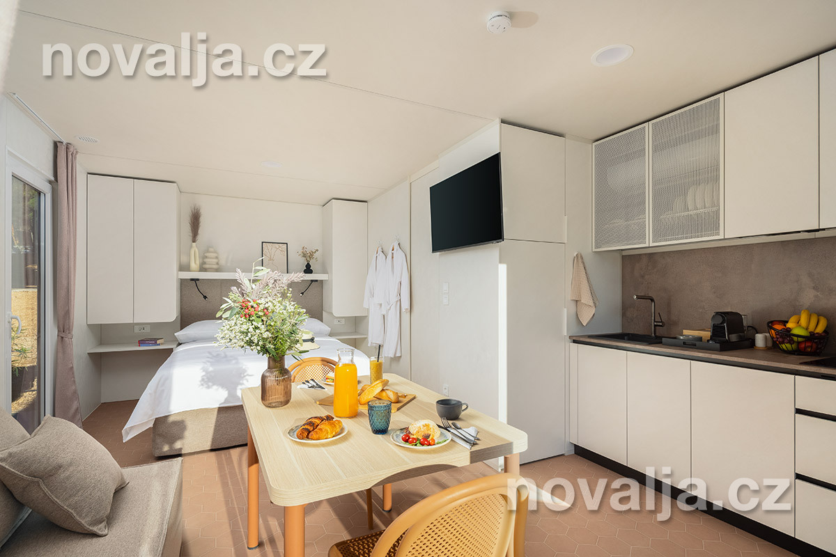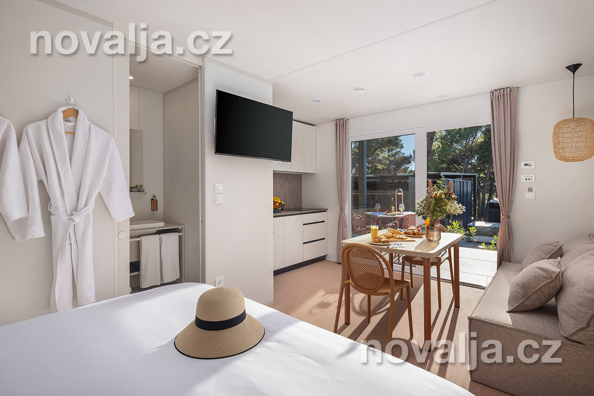 Studio (jedna místnost) se dvěma lůžky (1x manželská postel 200 x 160), vybavená kuchyň (indukční varná deska, lednička, mrazák, myčka, varná konvice, kávovar) s obývacím prostorem s rozkládacím gaučem pro 1 osobu (v rozloženém stavu 150 x 185 cm), TV, koupelna se sprchovým koutem a WC, fén, trezor, 2 terasy - 1x krytá terasa se zahradním nábytkem, 1x otevřená terasa se dvěma lehátky a soukromou vířivkou. Klimatizace v kuchyni (v ceně).