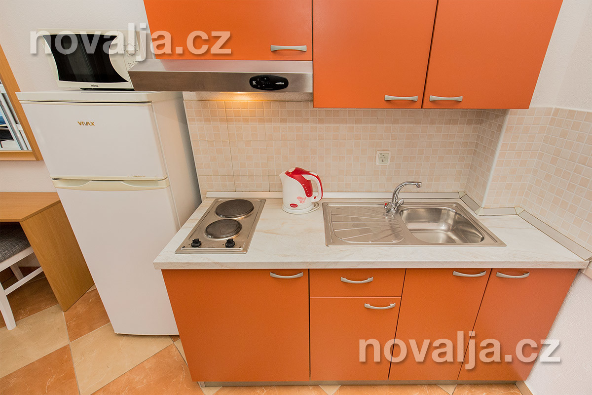 1 ložnice se dvěma lůžky, vybavená kuchyň (lednička, mrazák, mikrovlnná trouba, varná konvice) s rozkládacím gaučem (200 x 160 cm) pro 1-2 osoby, TV+SAT, sociální zařízení se sprchovým koutem a WC, terasa s výhledem na moře. Klimatizace v kuchyni (v ceně).