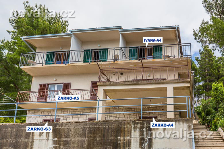 Apartmány Ivana se nacházejí ve stejném domě jako apartmány Žarko (různí majitelé). Oba domy jsou vhodné pro skupiny rodin, které se znají.
