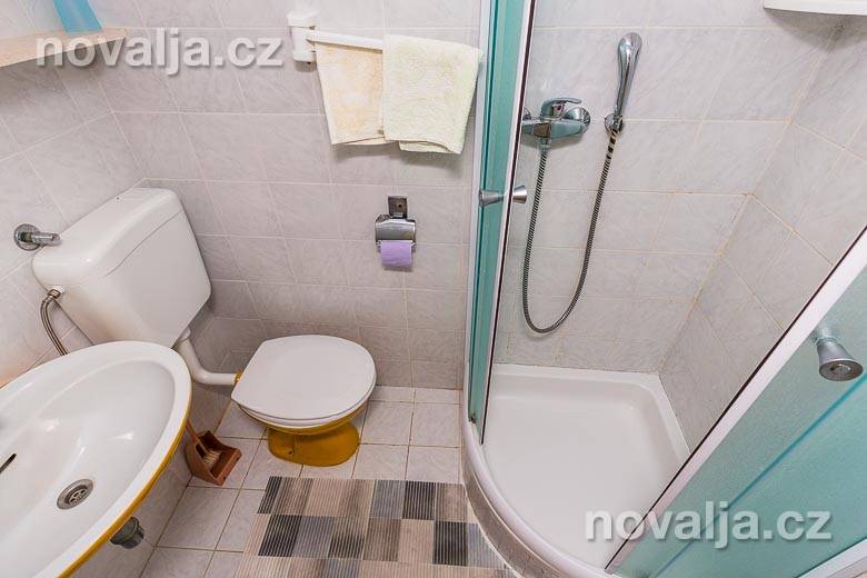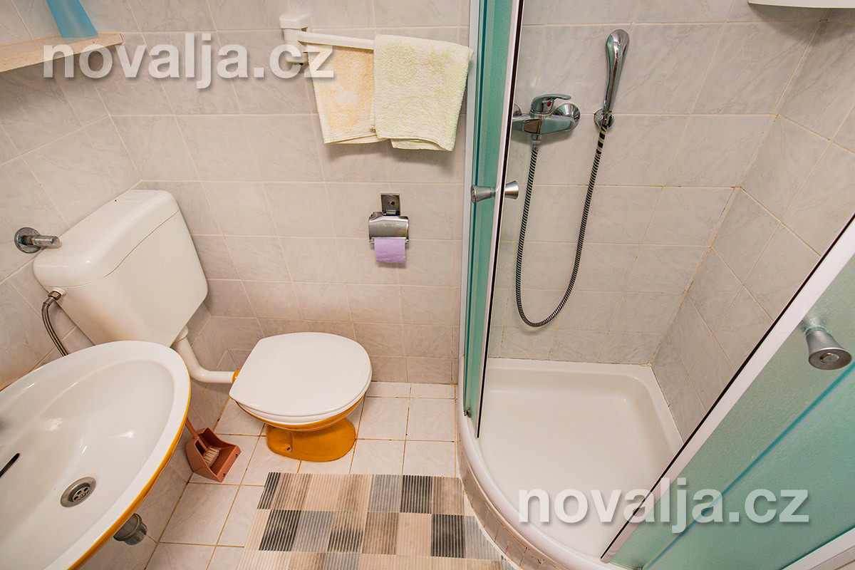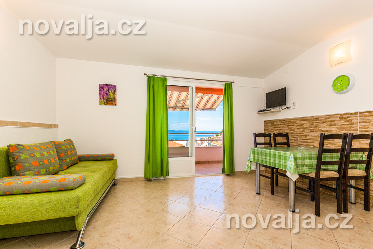 1 ložnice se dvěma lůžky, vybavená kuchyň (lednička, mrazák, myčka + tablety do myčky, mikrovlnná trouba, varná konvice, toaster) s rozkládacím gaučem pro 1-2 osoby (buď 2 děti do 12 let, nebo jen 1 osoba starší 12 let), TV, sociální zařízení s malou vanou a WC, fén, terasa s výhledem na moře. Klimatizace v kuchyni (v ceně).