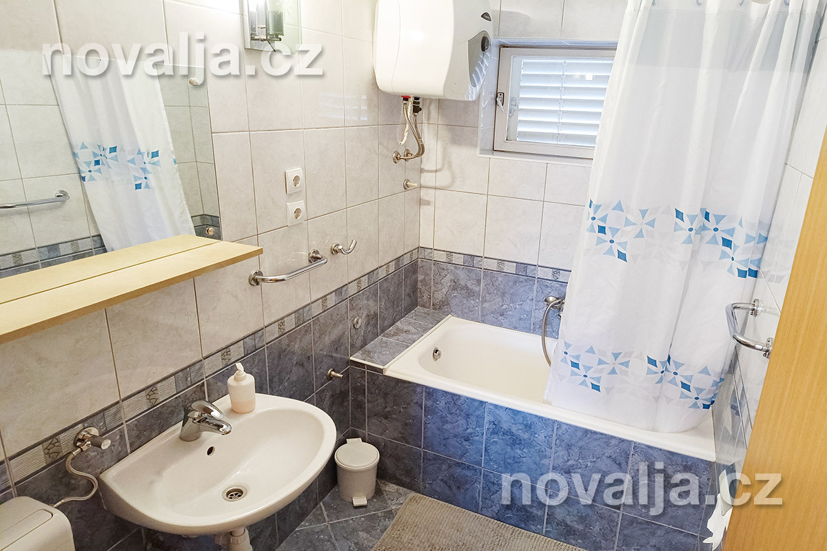 2 ložnice se dvěma lůžky, vybavená kuchyň (lednička, mrazák, trouba, myčka + tablety do myčky, mikrovlnná trouba, varná konvice, toaster) s rozkládacím gaučem pro 1 osobu, TV, sociální zařízení s vanou a WC, pračka, fén, terasa s výhledem na moře. Klimatizace v kuchyni (v ceně).