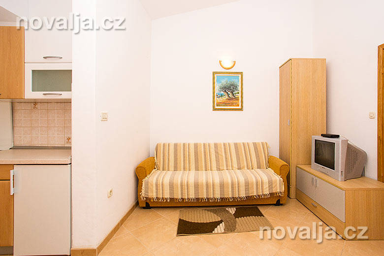 1 ložnice se dvěma lůžky, vybavená kuchyň (lednička, trouba) se dvěma rozkládacími gauči (200 x 100 cm) - každý pro 1 osobu, sociální zařízení se sprchovým koutem a WC, TV, prostorná terasa s výhledem na moře. Klimatizace v kuchyni (v ceně).
