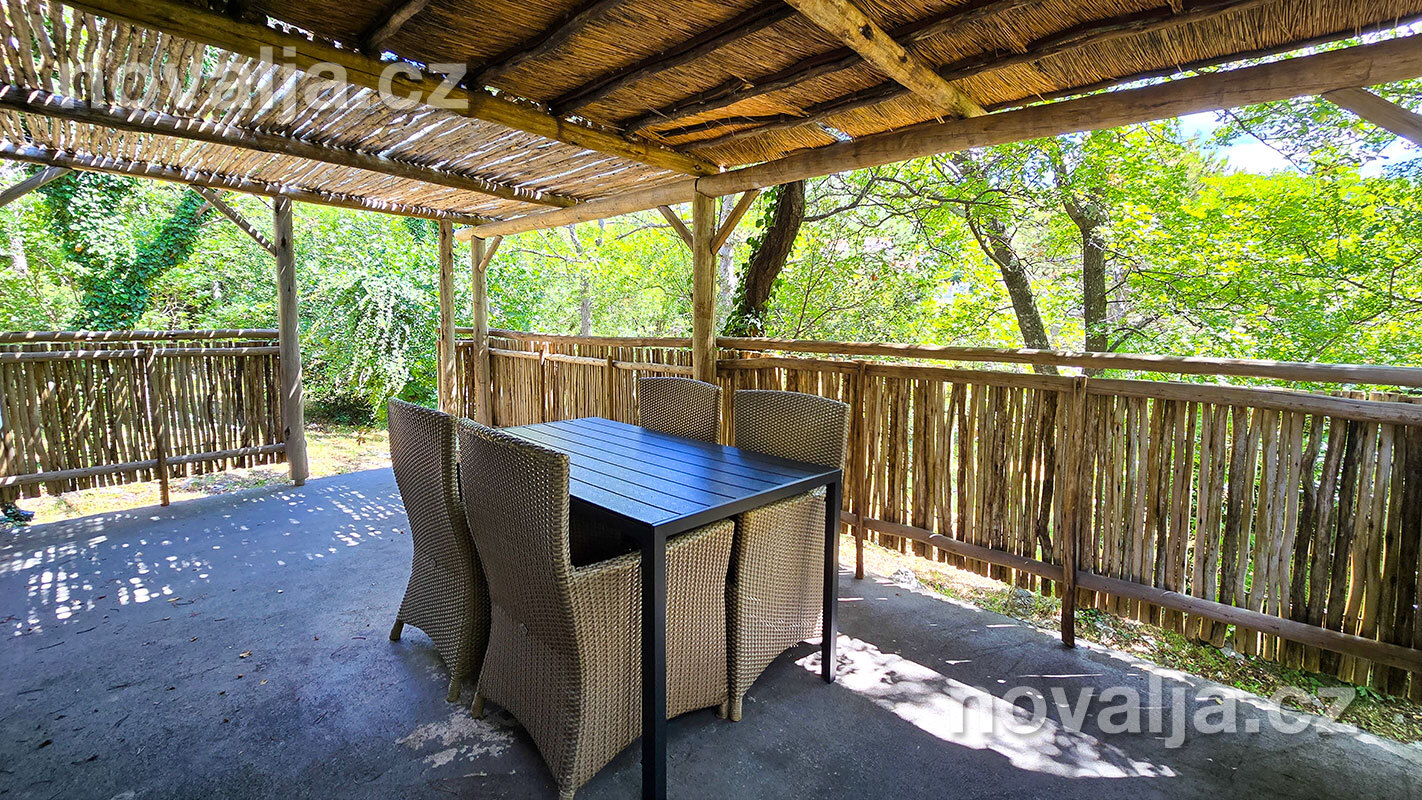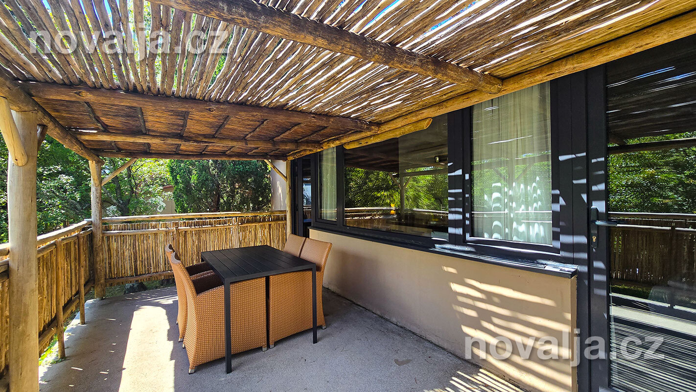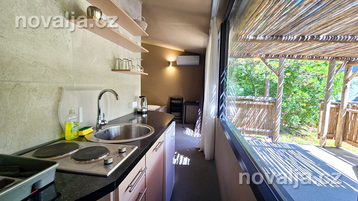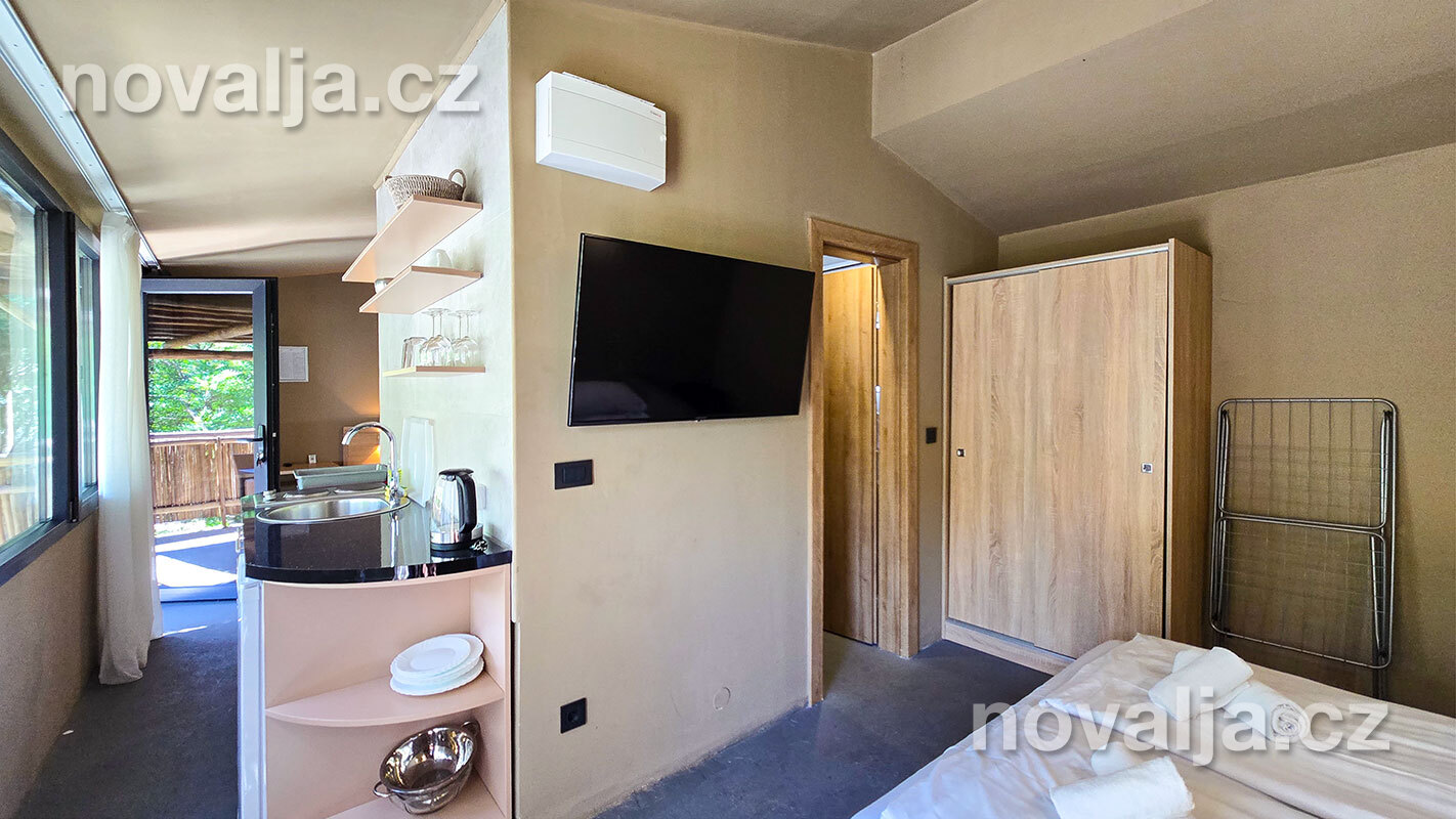 Studio (jeden otevřený prostor) - jedna místnost se dvěma lůžky (200 x 160 cm), druhá s rozkládacím gaučem pro 1-2 osoby (190 x 160 cm) - neodděleno dveřmi, vybavený kuchyňský kout (elektrická varná deska, lednička, varná konvice), LCD TV, sociální zařízení se sprchovým koutem a WC, fén, terasa se zahradním nábytkem. Klimatizace v prostoru s rozkládacím gaučem (v ceně).