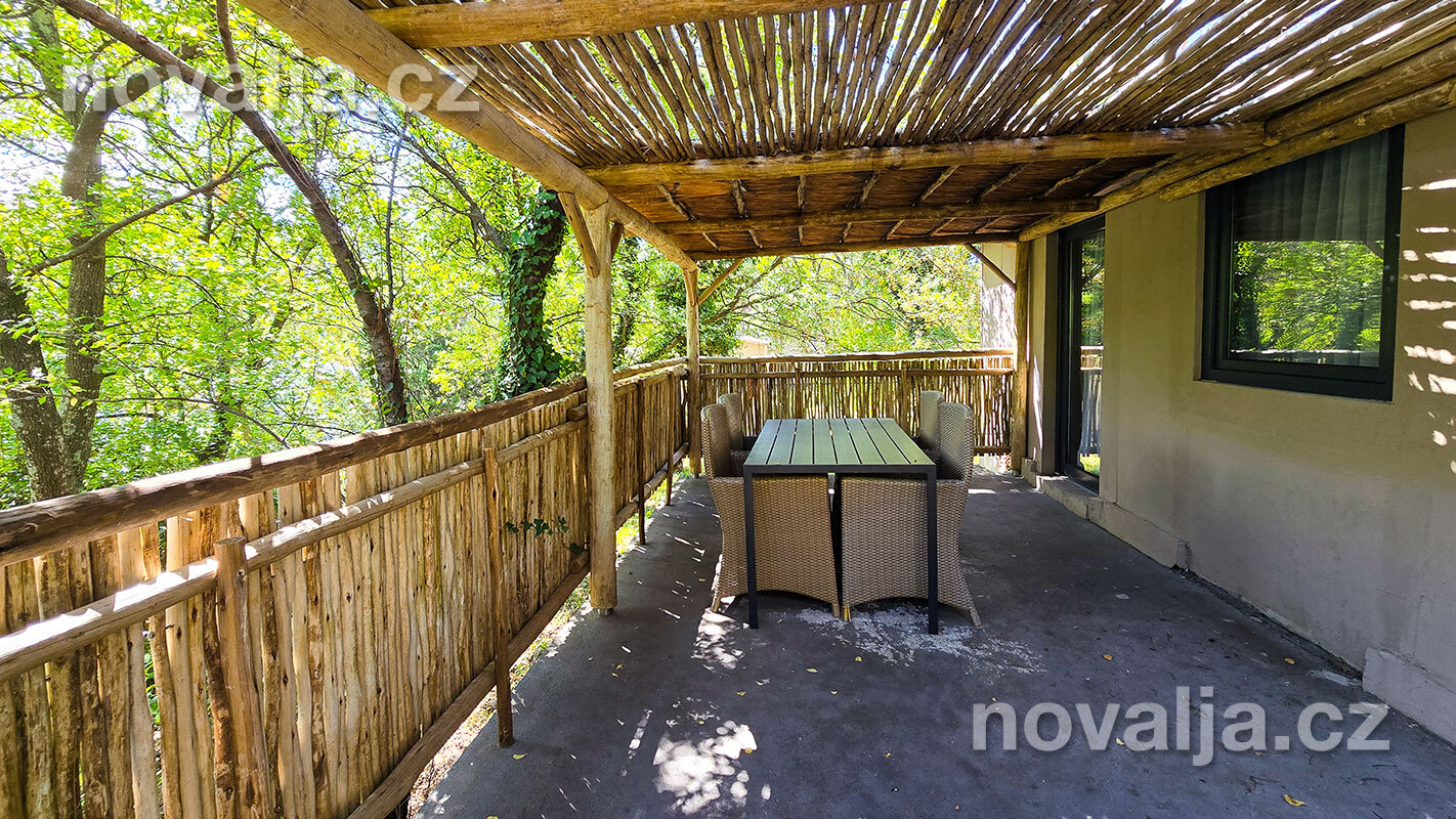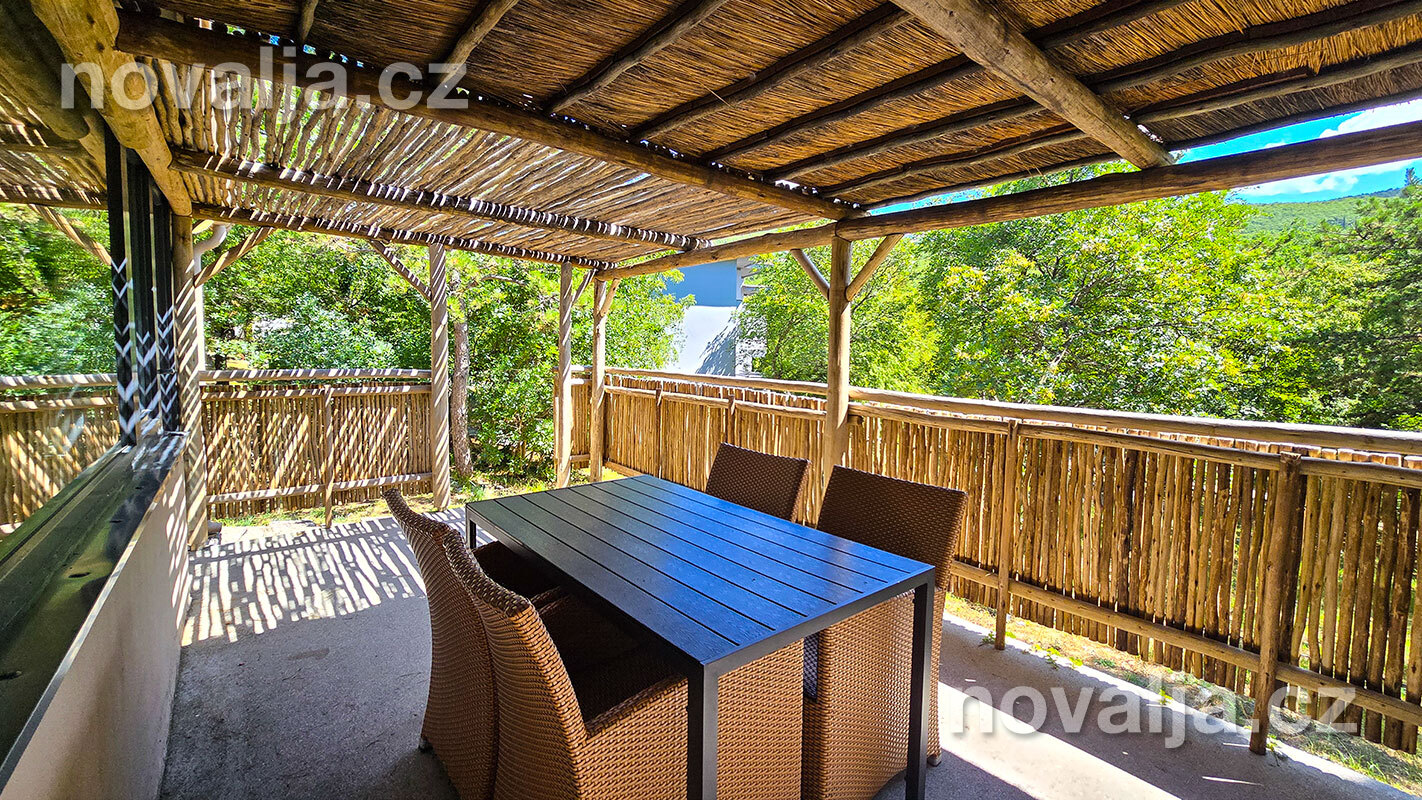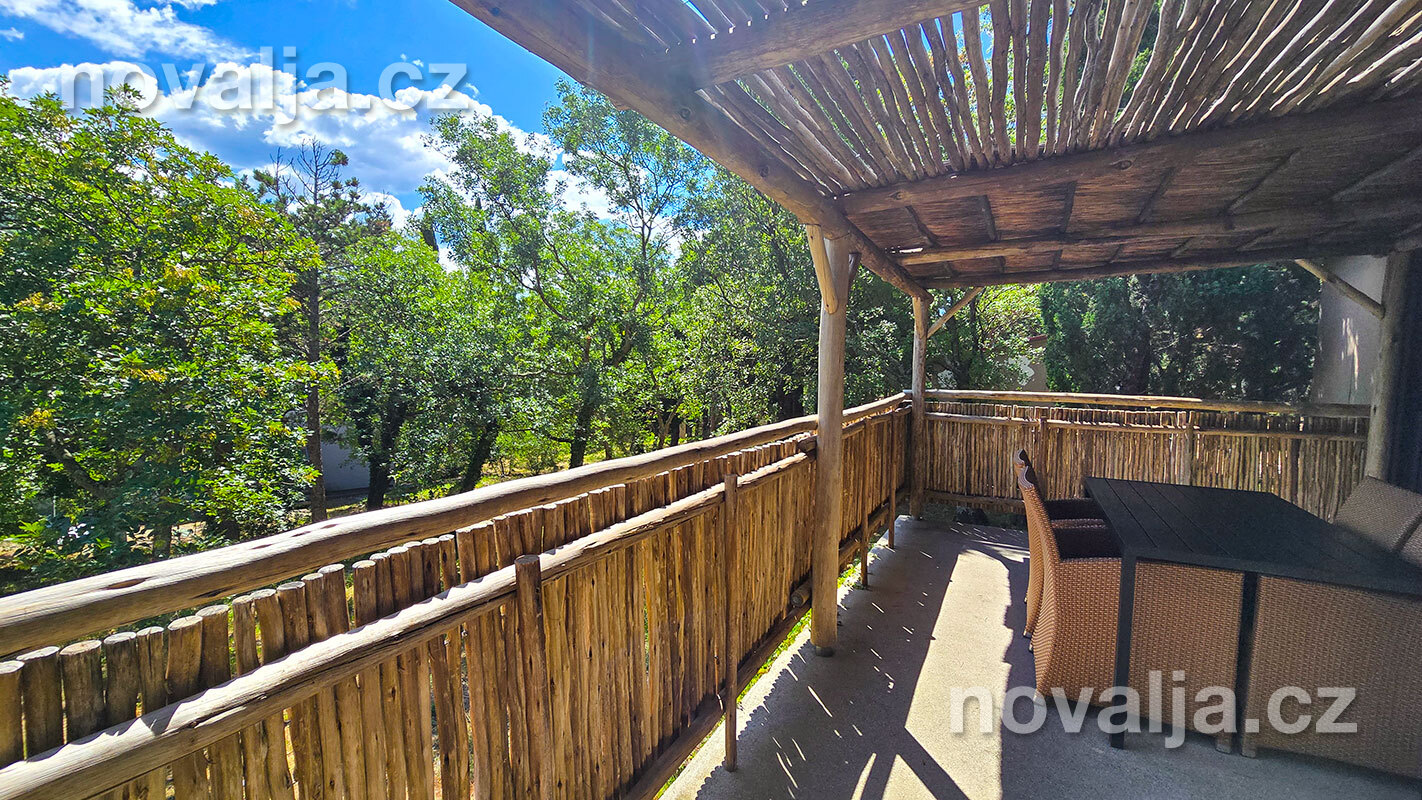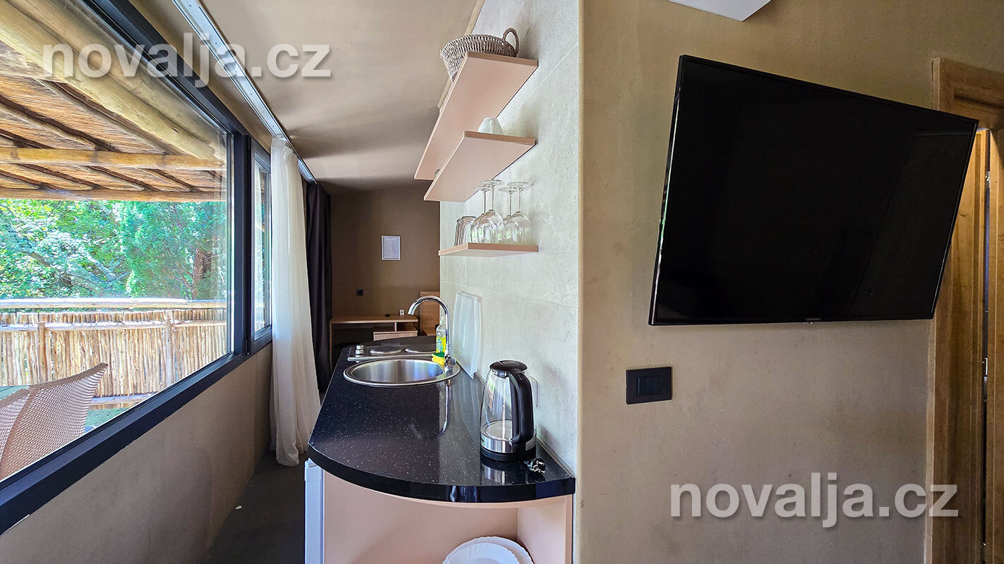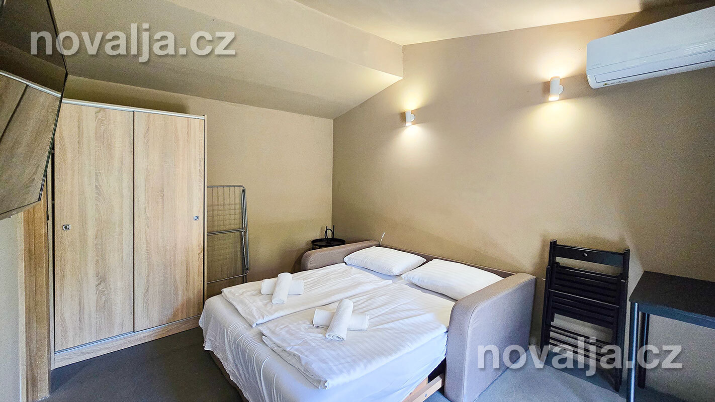 Studio (jeden otevřený prostor) - jedna místnost se dvěma lůžky (200 x 160 cm), druhá s rozkládacím gaučem pro 1-2 osoby (190 x 160 cm) - neodděleno dveřmi, vybavený kuchyňský kout (elektrická varná deska, lednička, varná konvice), LCD TV, sociální zařízení se sprchovým koutem a WC, fén, terasa se zahradním nábytkem. Klimatizace v prostoru s rozkládacím gaučem (v ceně).