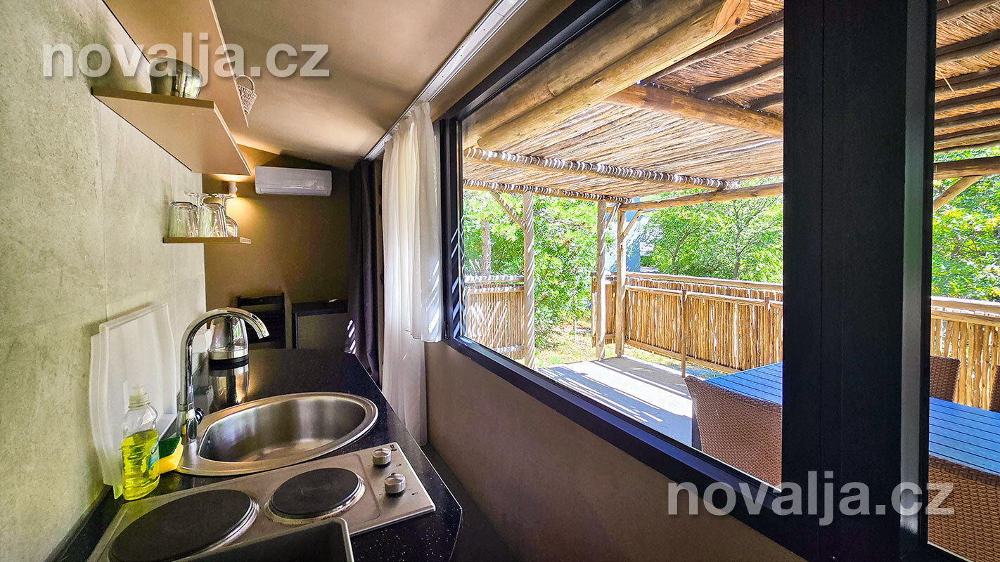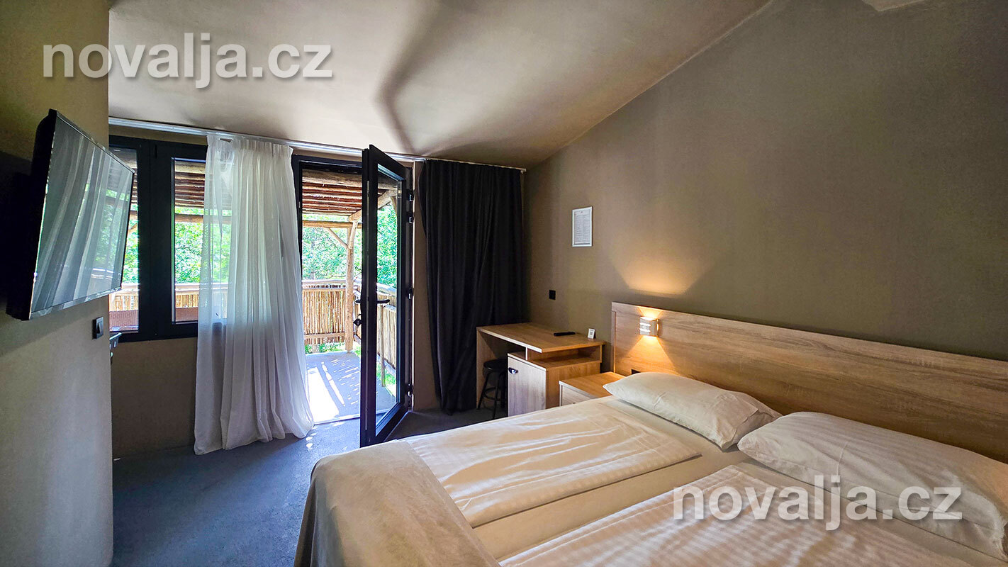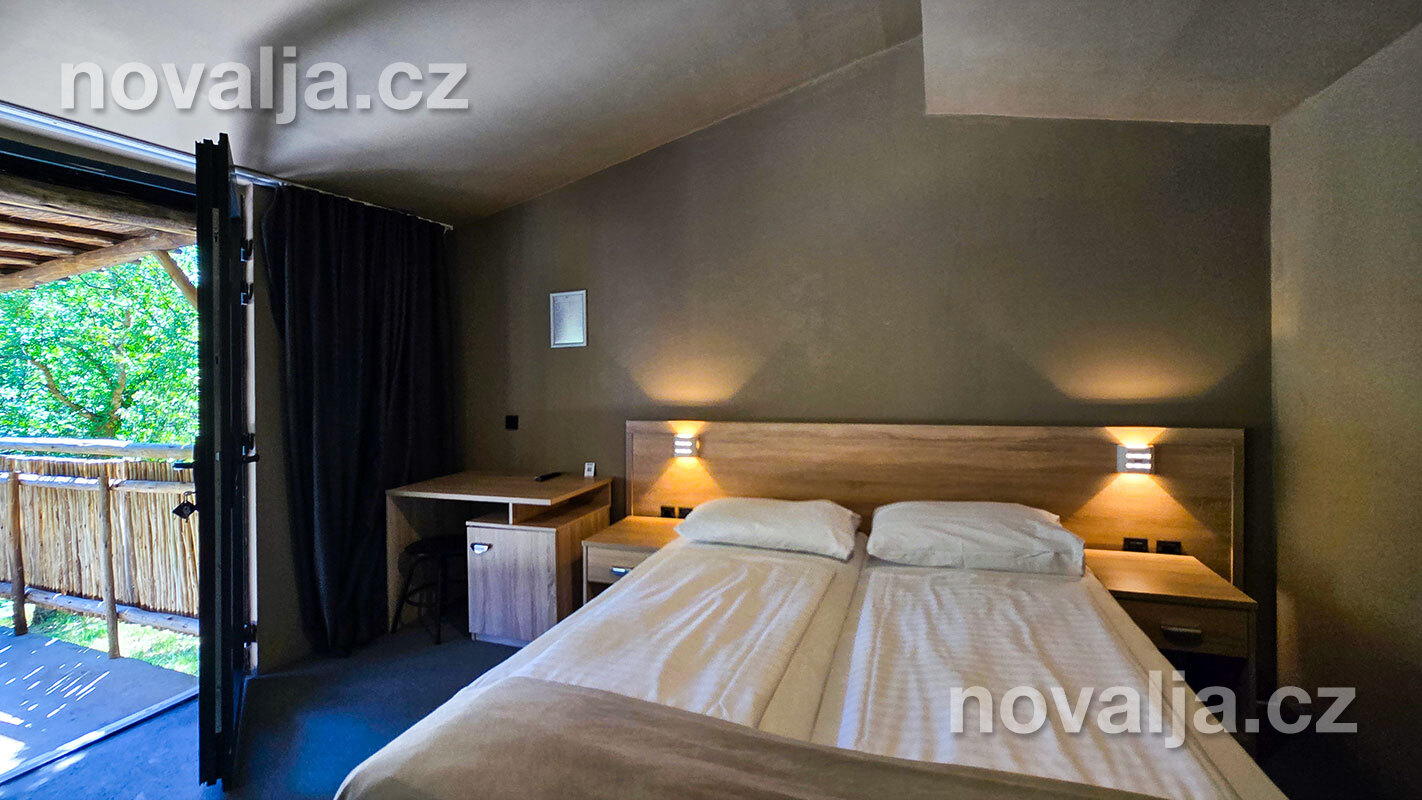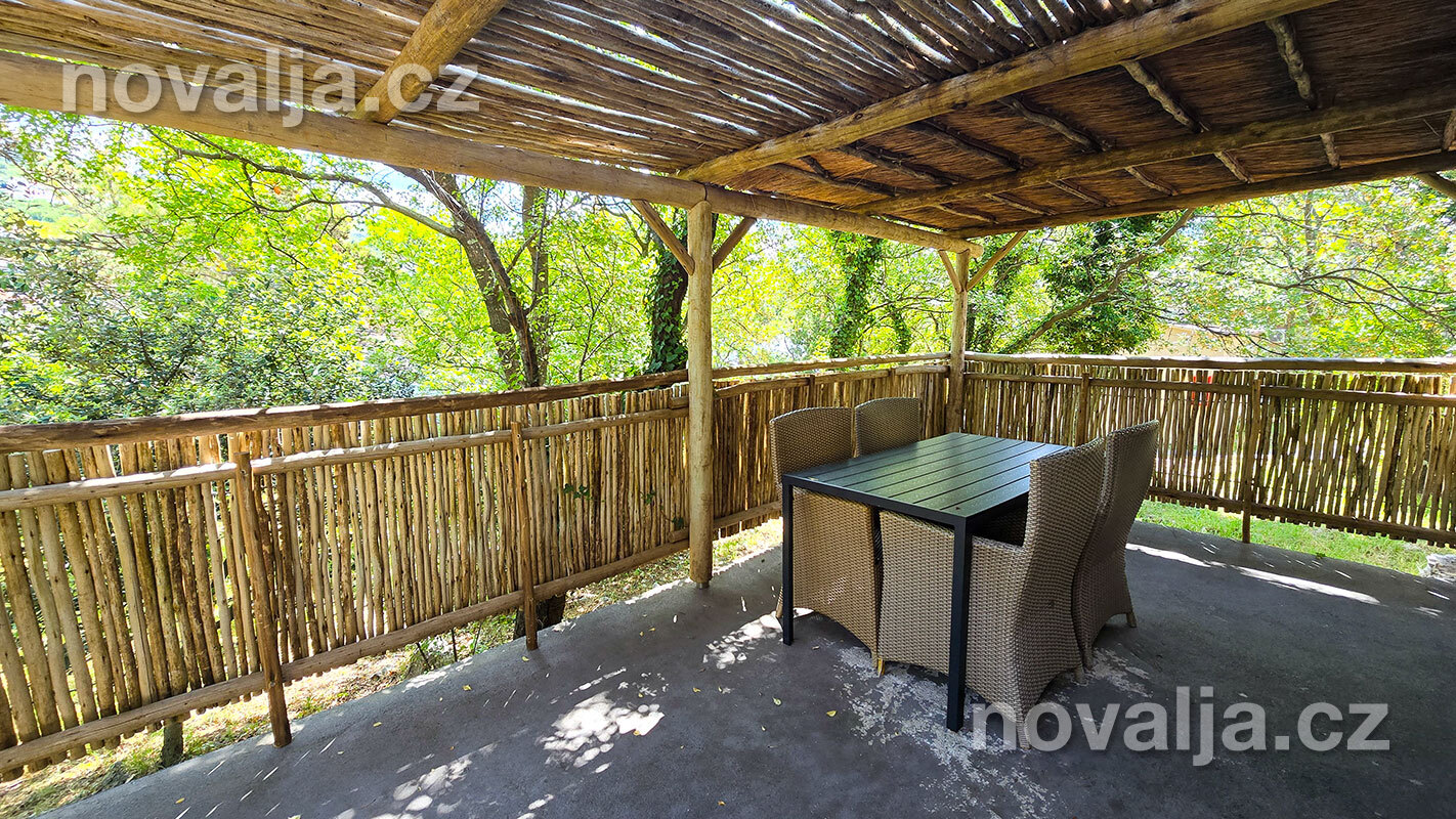 Studio (jeden otevřený prostor) - jedna místnost se dvěma lůžky (200 x 160 cm), druhá s rozkládacím gaučem pro 1-2 osoby (190 x 160 cm) - neodděleno dveřmi, vybavený kuchyňský kout (elektrická varná deska, lednička, varná konvice), LCD TV, sociální zařízení se sprchovým koutem a WC, fén, terasa se zahradním nábytkem. Klimatizace v prostoru s rozkládacím gaučem (v ceně).