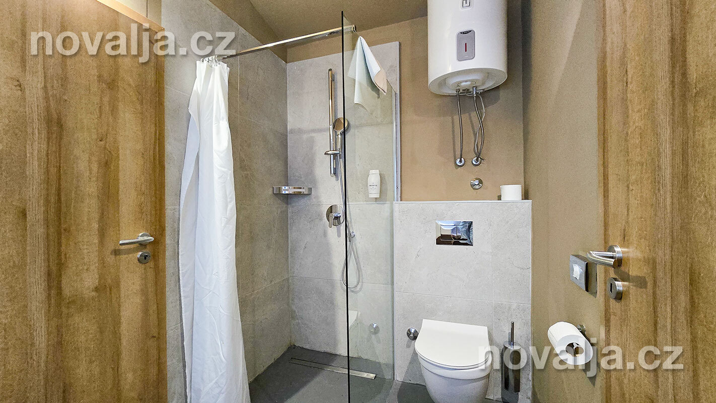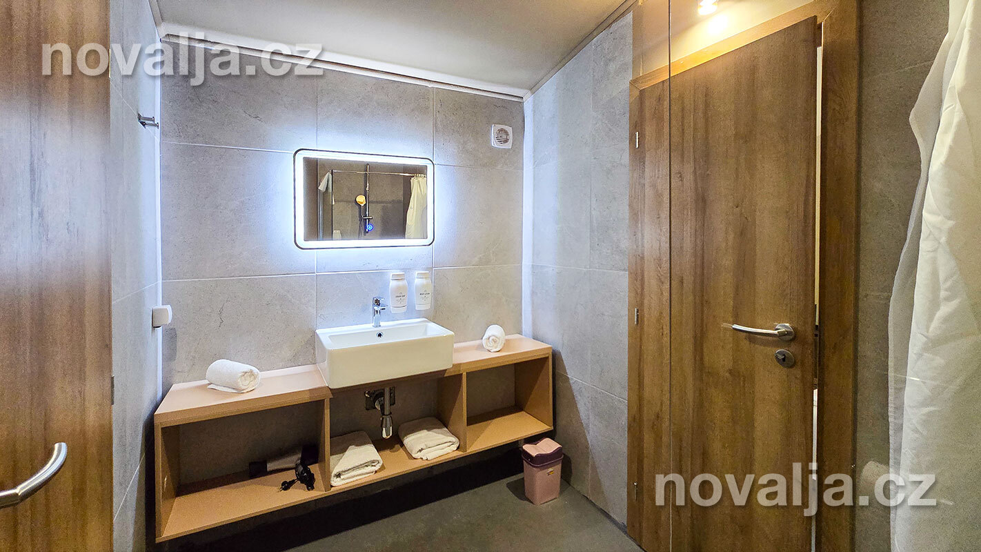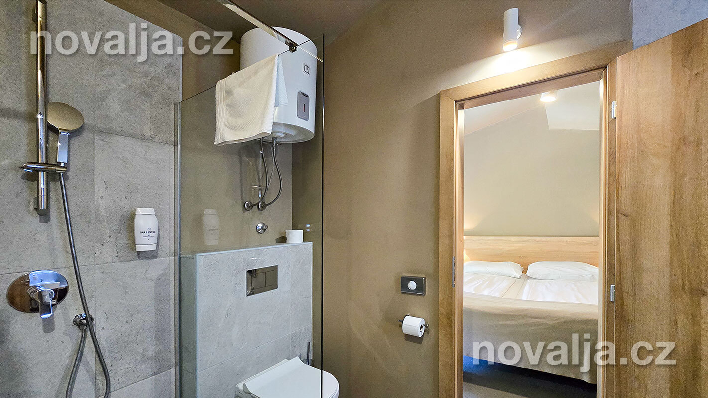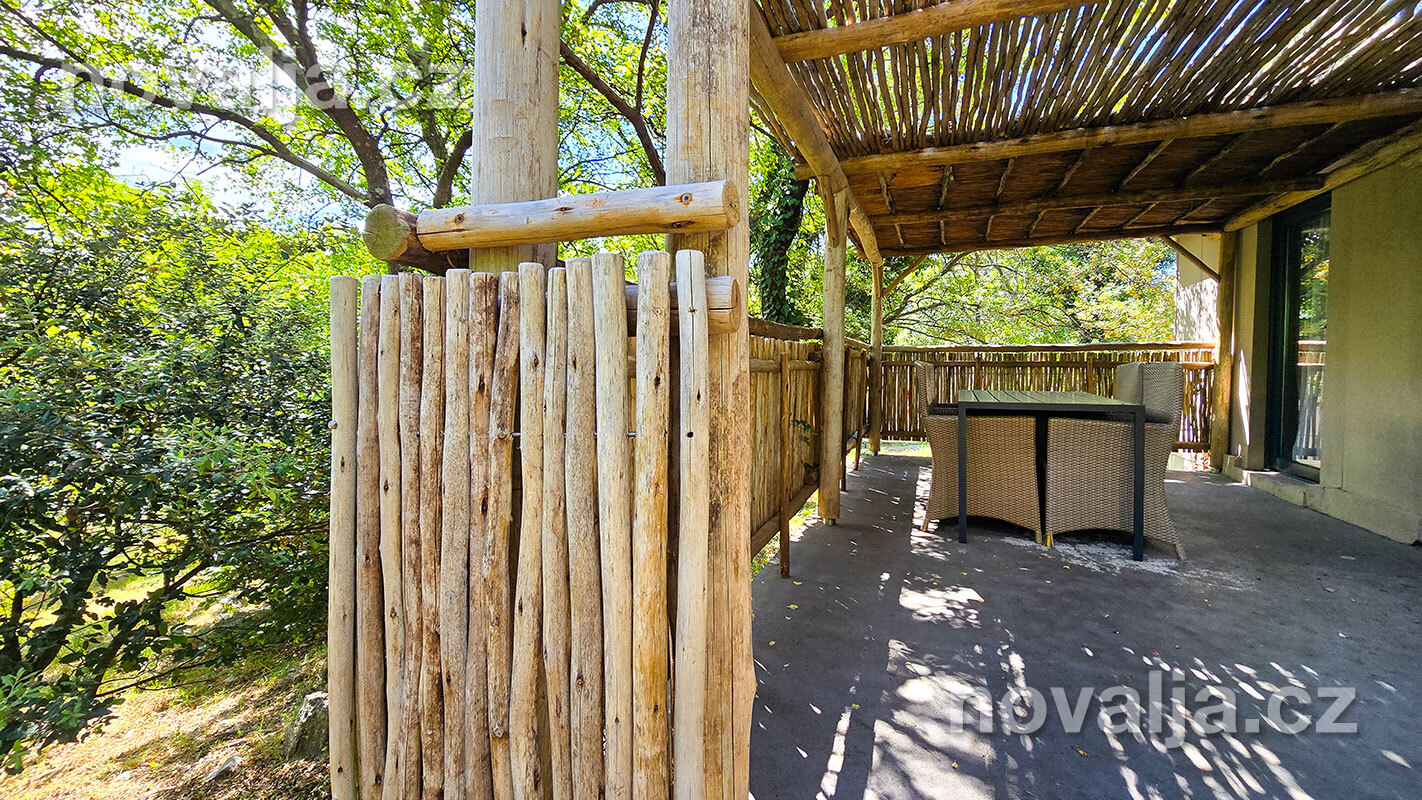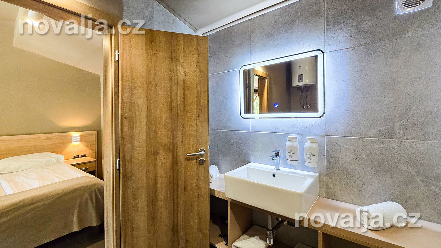 Studio (jeden otevřený prostor) - jedna místnost se dvěma lůžky (200 x 160 cm), druhá s rozkládacím gaučem pro 1-2 osoby (190 x 160 cm) - neodděleno dveřmi, vybavený kuchyňský kout (elektrická varná deska, lednička, varná konvice), LCD TV, sociální zařízení se sprchovým koutem a WC, fén, terasa se zahradním nábytkem. Klimatizace v prostoru s rozkládacím gaučem (v ceně).