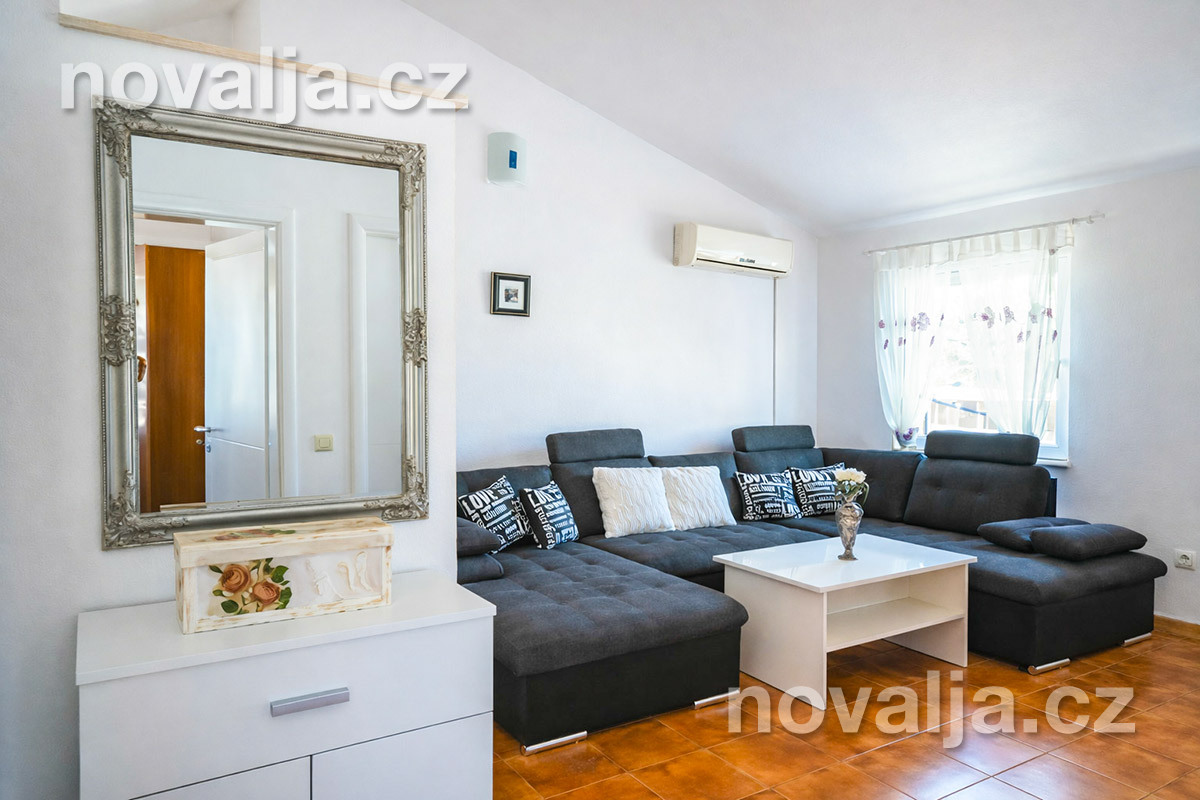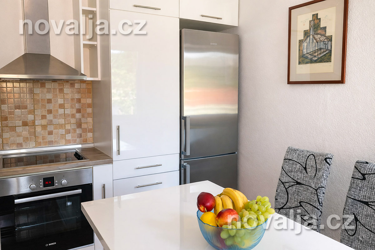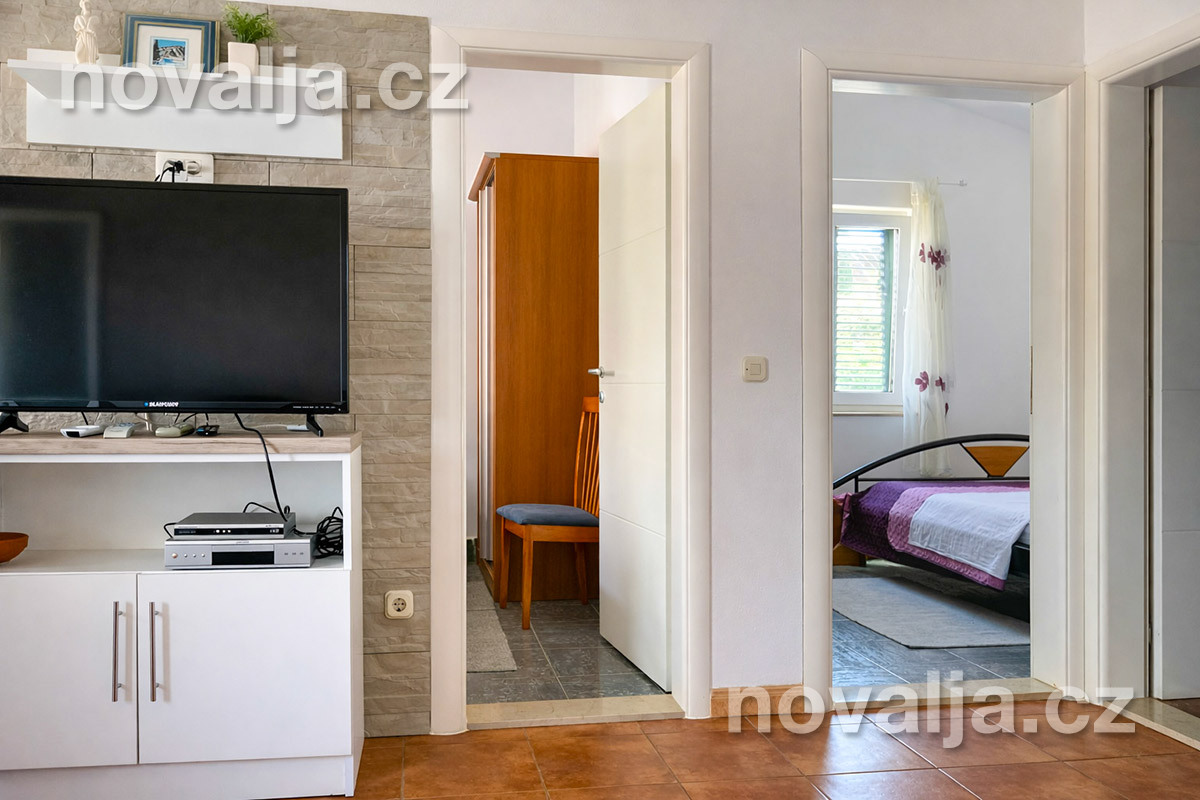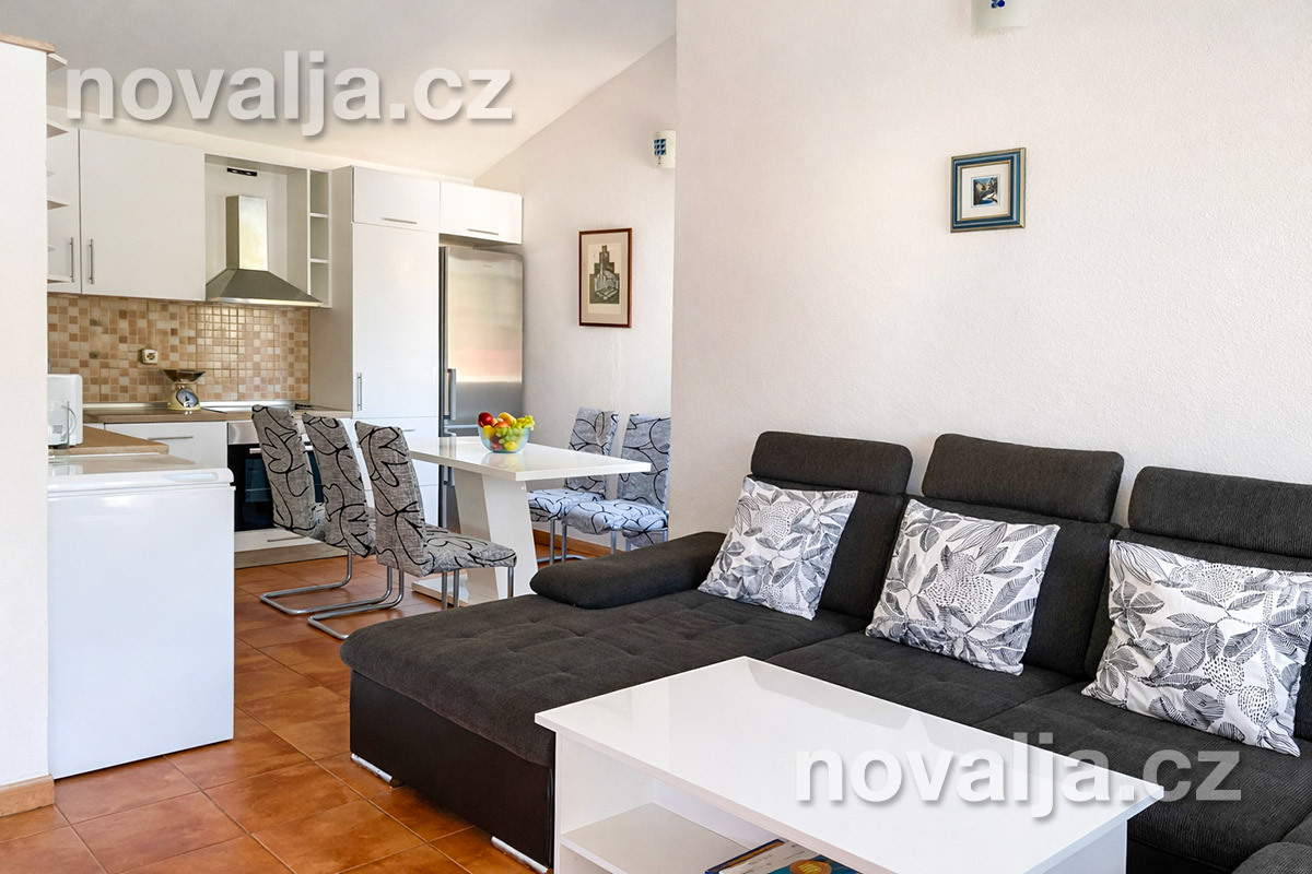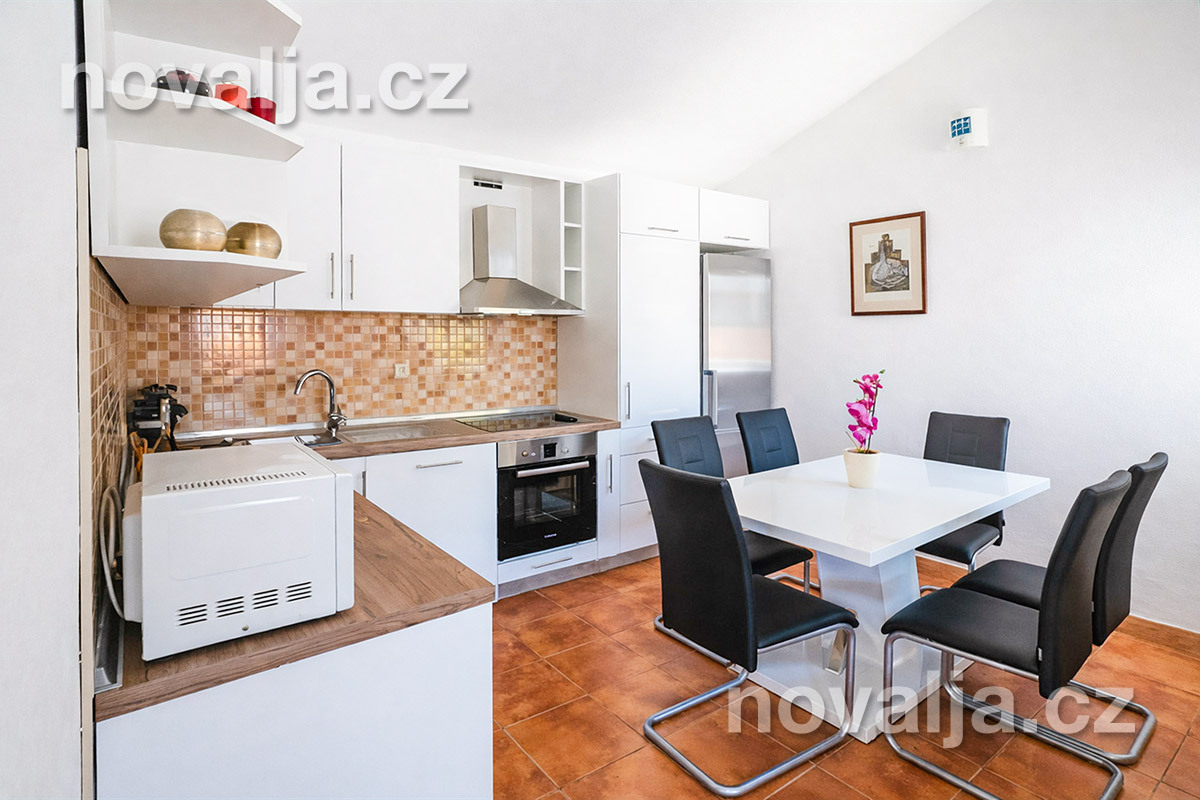 2 ložnice se dvěma lůžky, vybavená kuchyň (indukční varná deska, lednička, mrazák, myčka, trouba, mikrovlnná trouba, varná konvice), obývací prostor s rozkládacím gaučem pro 1 dítě, sociální zařízení se sprchovým koutem a WC, terasa s krásným výhledem na moře. Technická místnost s pračkou.
