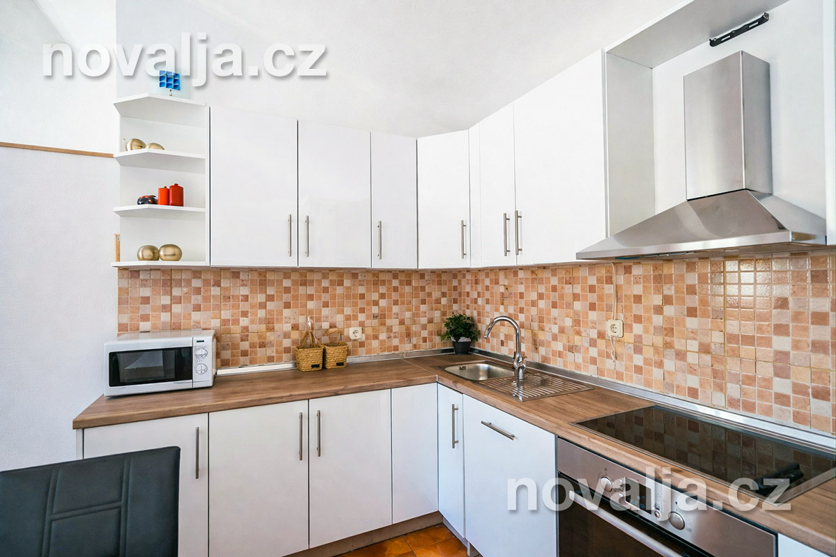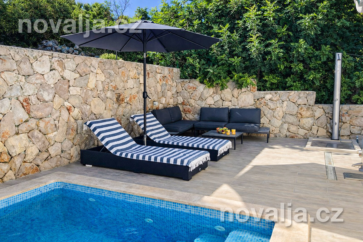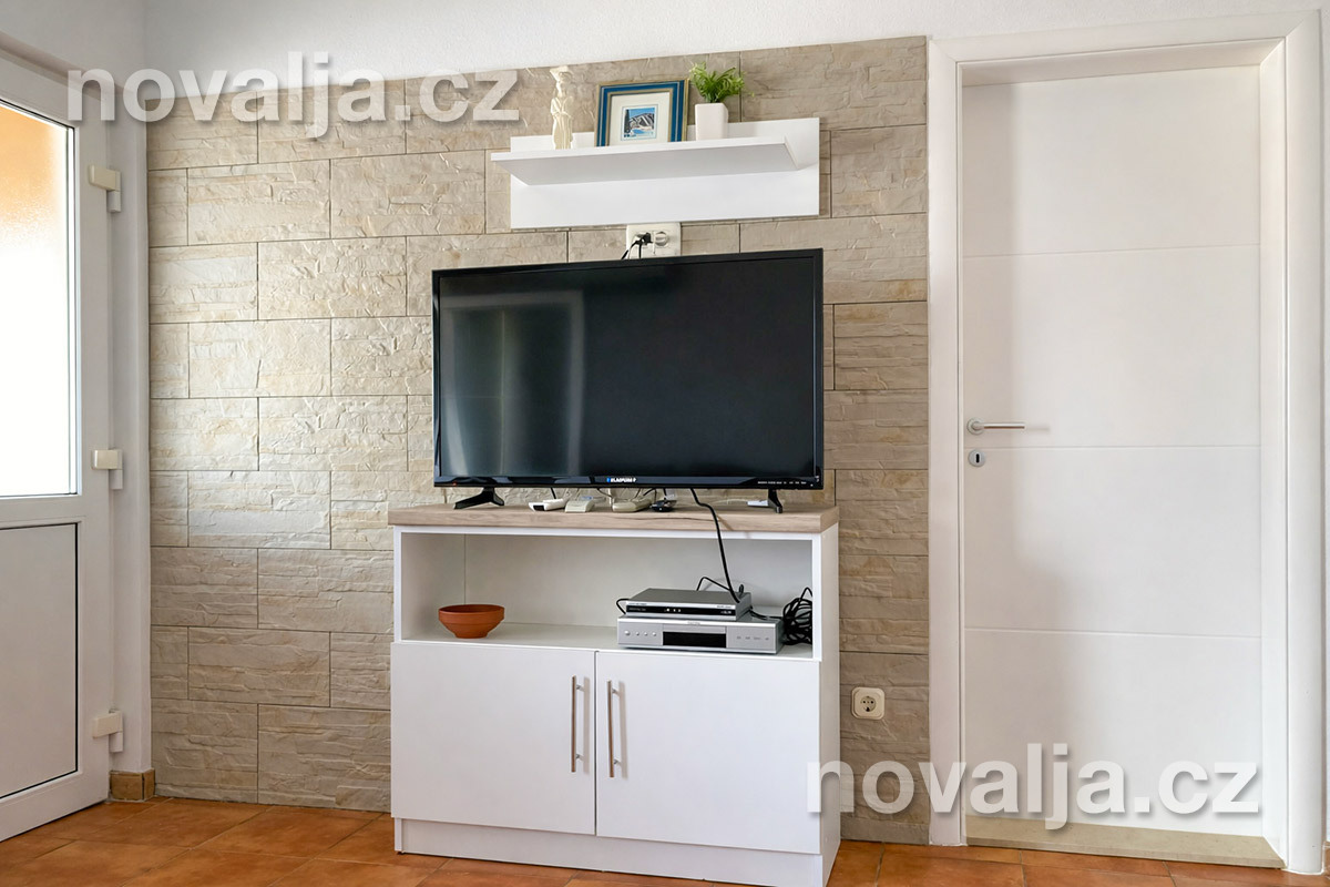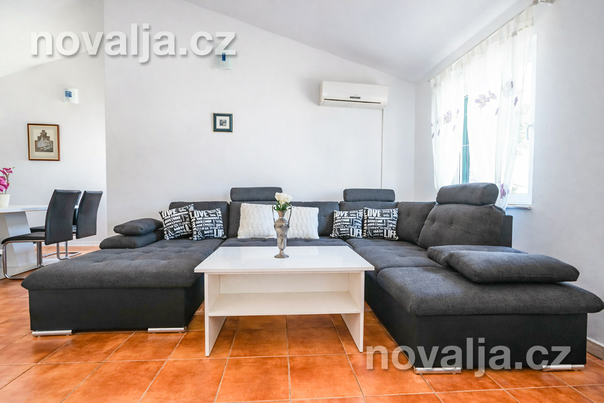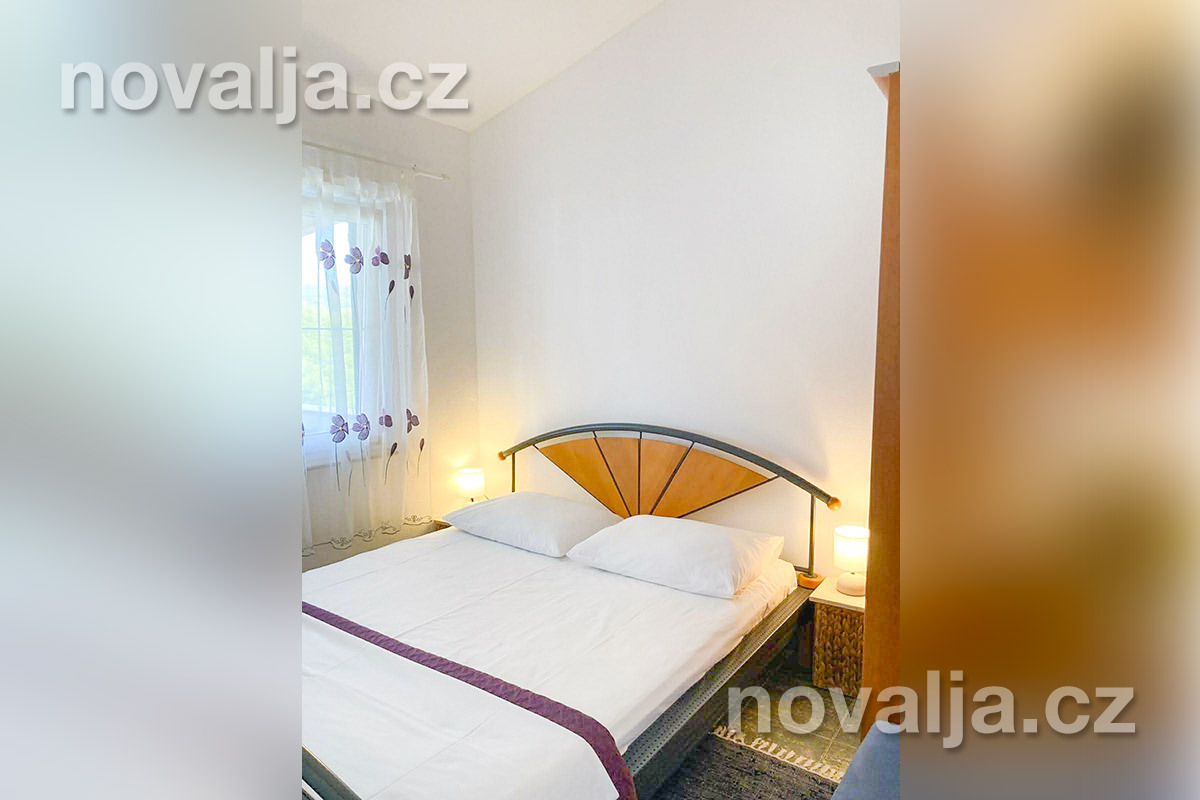 2 ložnice se dvěma lůžky, vybavená kuchyň (indukční varná deska, lednička, mrazák, myčka, trouba, mikrovlnná trouba, varná konvice), obývací prostor s rozkládacím gaučem pro 1 dítě, sociální zařízení se sprchovým koutem a WC, terasa s krásným výhledem na moře. Technická místnost s pračkou.