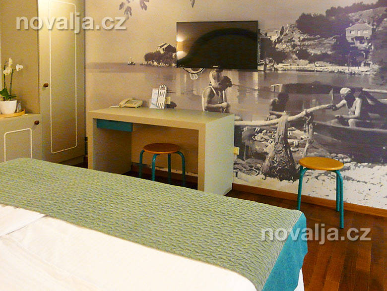 2 lůžka, TV+SAT, malá lednička, sociální zařízení se sprchovým koutem a WC, sejf, fén na vlasy, balkón s bočním výhledem na moře, klimatizace (v ceně).
