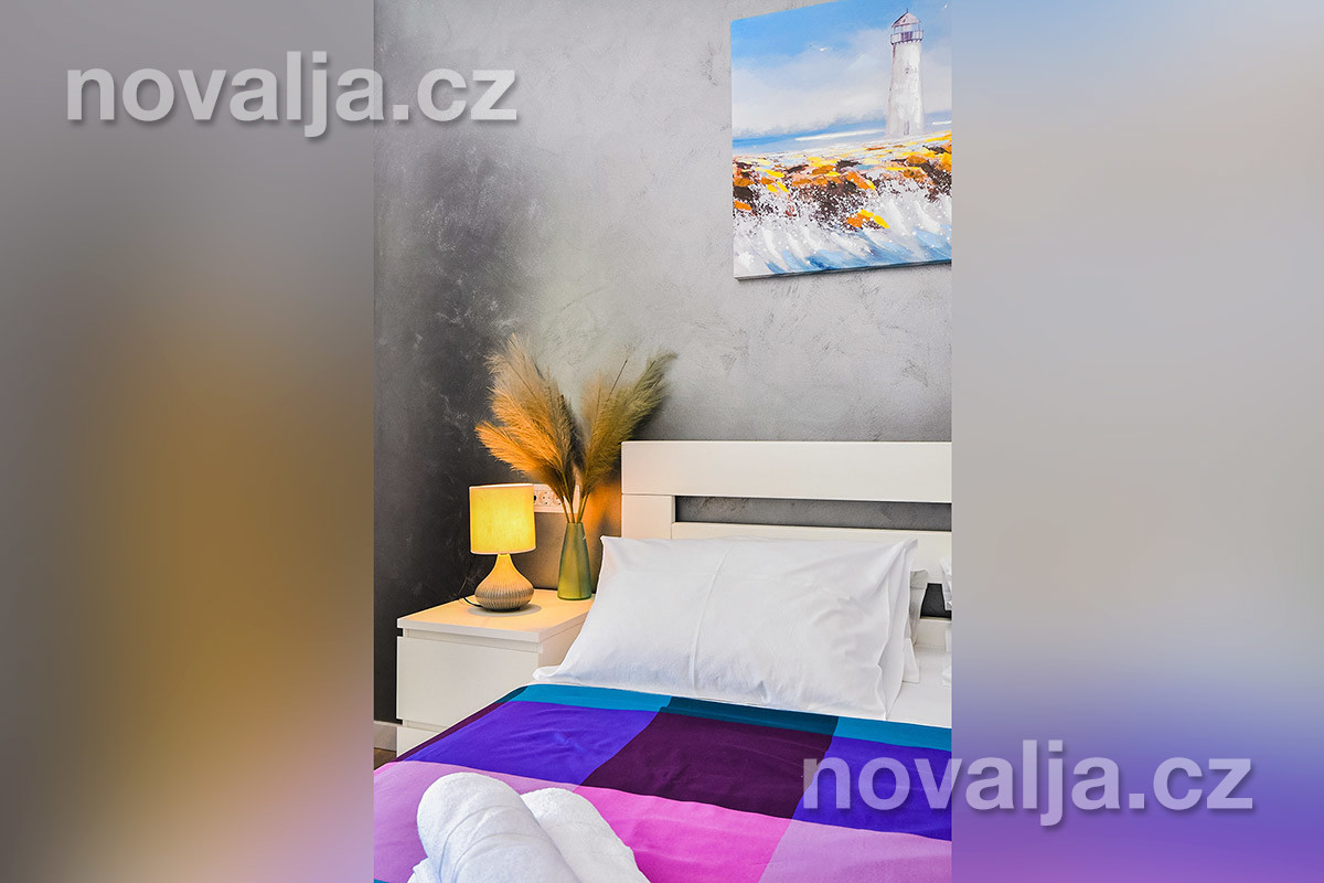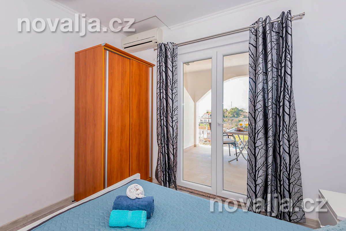 2 ložnice se dvěma lůžky, v jedné ložnici je navíc rozkládací křeslo pro 1 osobu, jedna z ložnic nemá dveře (jen otevřený prostor do kuchyně), vybavená kuchyň (lednička, mrazák, myčka, mikrovlnná trouba, varná konvice), LCD TV+SAT, sociální zařízení se sprchovým koutem a WC, terasa s výhledem na moře. Klimatizace v ložnici (v ceně).