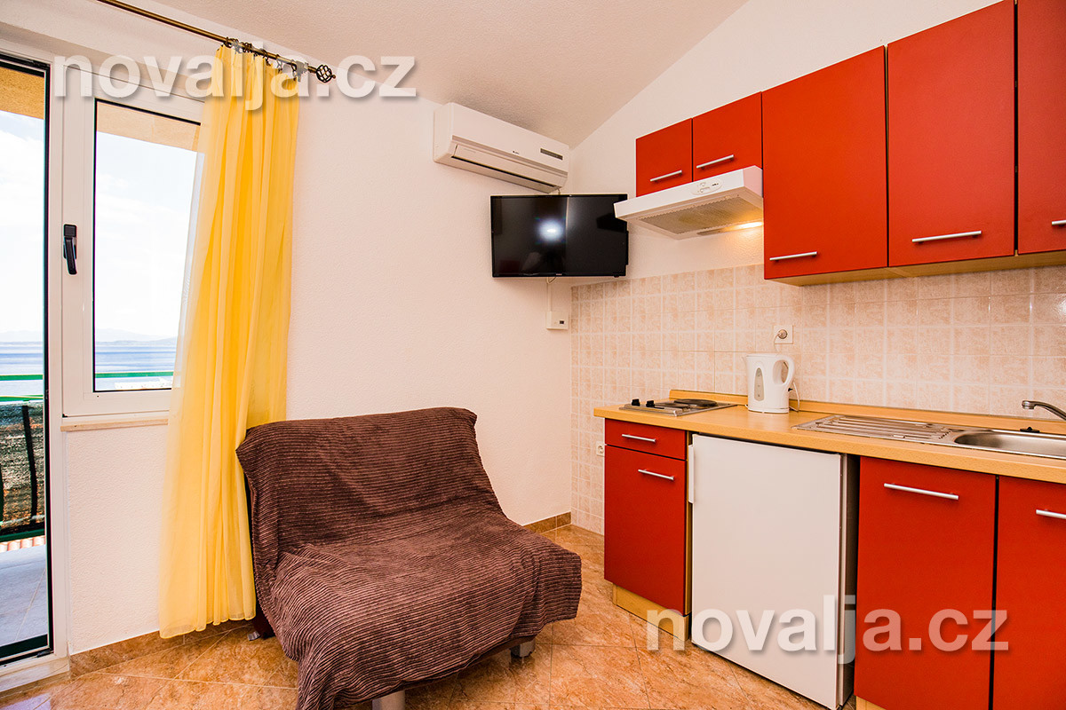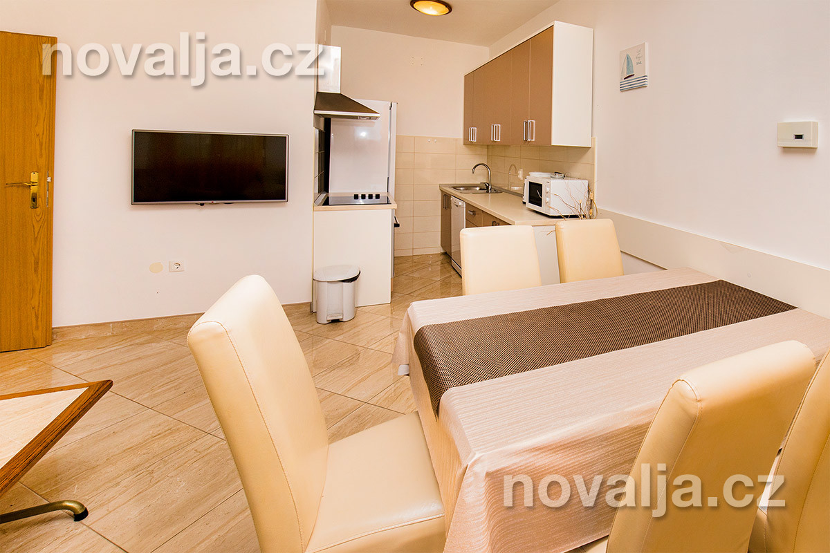 2 ložnice se dvěma lůžky, v jedné ložnici je navíc malý rozkládací gauč pro 1 dítě do 12 let (200 x 80 cm), vybavená kuchyň (lednička, mrazák, varná konvice, mikrovlnná trouba, kávovar, myčka, žehlička, žehlicí prkno) s rozkládacím gaučem (200 x 160 cm) buď pro 2 děti do 12 let, nebo jen 1 osobu starší 12 let, TV+SAT, 2x sociální zařízení se sprchovým koutem a WC, fén, balkón s částečným výhledem na moře. Klimatizace v kuchyni (v ceně).