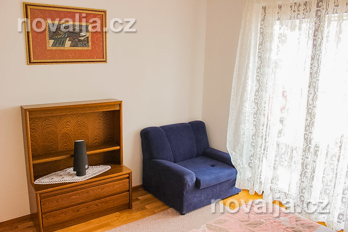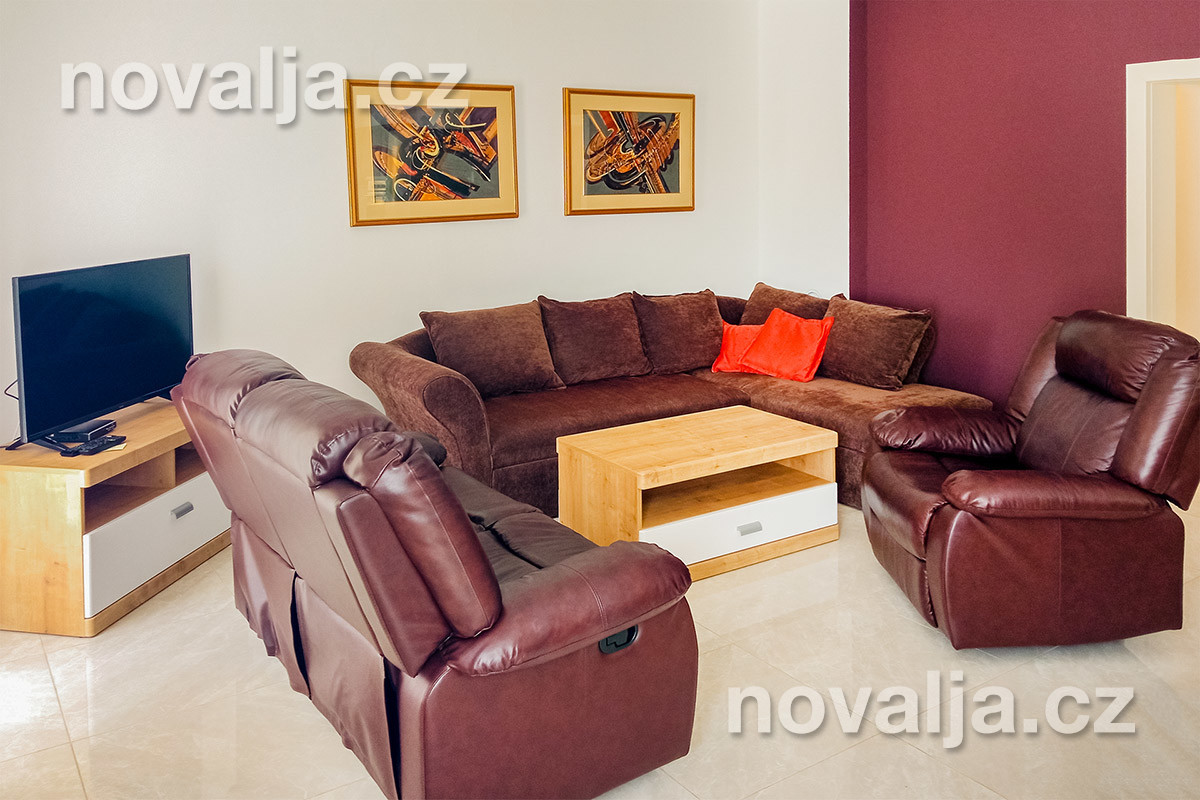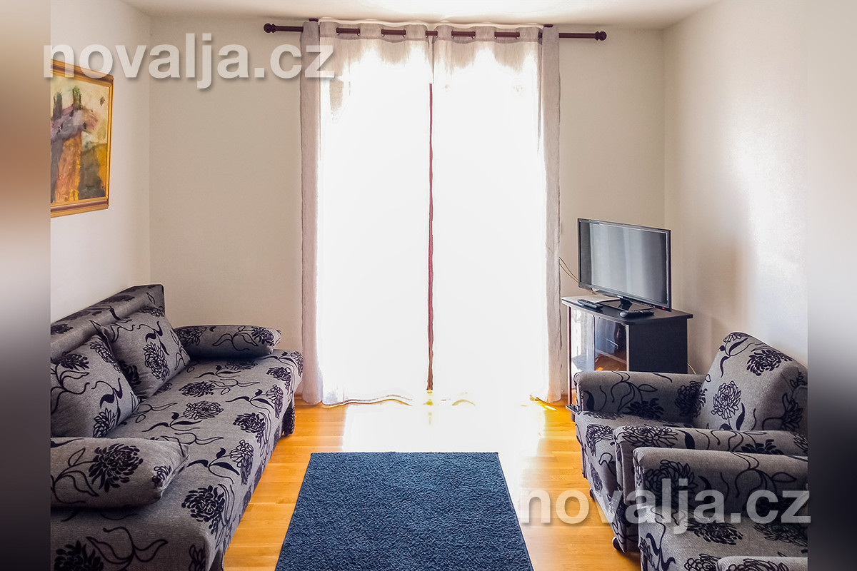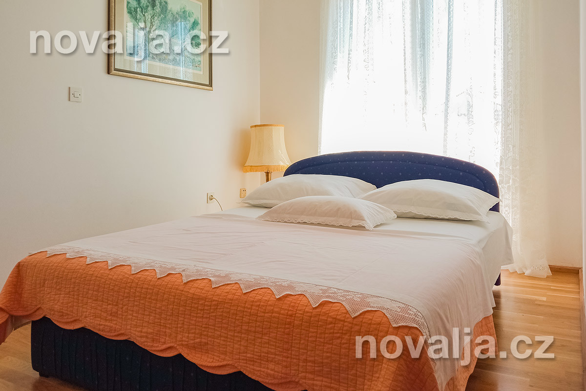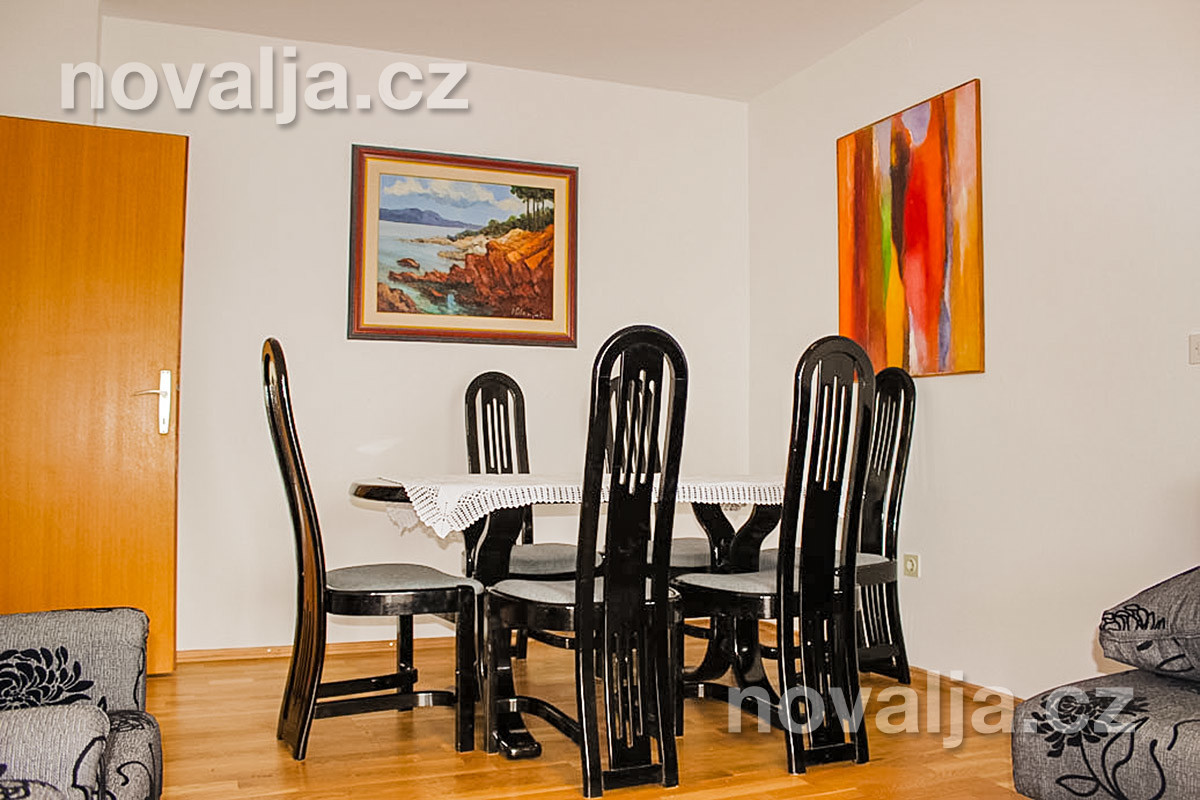 3 ložnice se dvěma lůžky, vybavená kuchyň (lednička, mrazák, trouba, myčka, kávovar, varná konvice), obývací pokoj, TV+SAT, 3x sociální zařízení se sprchovým koutem a WC, pračka, dvě prostorné terasy s krásným výhledem na moře a na protilehlý ostrov Krk. Klimatizace v kuchyni a na chodbě (v ceně).