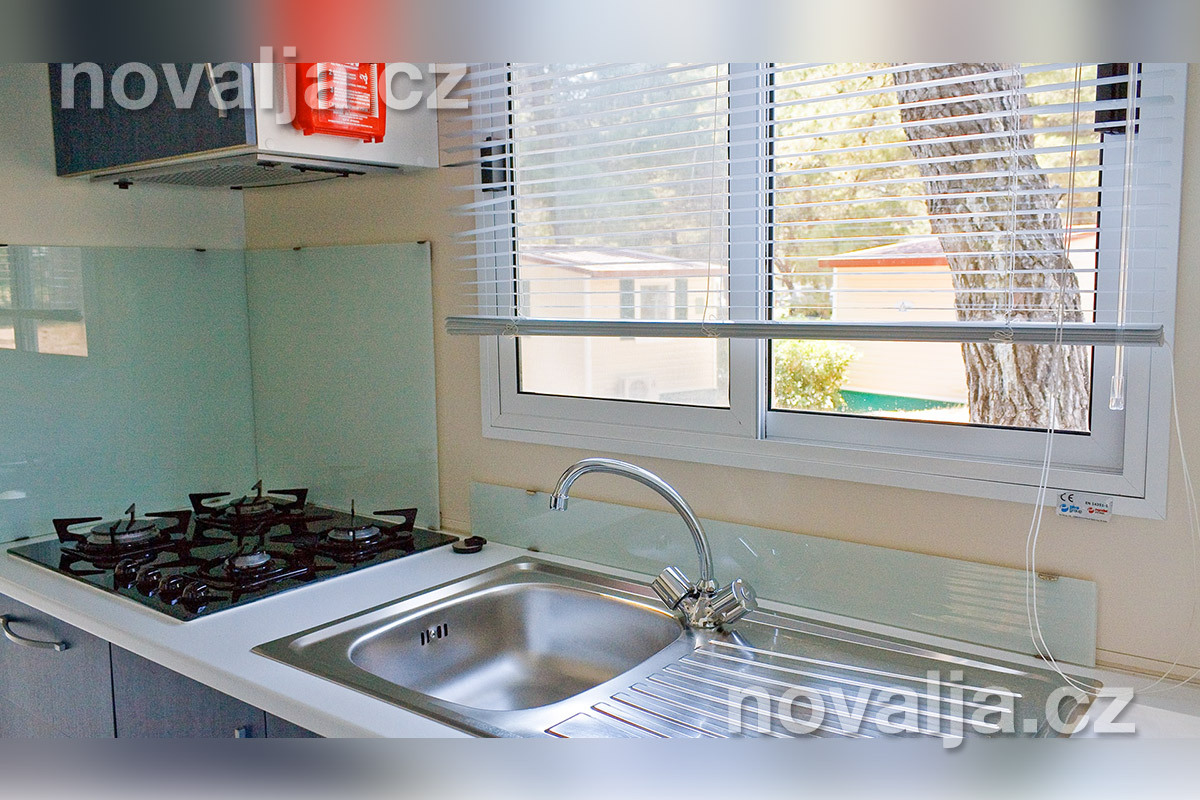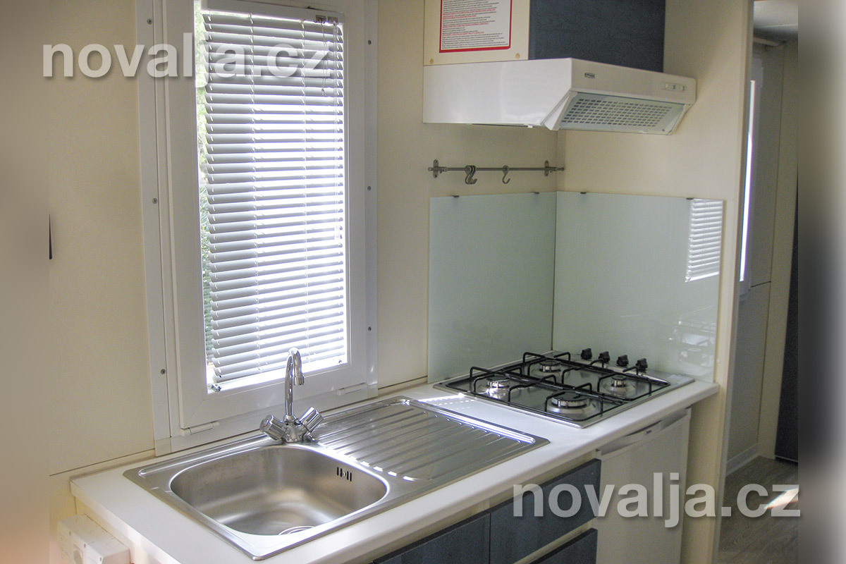 2 ložnice - jedna se dvěma lůžky, druhá se třemi lůžky (třetí lůžko na palandě), vybavená kuchyň (lednička, plynová varná deska, varná konvice, kávovar) s rozkládací pohovkou pro 1 osobu, sociální zařízení se sprchovým koutem a WC, fén, sejf, terasa se zahradním nábytkem a slunečníkem. Klimatizace v kuchyni (v ceně).