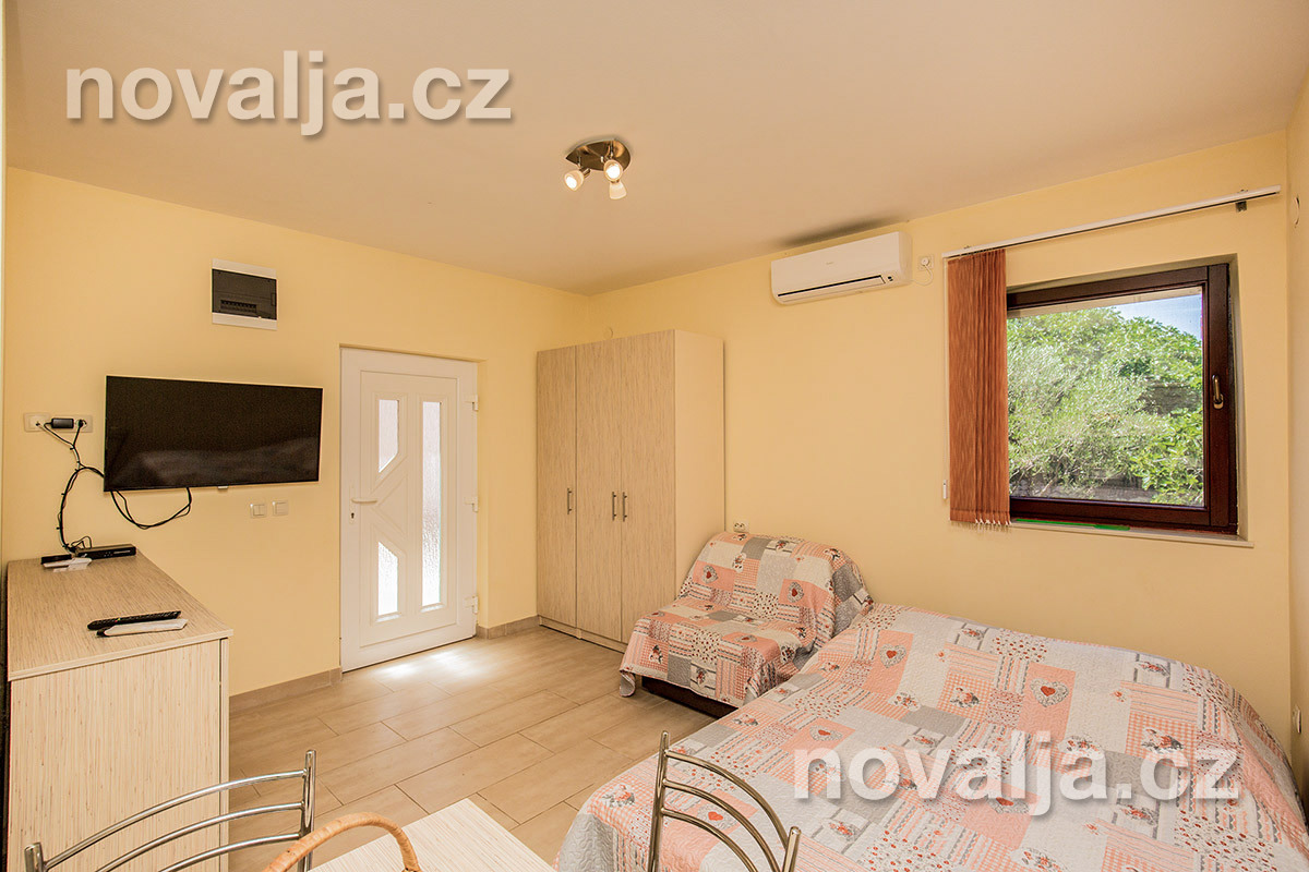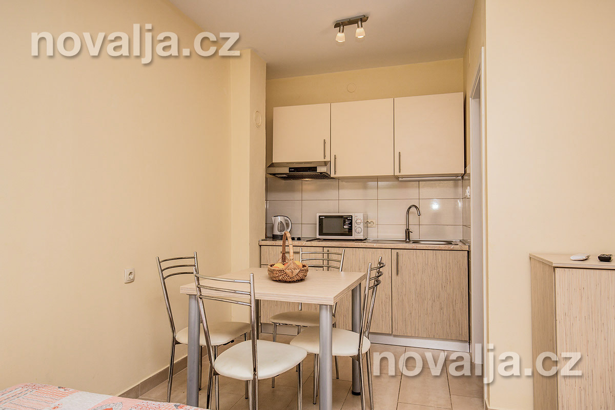 Studio (jedna místnost) se dvěma lůžky a s vybaveným kuchyňským koutem (lednička, mikrovlnná trouba, varná konvice), TV+SAT, sociální zařízení se sprchovým koutem a WC, fén, terasa. Klimatizace (v ceně).