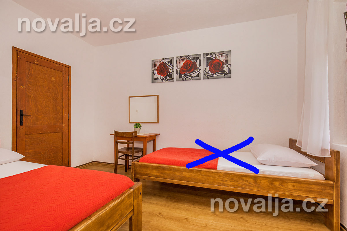 3 ložnice - dvě ložnice se dvěma lůžky, jedna se třemi lůžky, vybavená kuchyň (lednička, mrazák, trouba), 2x sociální zařízení se sprchovým koutem a WC, terasa. Bez klimatizace.