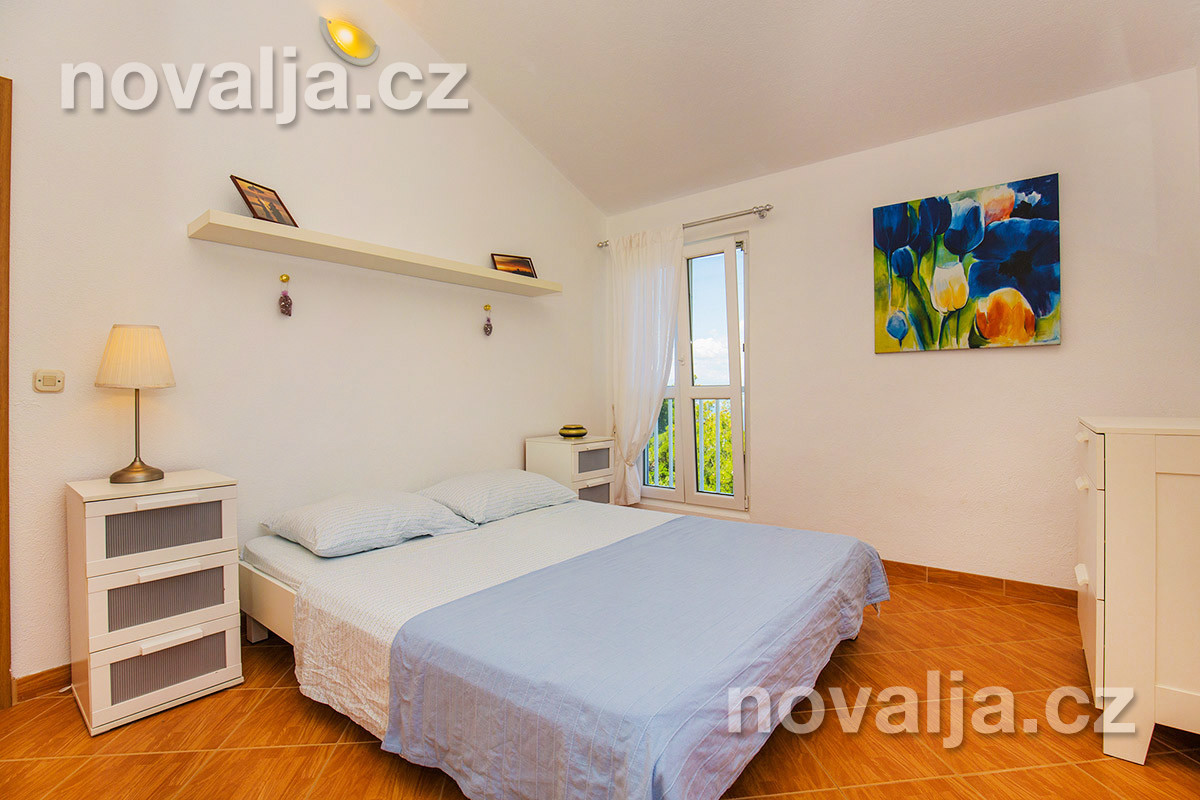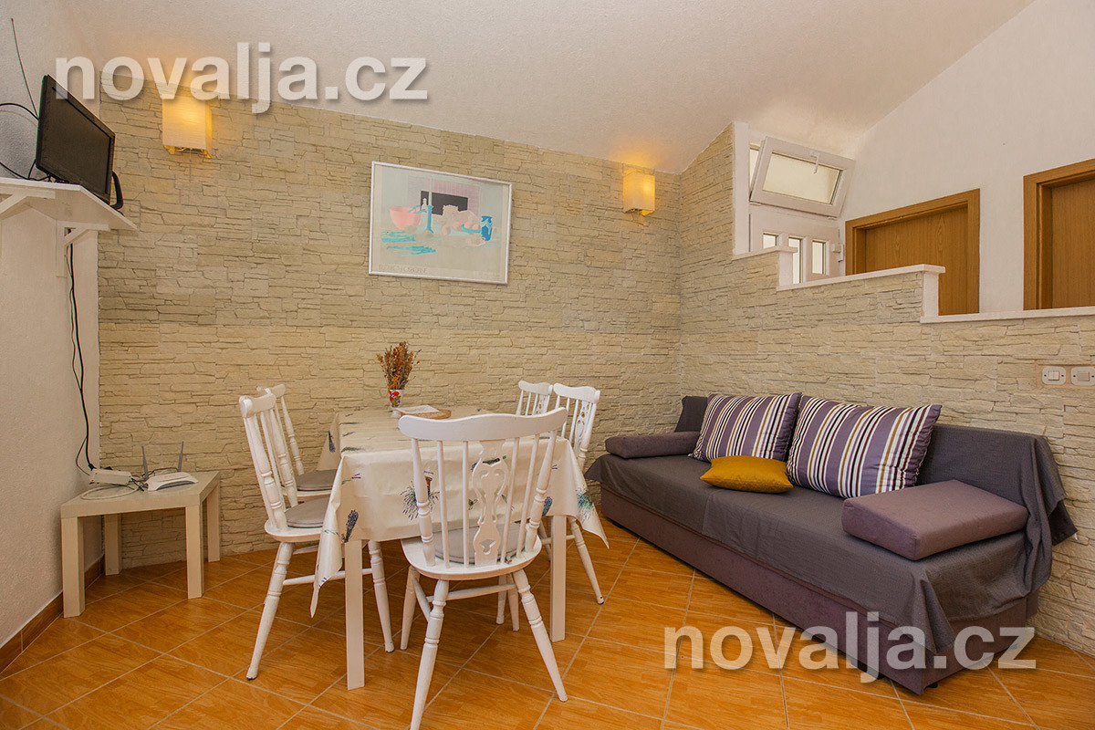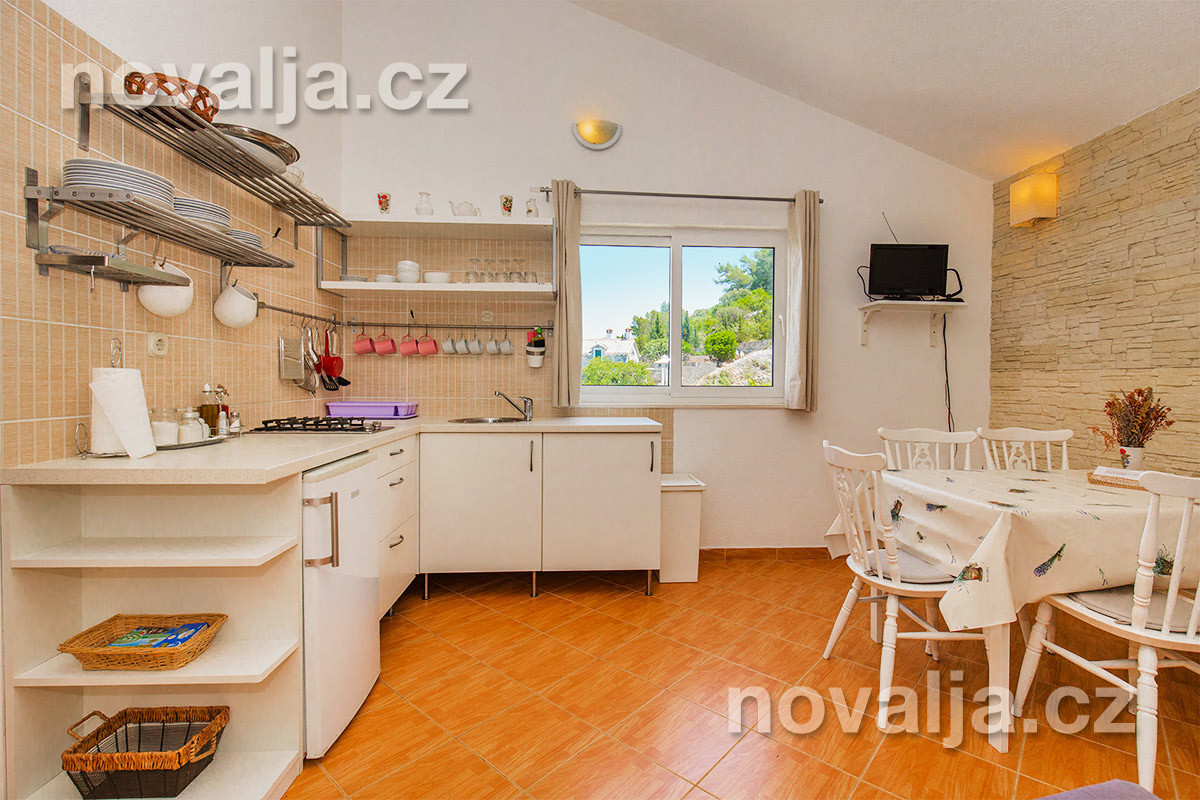 2 ložnice se dvěma lůžky, vybavená kuchyň (lednička) s rozkládacím gaučem pro 1 osobu, TV, sociální zařízení se sprchovým koutem a WC, další samostatné WC, terasa u domu (vně apartmánu) s výhledem na moře. Bez klimatizace.