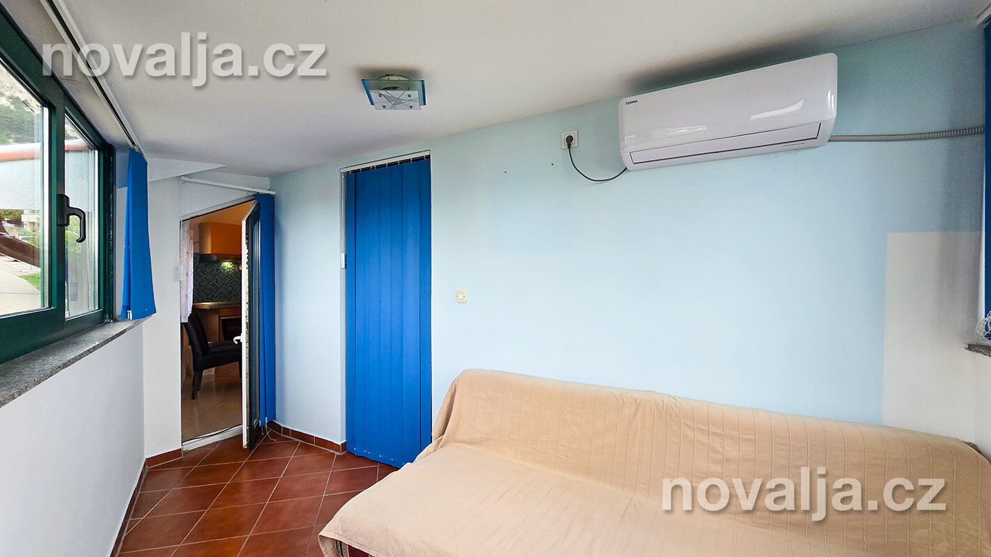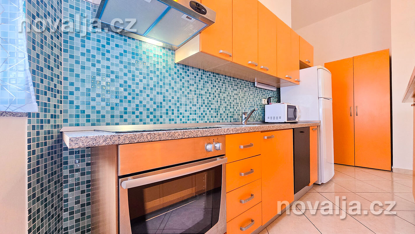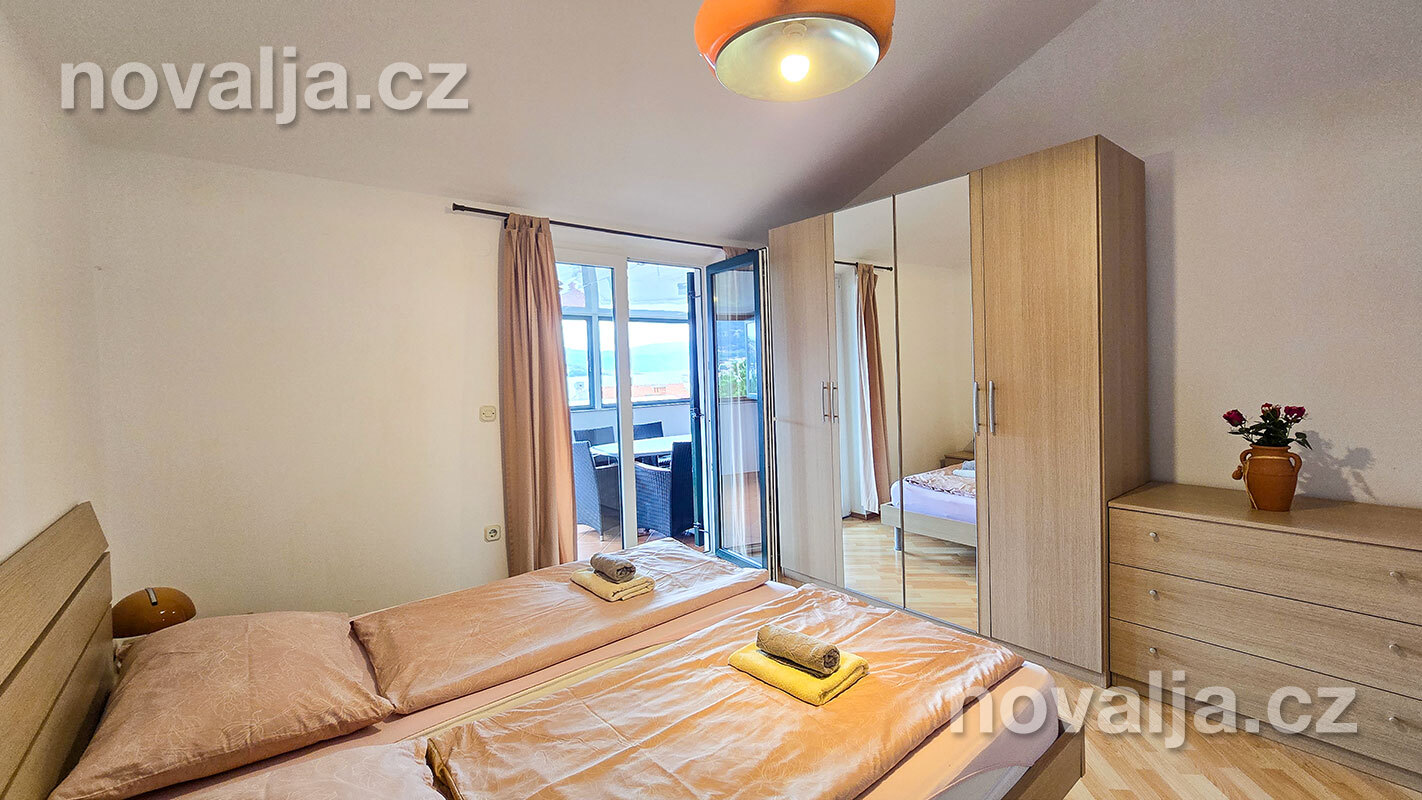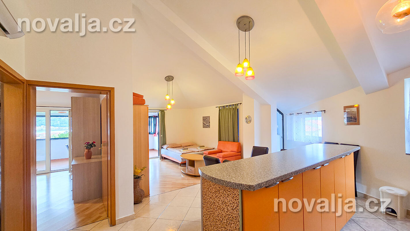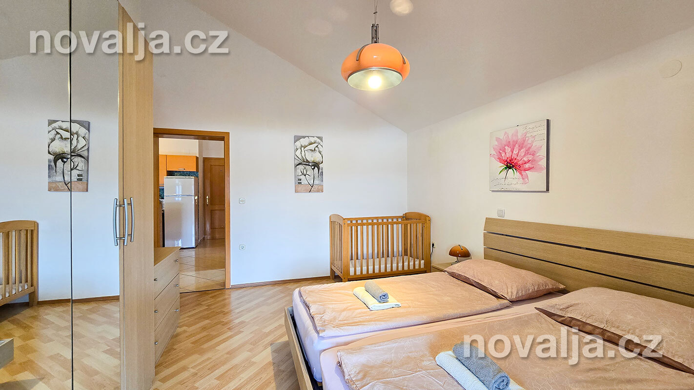 2 ložnice - jedna se dvěma lůžky, druhá s rozkládacím gaučem (200 x 140 cm) pro 1 osobu, vybavená kuchyň (lednička, mrazák, myčka, trouba, mikrovlnná trouba, varná konvice, kávovar, toaster) s rozkládacím gaučem (200 x 160 cm) pro 1–2 osoby, LCD TV+SAT, sociální zařízení s vanou a WC, pračka, fén, sejf, terasa s výhledem na moře. Klimatizace v kuchyni a v malé ložnici (v ceně).