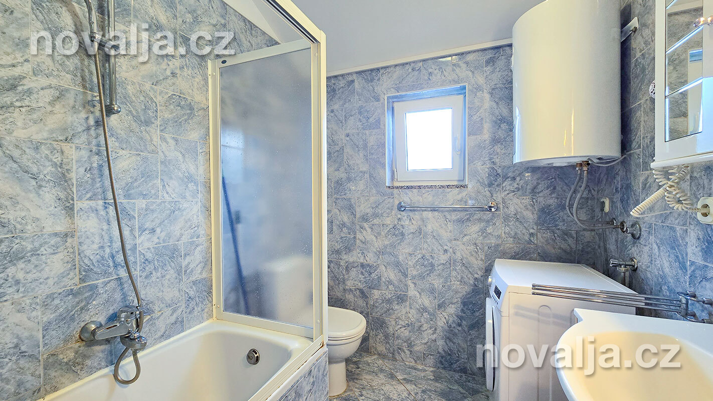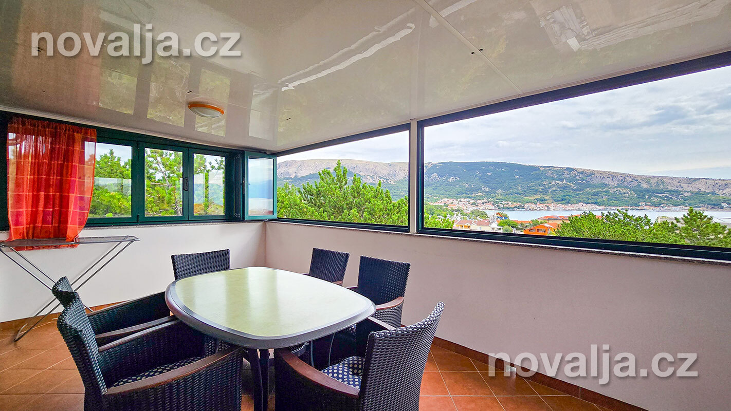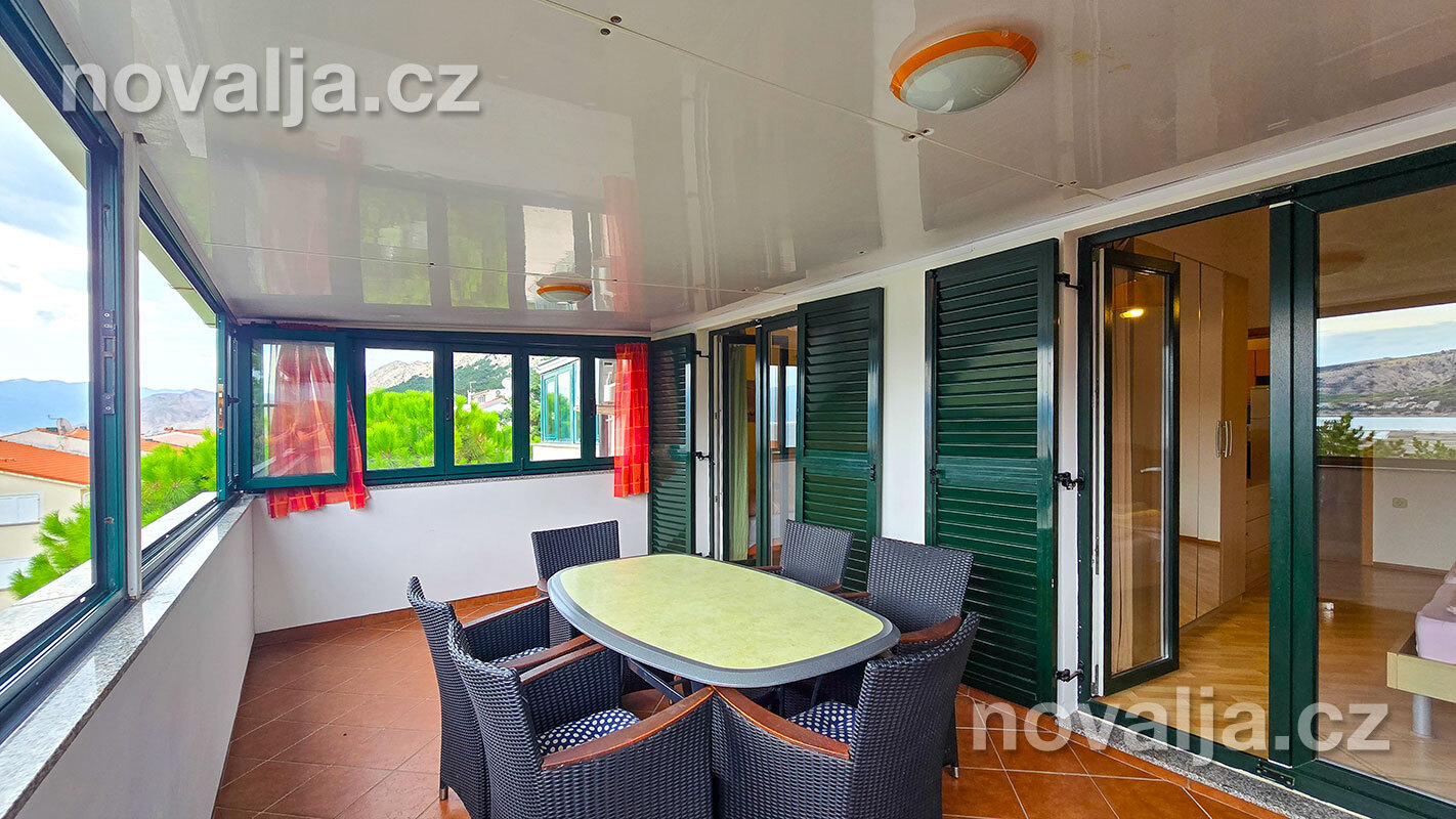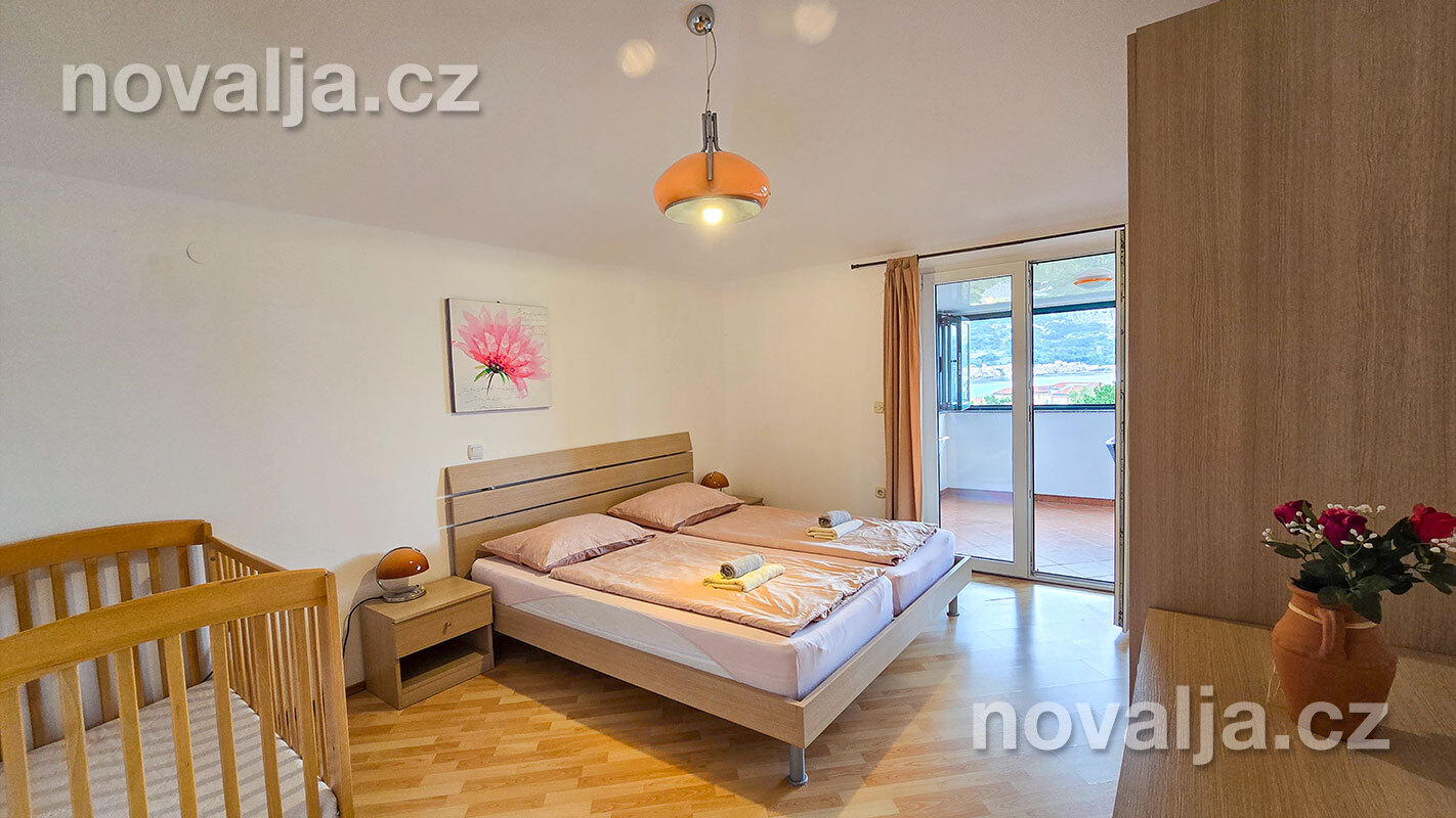 2 ložnice - jedna se dvěma lůžky, druhá s rozkládacím gaučem (200 x 140 cm) pro 1 osobu, vybavená kuchyň (lednička, mrazák, myčka, trouba, mikrovlnná trouba, varná konvice, kávovar, toaster) s rozkládacím gaučem (200 x 160 cm) pro 1–2 osoby, LCD TV+SAT, sociální zařízení s vanou a WC, pračka, fén, sejf, terasa s výhledem na moře. Klimatizace v kuchyni a v malé ložnici (v ceně).