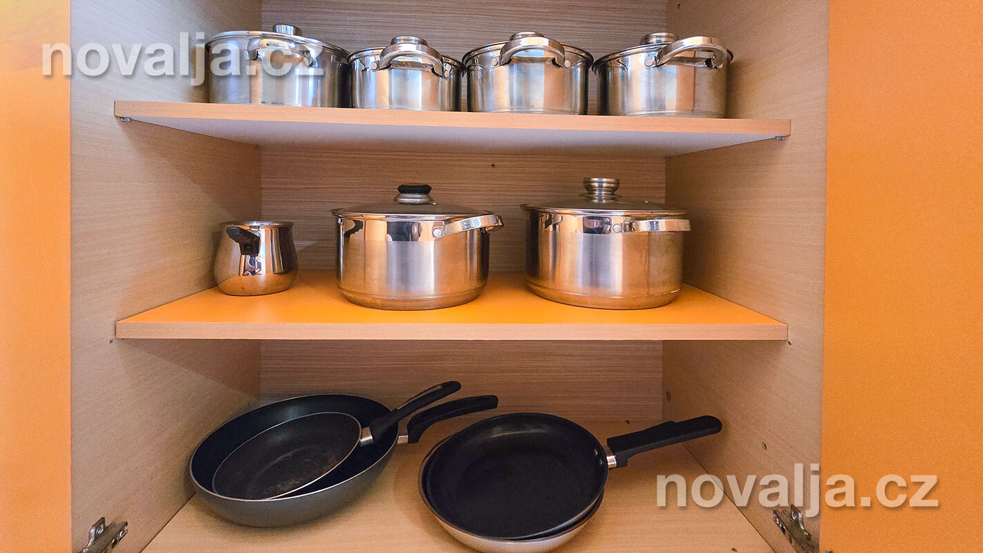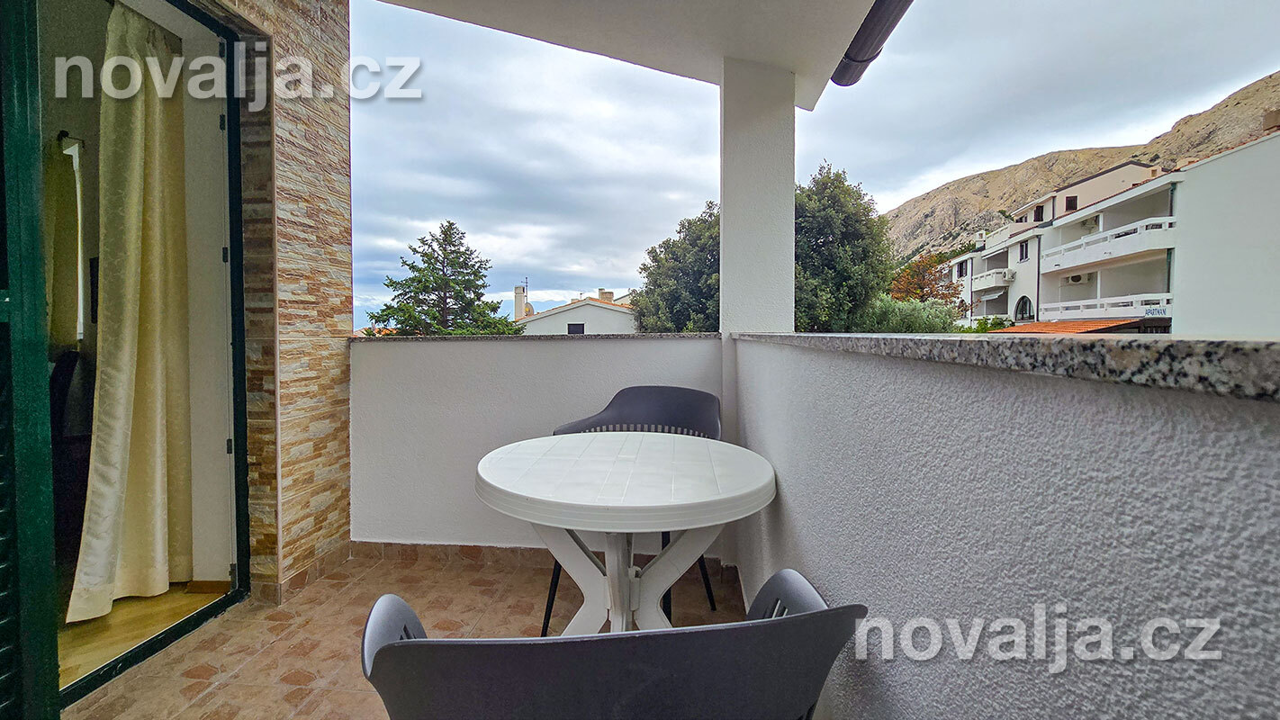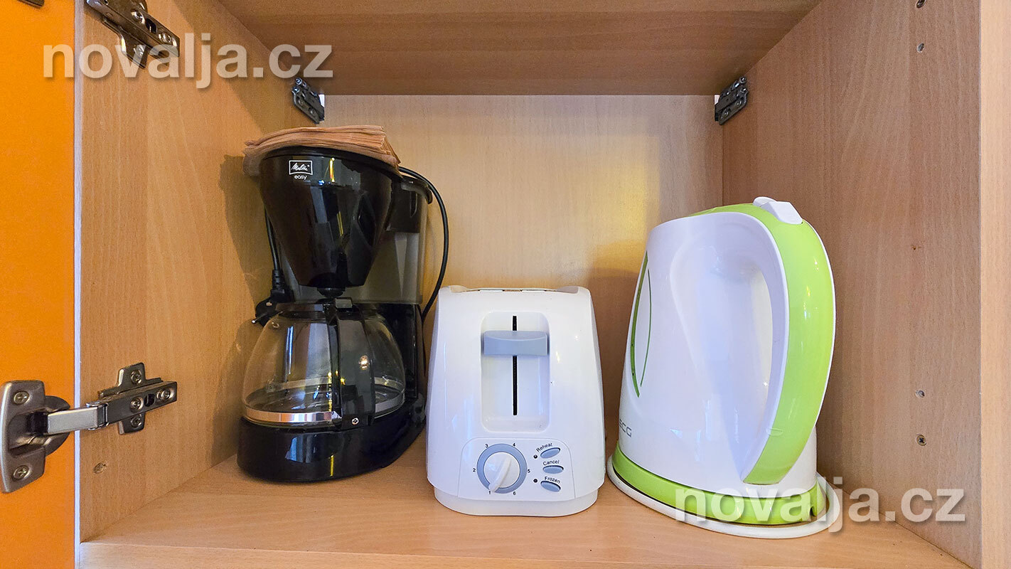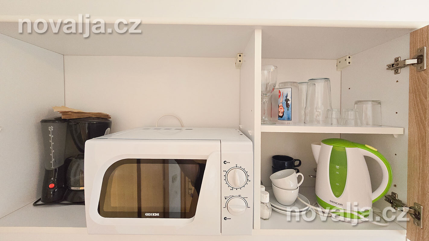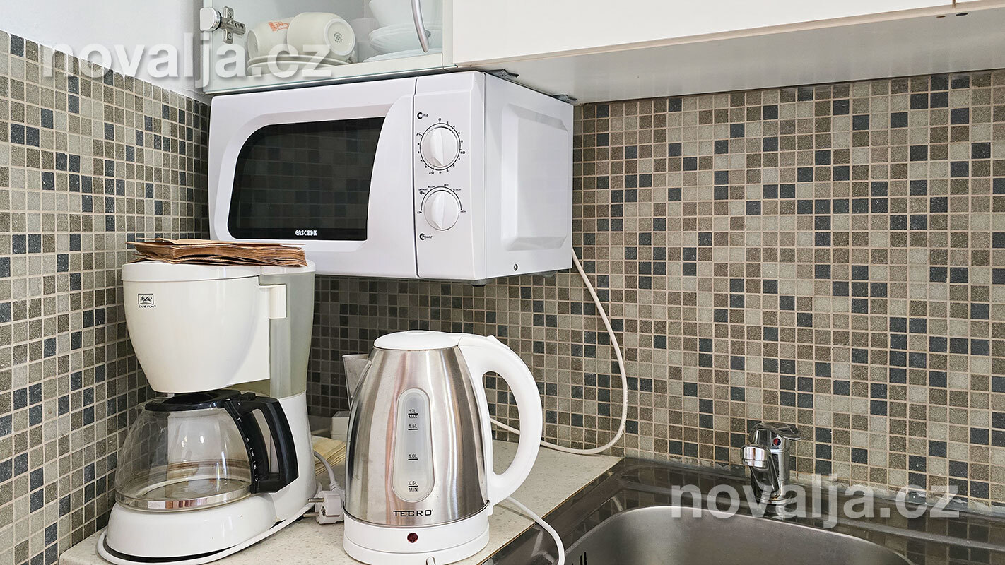 1 ložnice se dvěma lůžky, vybavená kuchyň (lednička, mrazák, trouba, mikrovlnná trouba, varná konvice, kávovar) s rozkládacím lůžkem (200 x 180 cm) pro 1–2 osoby (gauč na fotkách 3/10 a 5/10 není aktuální - foto bylo pořízeno před renovací), TV+SAT, sociální zařízení se sprchovým koutem a WC, fén, sejf, terasa (vně apartmánu). Klimatizace v kuchyni (v ceně).