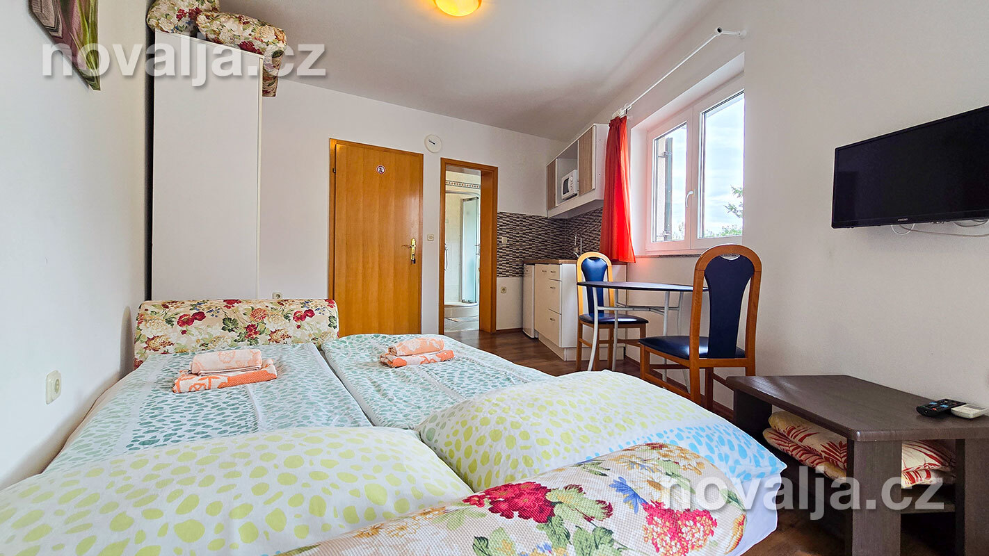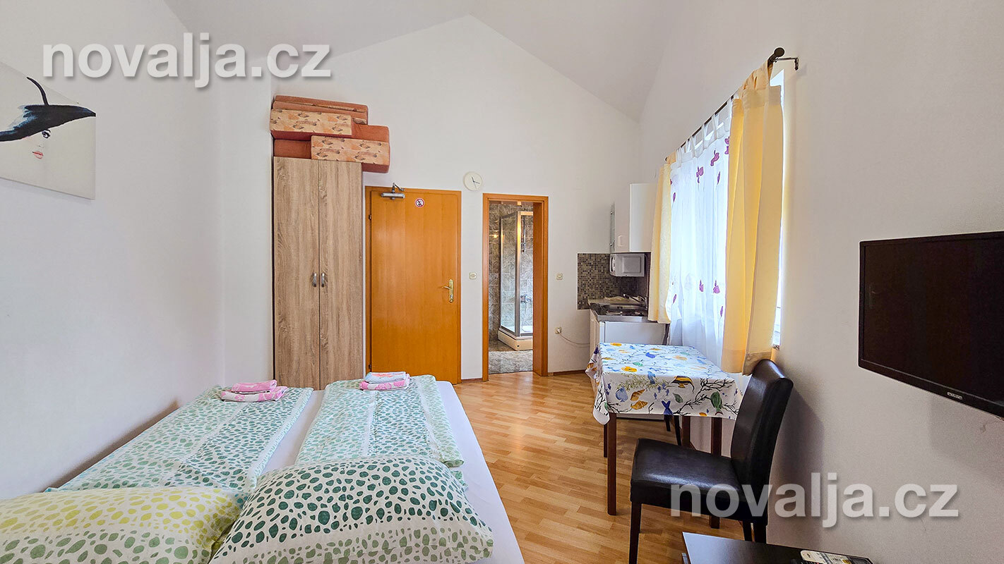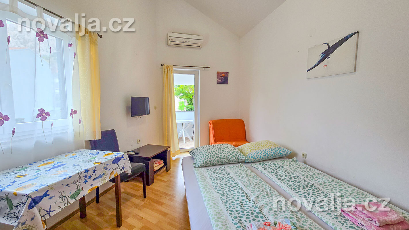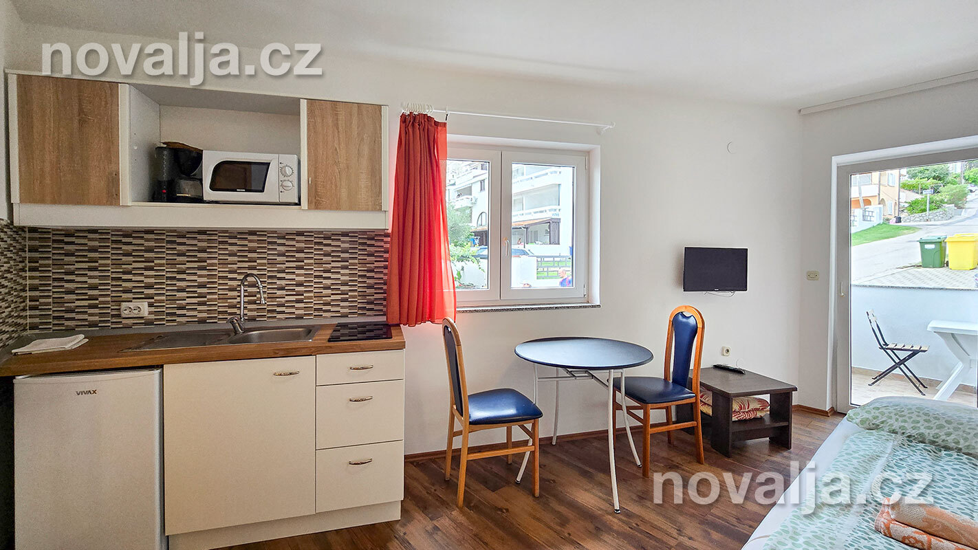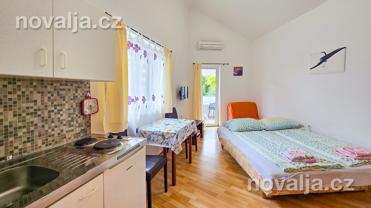 Studio (jedna místnost) s rozkládacím gaučem pro 2 osoby a možností přistýlky pro 1 dítě do 15 let, vybavený kuchyňský kout (lednička, mikrovlnná trouba, varná konvice, kávovar), TV+SAT, sociální zařízení se sprchovým koutem a WC, fén, sejf, terasa s bočním výhledem na moře. Klimatizace (v ceně).