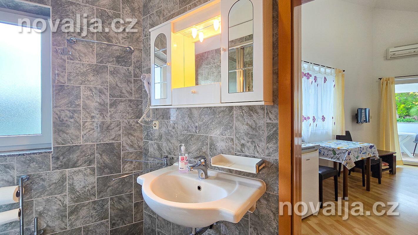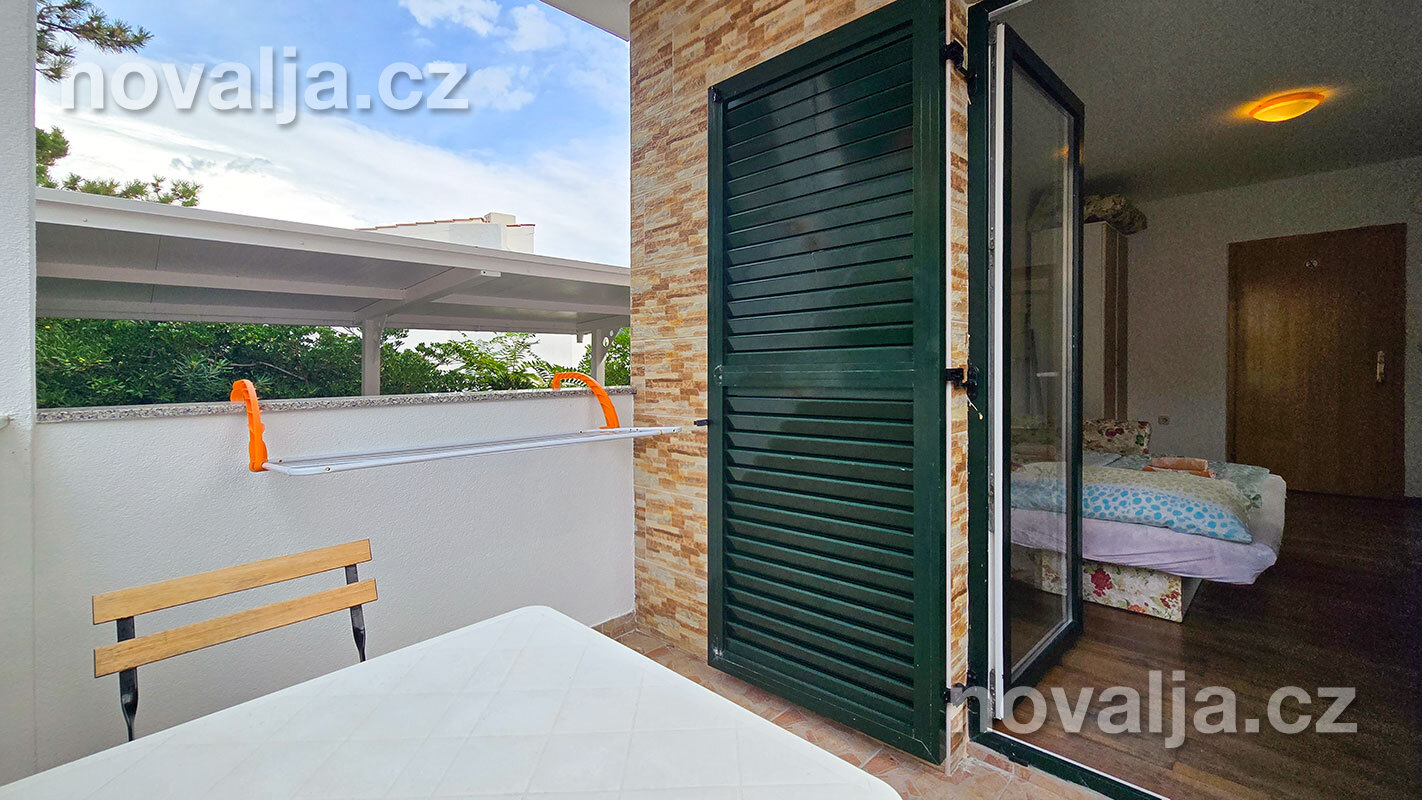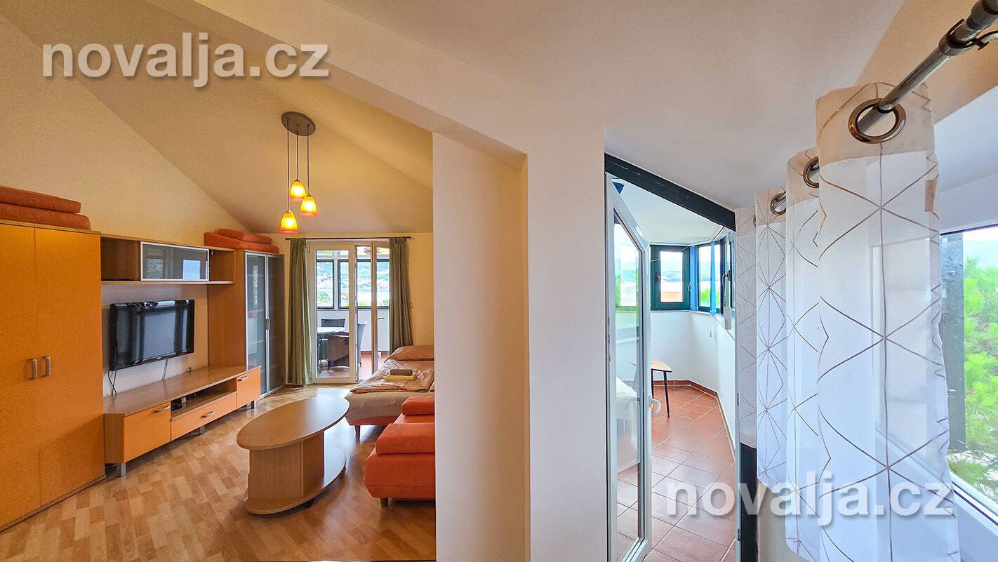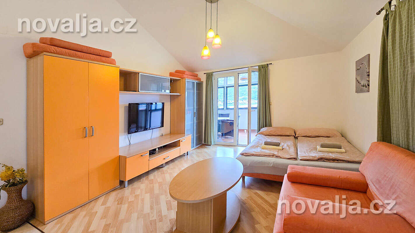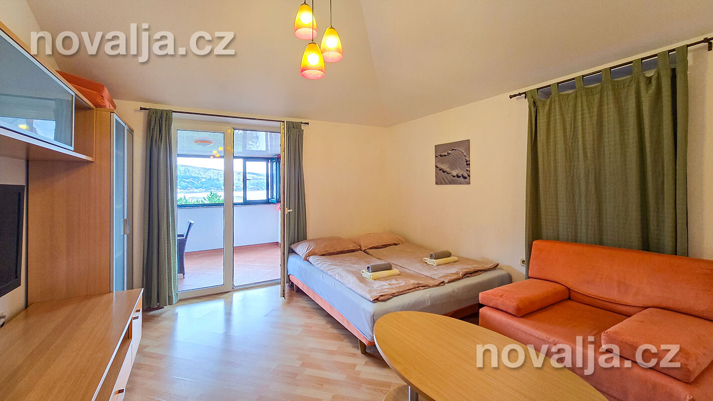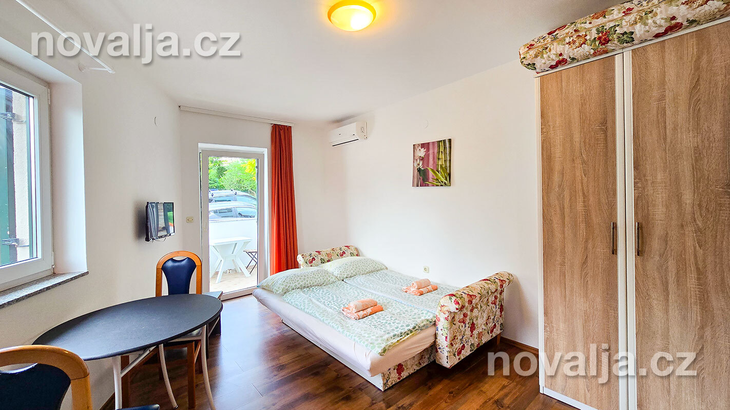 Studio (jedna místnost) s rozkládacím gaučem pro 2 osoby a možností přistýlky pro 1 dítě do 15 let, vybavený kuchyňský kout (lednička, mikrovlnná trouba, varná konvice, kávovar), TV+SAT, sociální zařízení se sprchovým koutem a WC, fén, sejf, terasa s bočním výhledem na moře. Klimatizace (v ceně).