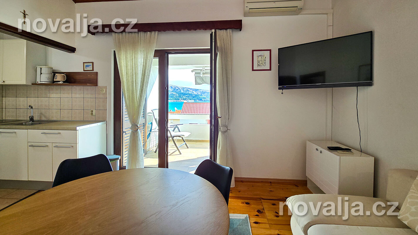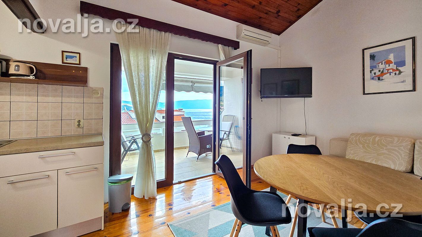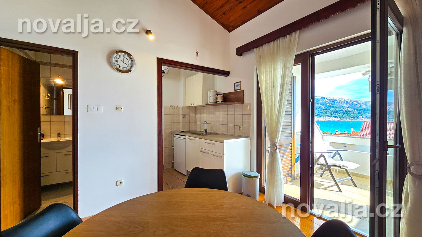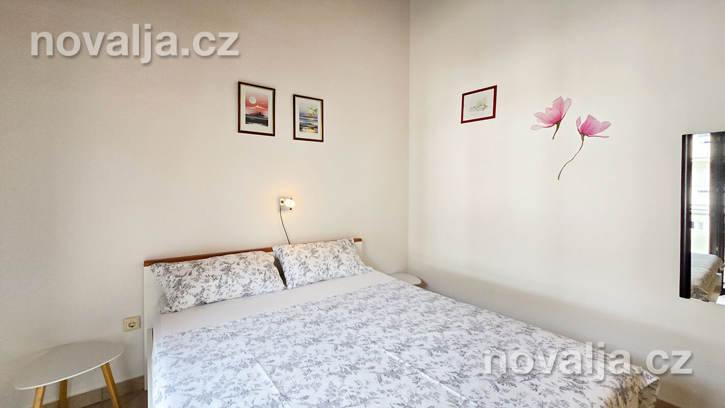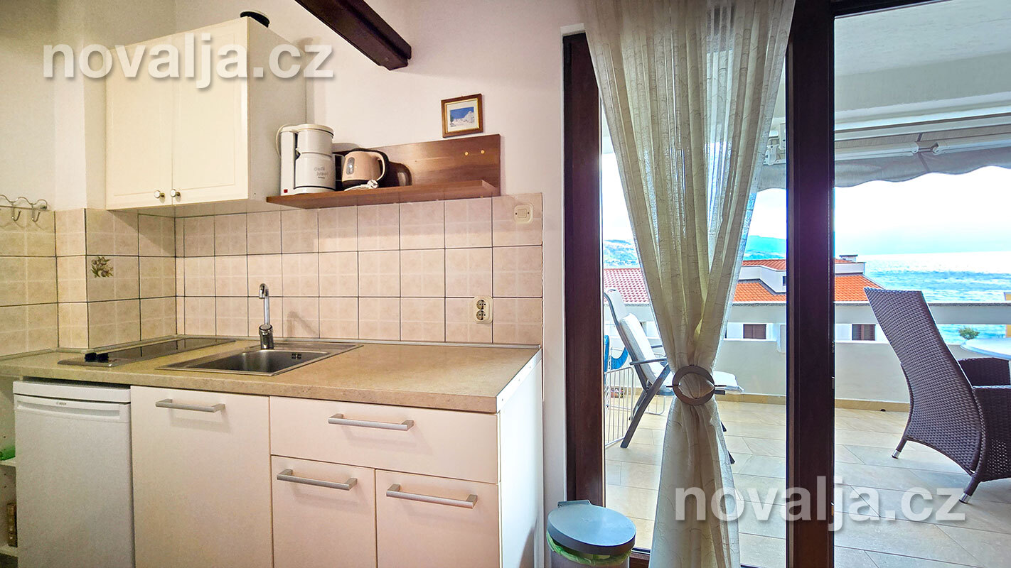 1 ložnice se dvěma lůžky a rozkládacím křeslem pro 1 osobu, vybavená kuchyň (lednička, varná konvice, kávovar) s rozkládacím gaučem pro 1 osobu, TV+SAT, sociální zařízení se sprchovým koutem a WC, fén, terasa s výhledem na moře. Klimatizace v kuchyni (v ceně).