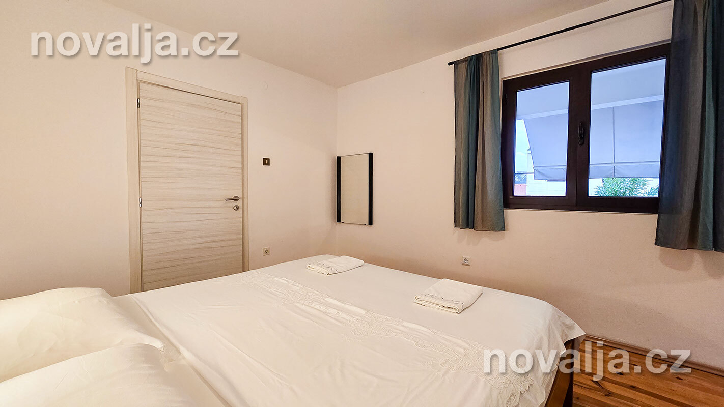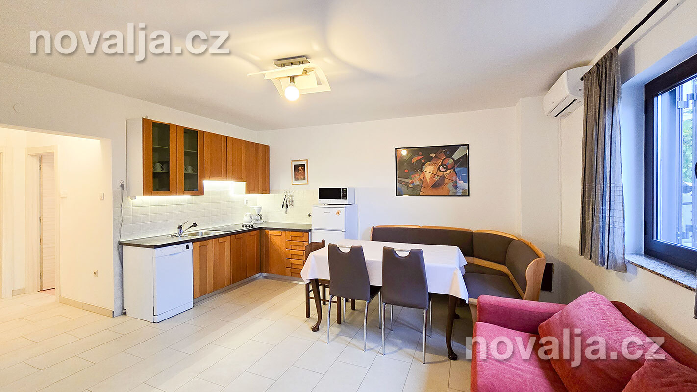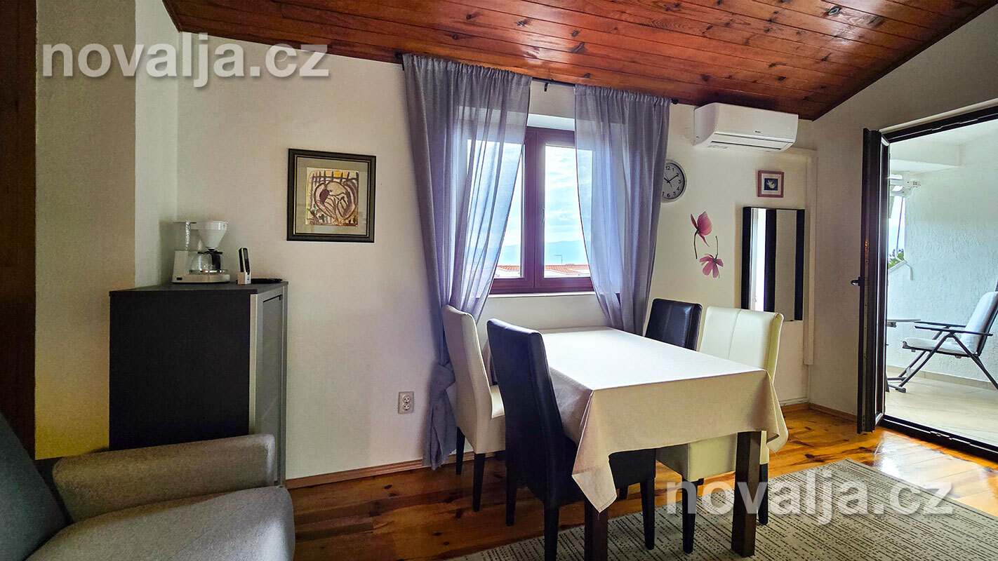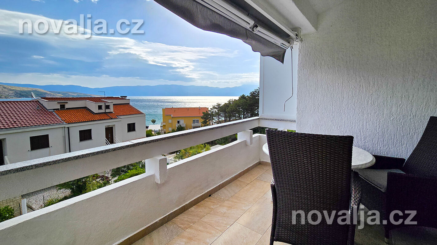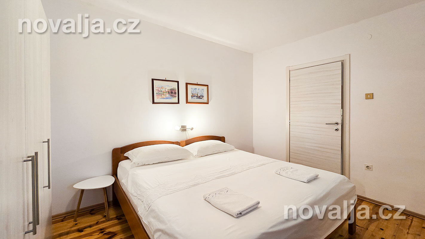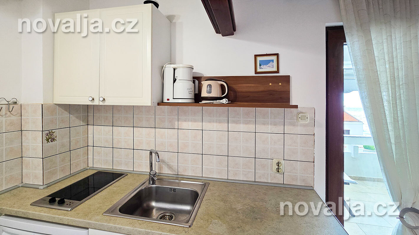 1 ložnice se dvěma lůžky a rozkládacím křeslem pro 1 osobu, vybavená kuchyň (lednička, varná konvice, kávovar) s rozkládacím gaučem pro 1 osobu, TV+SAT, sociální zařízení se sprchovým koutem a WC, fén, terasa s výhledem na moře. Klimatizace v kuchyni (v ceně).