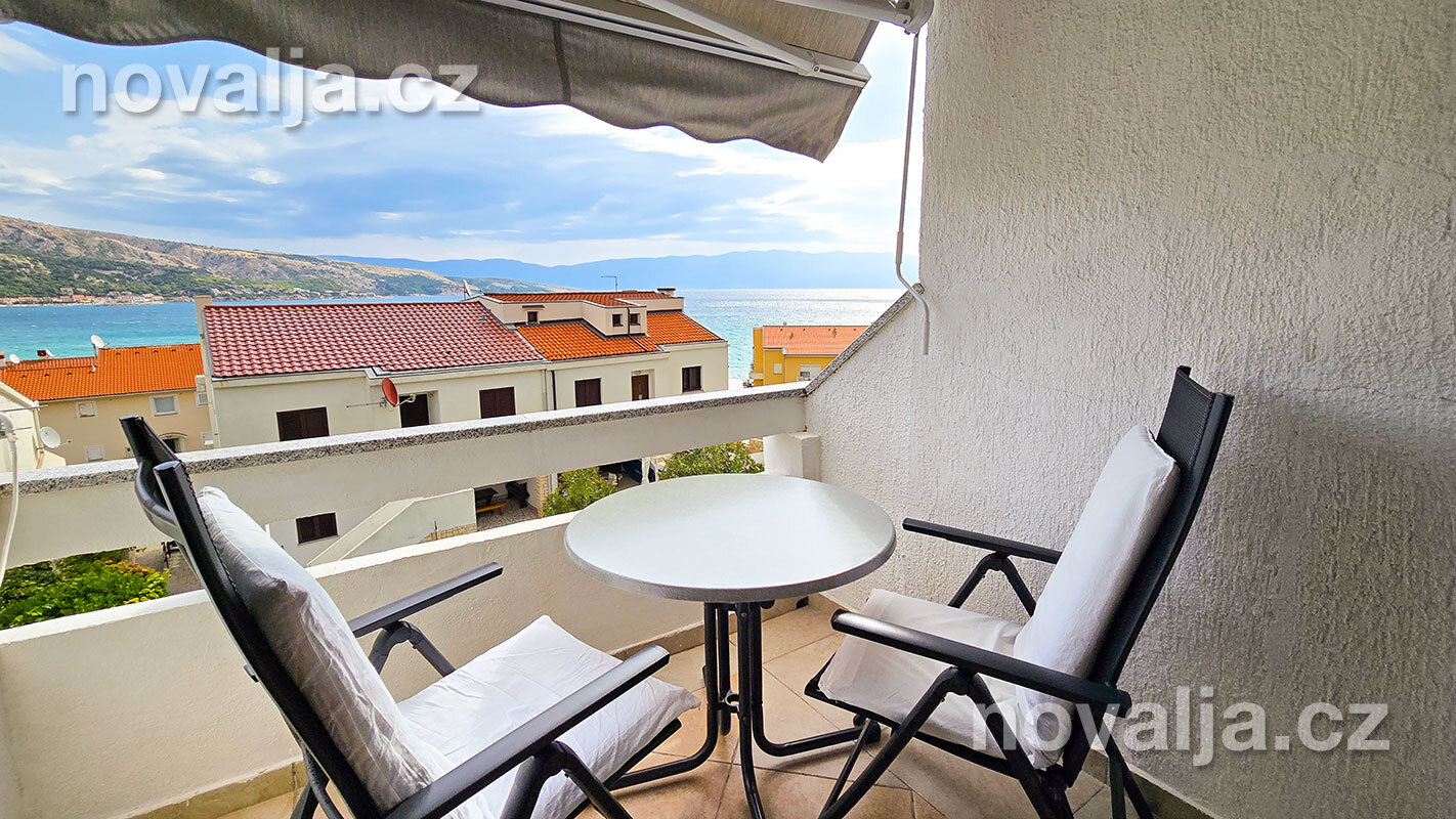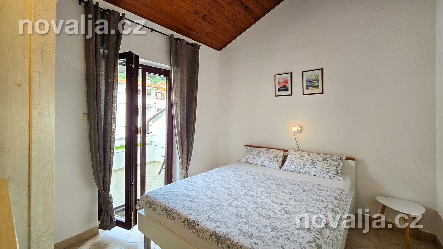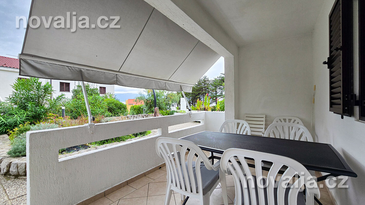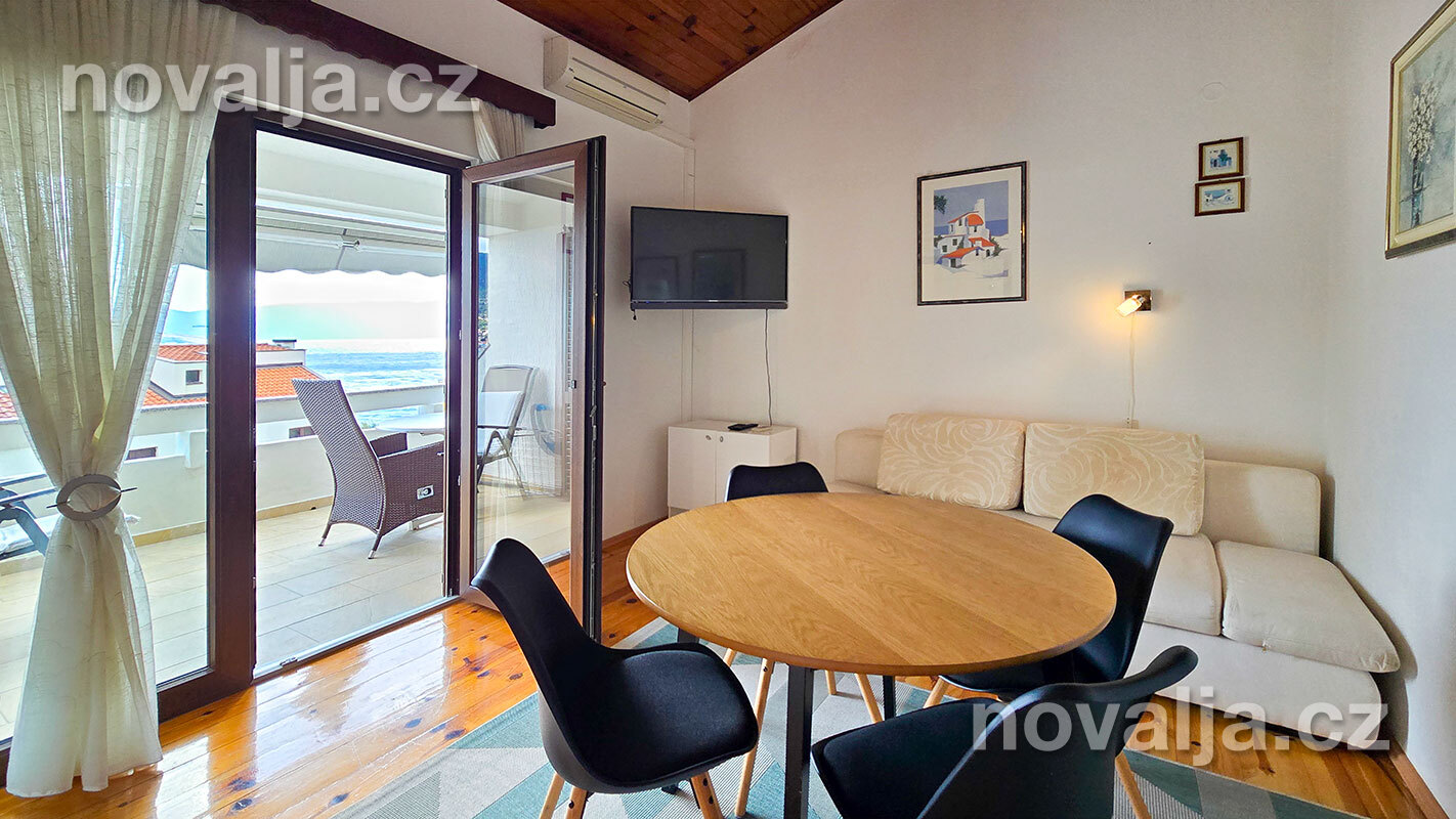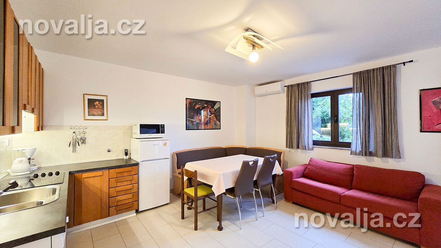 1 ložnice se dvěma lůžky a rozkládacím křeslem pro 1 osobu, vybavená kuchyň (lednička, varná konvice, kávovar) s rozkládacím gaučem pro 1 osobu, TV+SAT, sociální zařízení se sprchovým koutem a WC, fén, terasa s výhledem na moře. Klimatizace v kuchyni (v ceně).