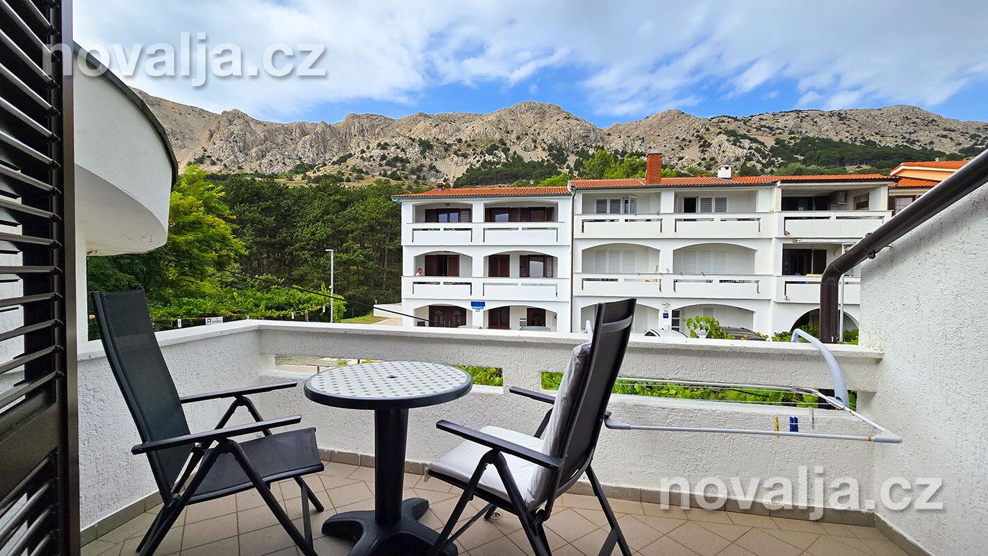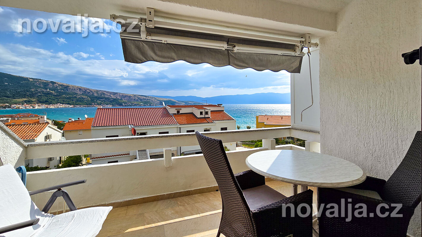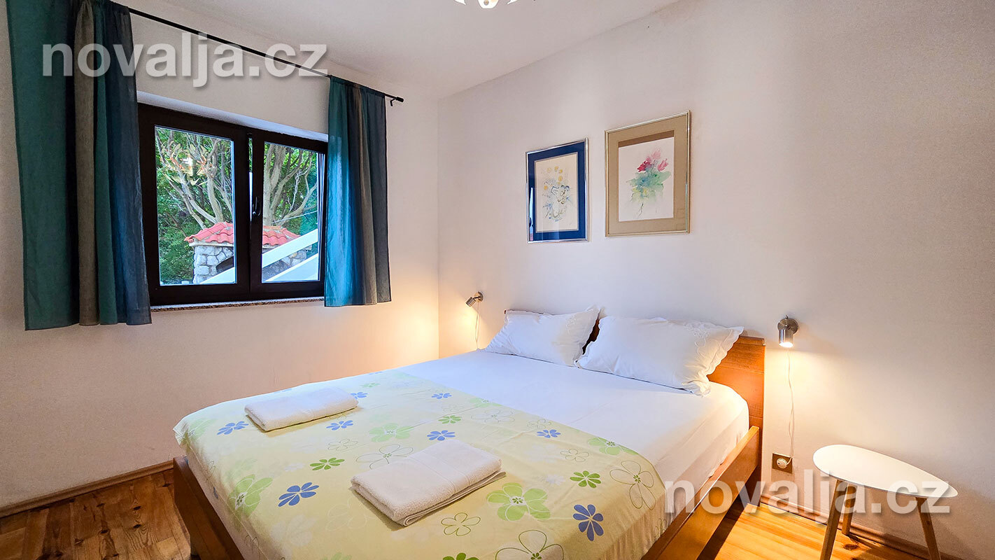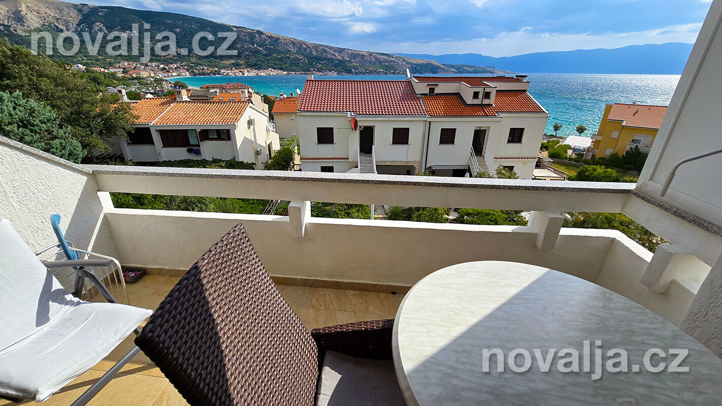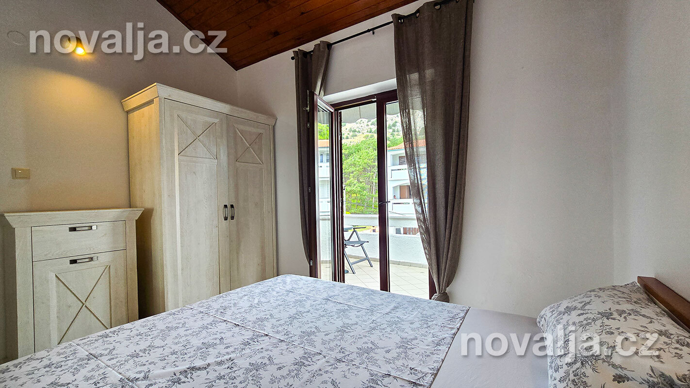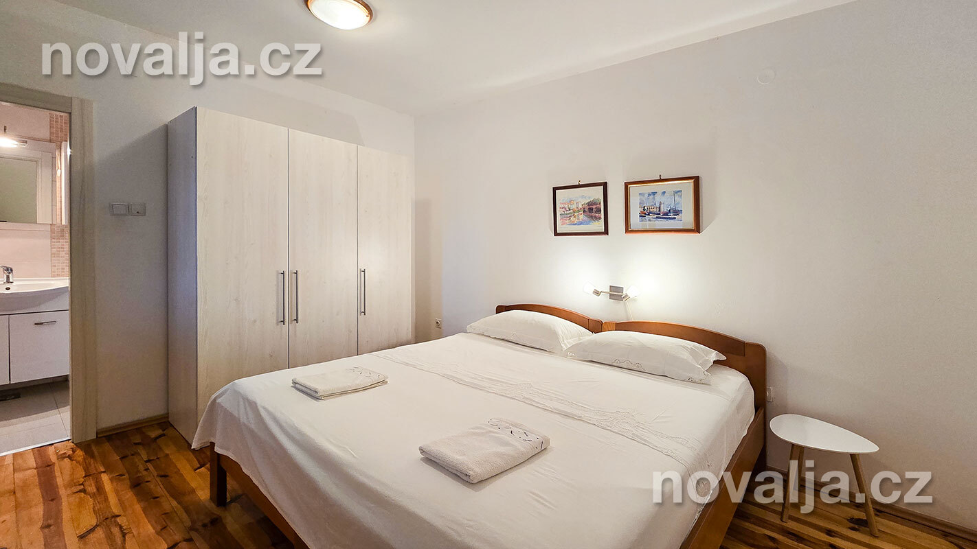 1 ložnice se dvěma lůžky a rozkládacím křeslem pro 1 osobu, vybavená kuchyň (lednička, varná konvice, kávovar) s rozkládacím gaučem pro 1 osobu, TV+SAT, sociální zařízení se sprchovým koutem a WC, fén, terasa s výhledem na moře. Klimatizace v kuchyni (v ceně).