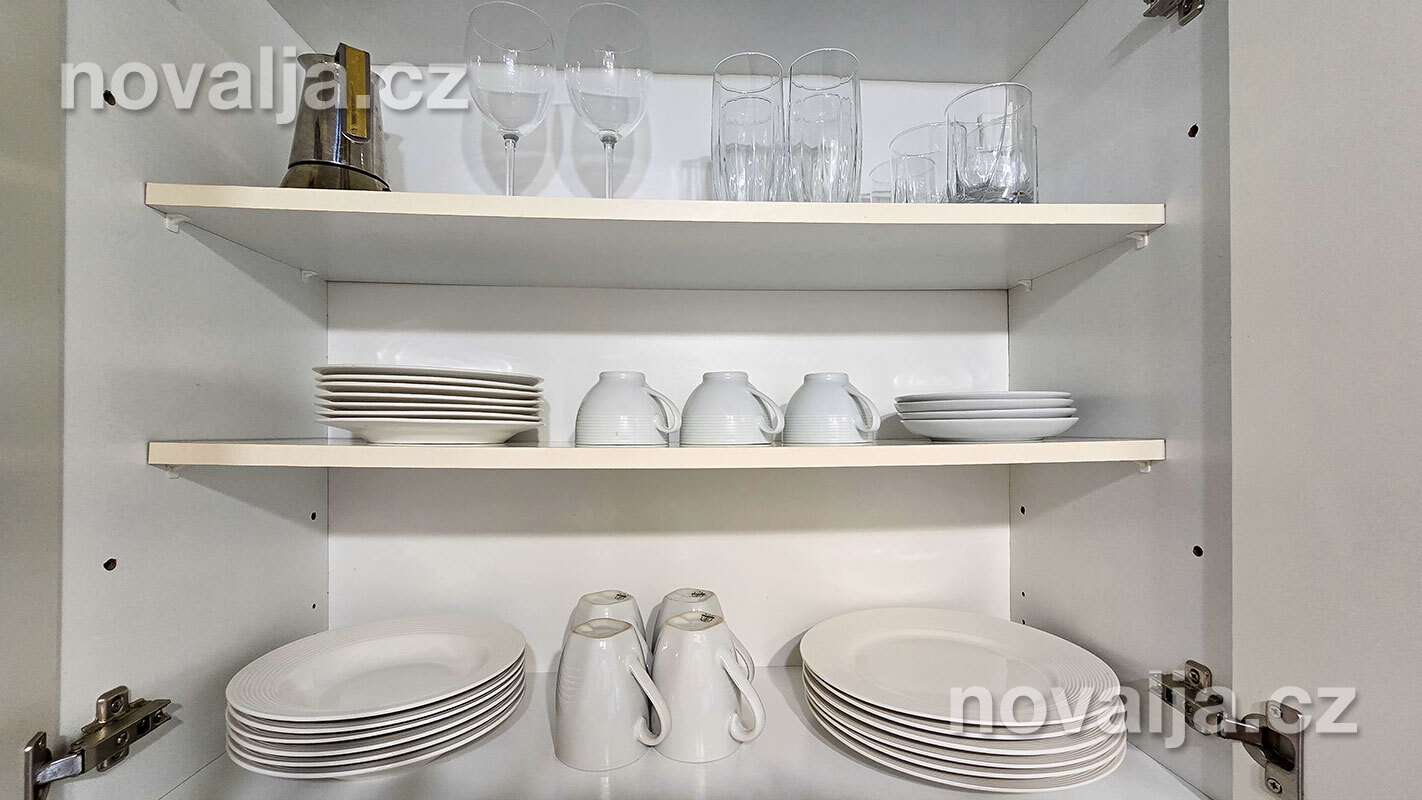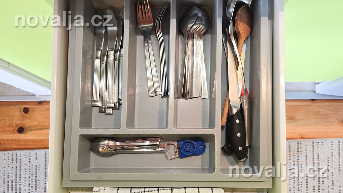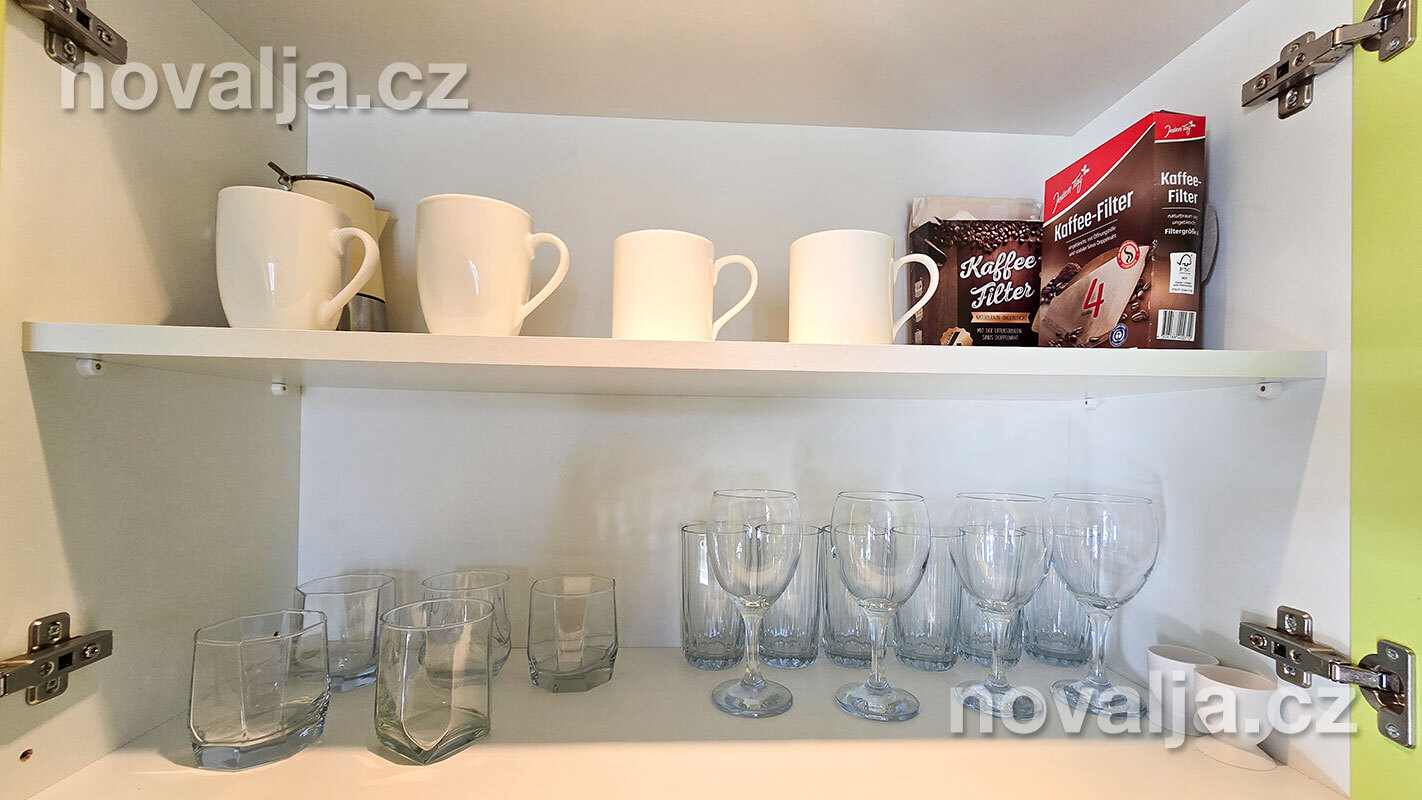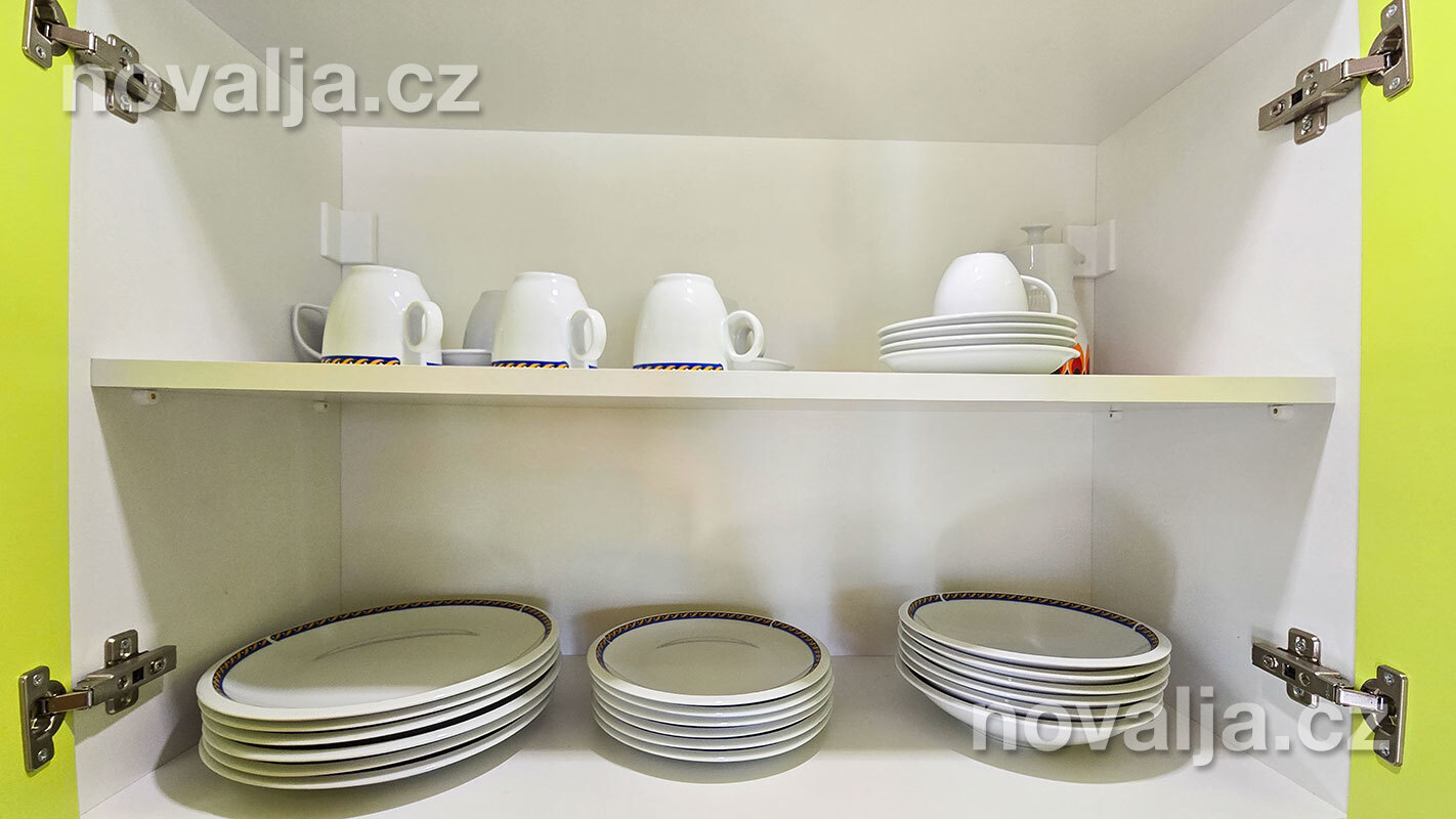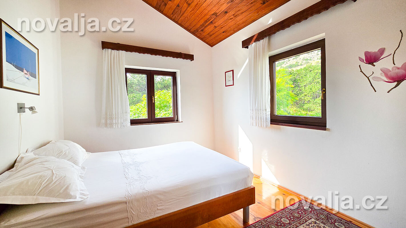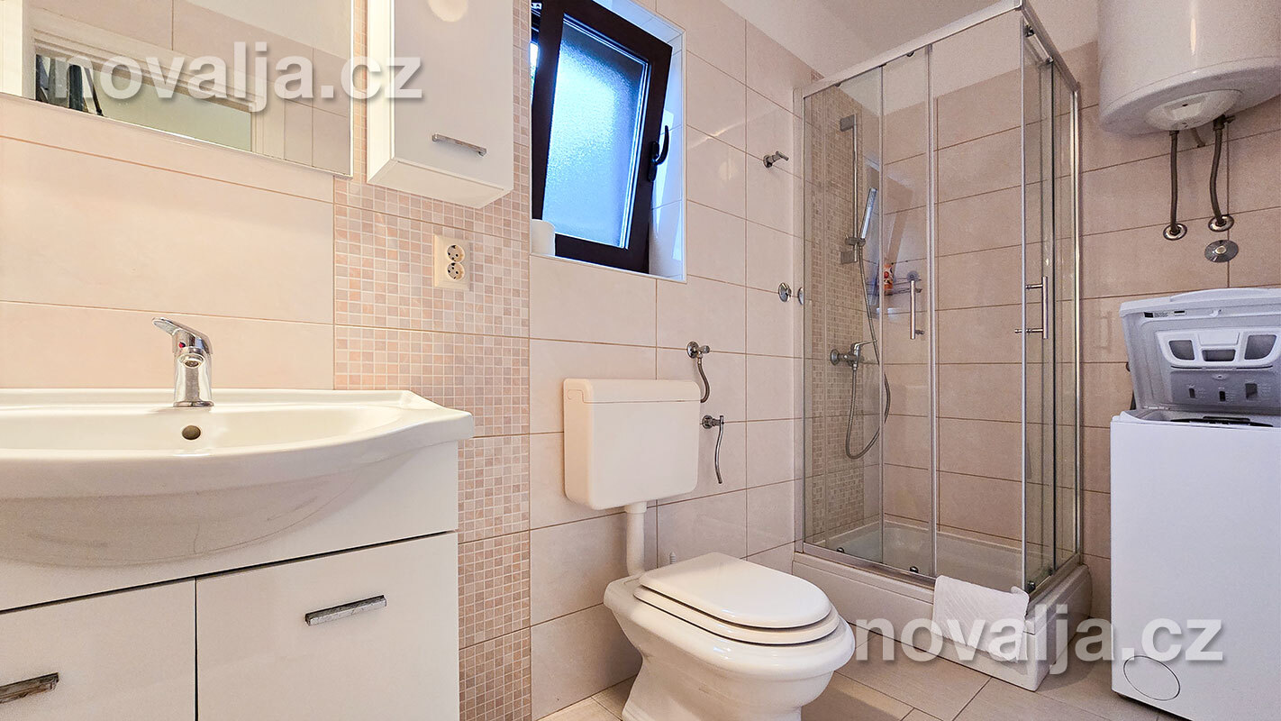 3 ložnice se dvěma lůžky (v jedné ložnici je jen jedno malé okno), vybavená kuchyň (lednička, mrazák, myčka, mikrovlnná trouba, varná konvice, kávovar) s rozkládacím gaučem pro 1 osobu, TV+SAT, 2x sociální zařízení - 1x se sprchovým koutem a WC, 1x s malou vanou a WC, fén, pračka, terasa, 2 lehátka. Klimatizace v kuchyni (v ceně).