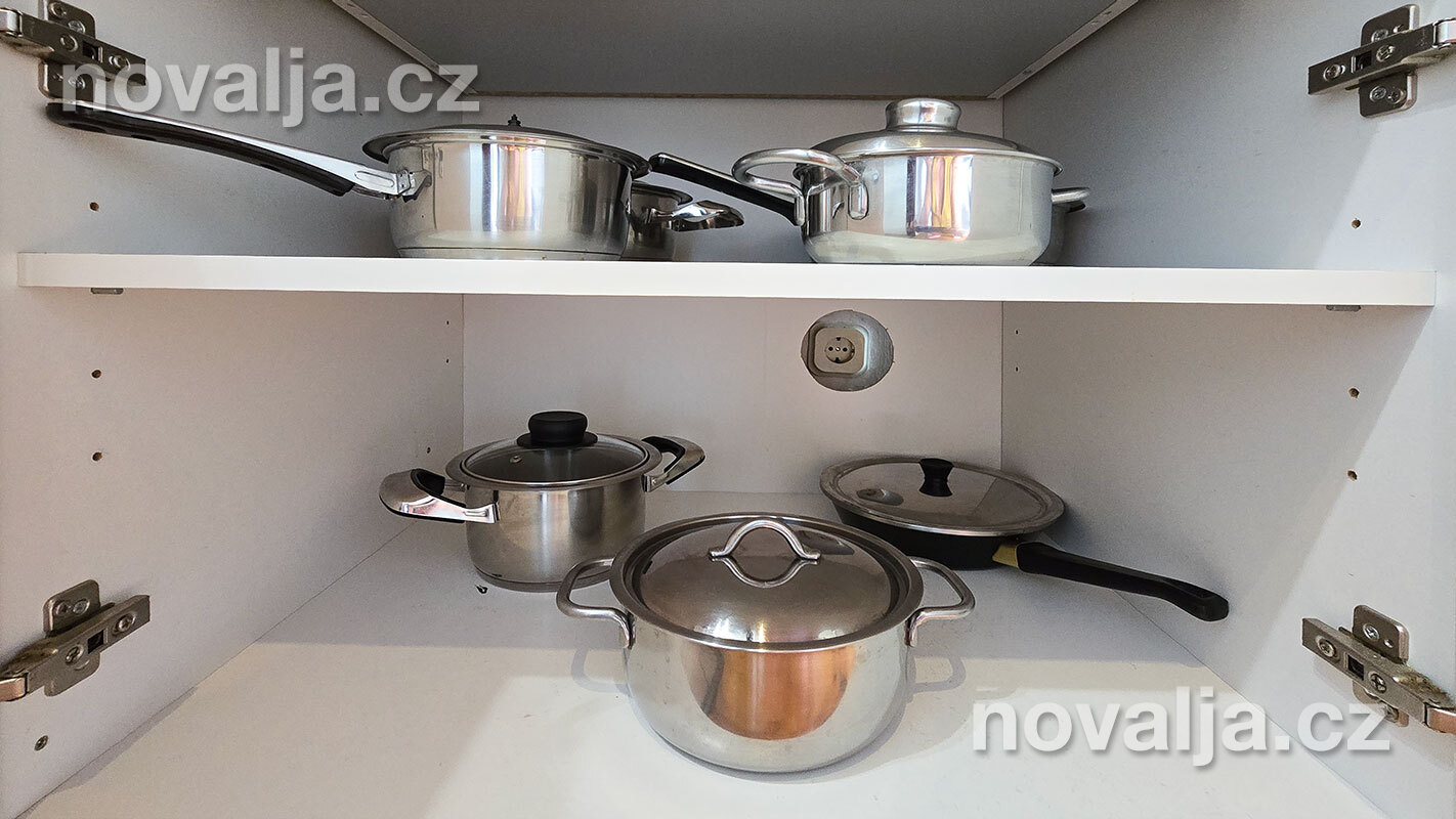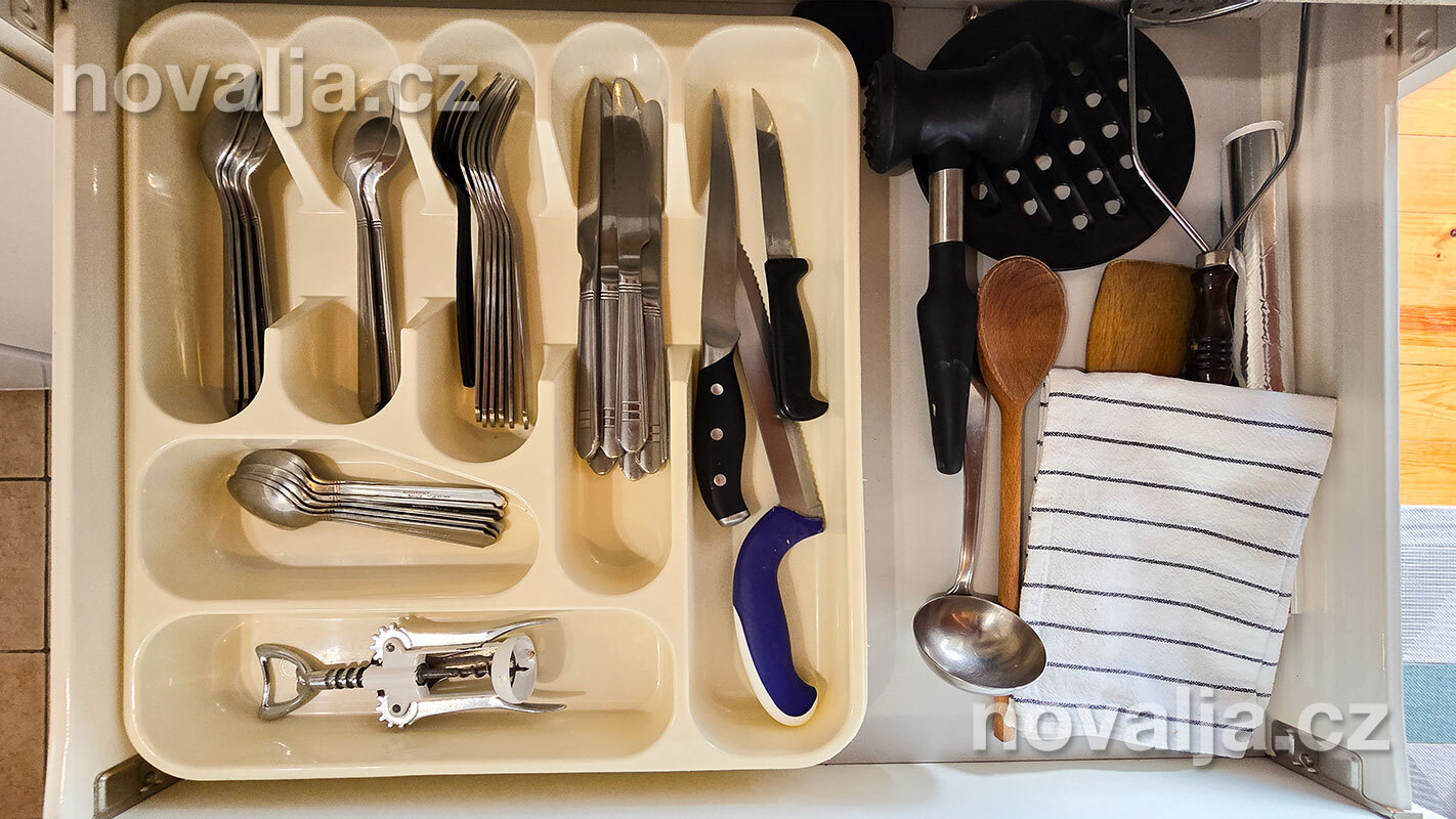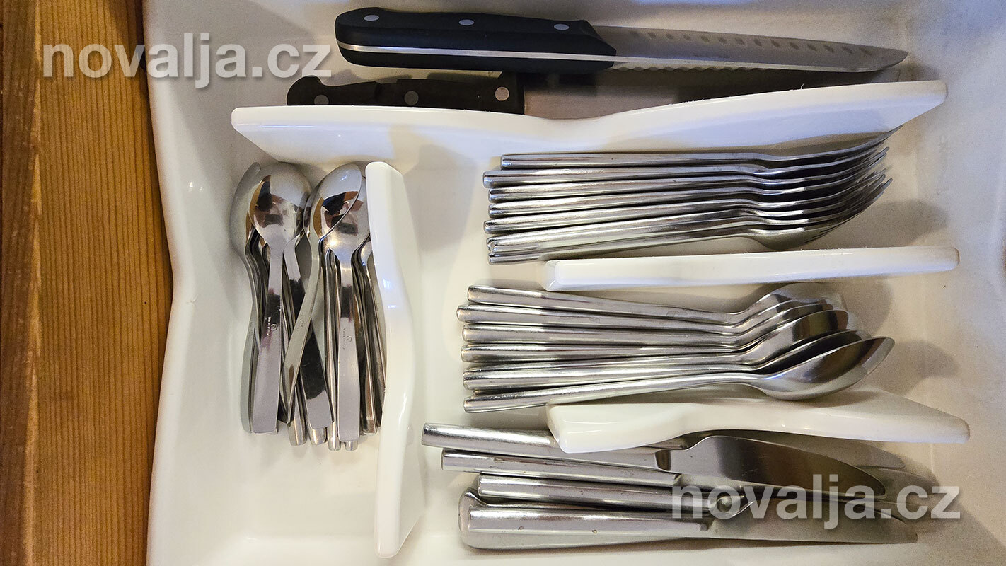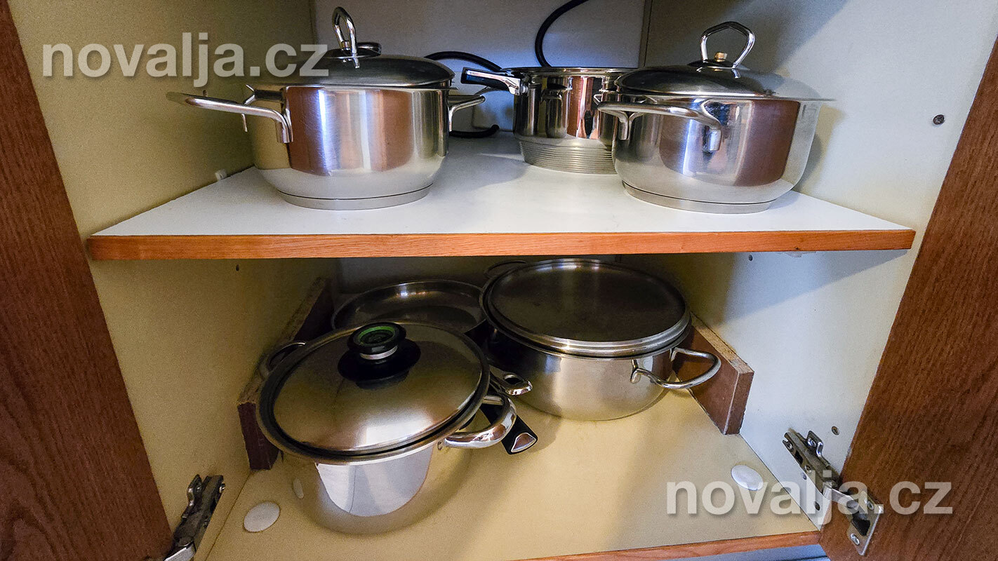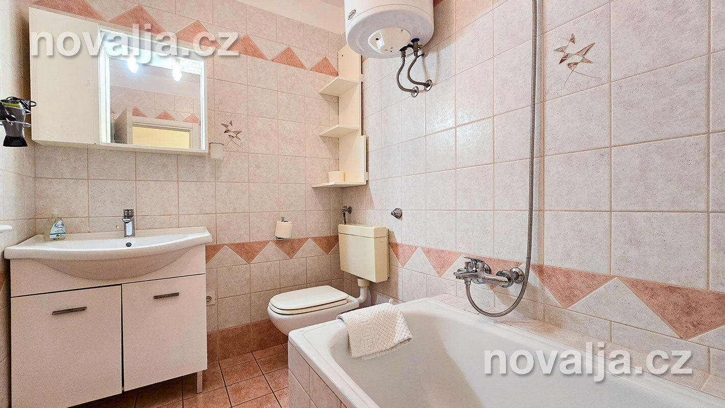 3 ložnice se dvěma lůžky (v jedné ložnici je jen jedno malé okno), vybavená kuchyň (lednička, mrazák, myčka, mikrovlnná trouba, varná konvice, kávovar) s rozkládacím gaučem pro 1 osobu, TV+SAT, 2x sociální zařízení - 1x se sprchovým koutem a WC, 1x s malou vanou a WC, fén, pračka, terasa, 2 lehátka. Klimatizace v kuchyni (v ceně).