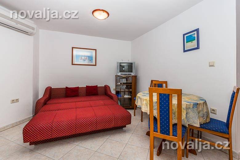 1 ložnice se dvěma lůžky, vybavená kuchyň (lednička, mrazák, myčka, mikrovlnná trouba, varná konvice, kávovar, toaster) s rozkládacím gaučem pro 1-2 osoby, TV+SAT, sociální zařízení se sprchovým koutem a WC, fén, sejf, terasa. Klimatizace v kuchyni (v ceně).