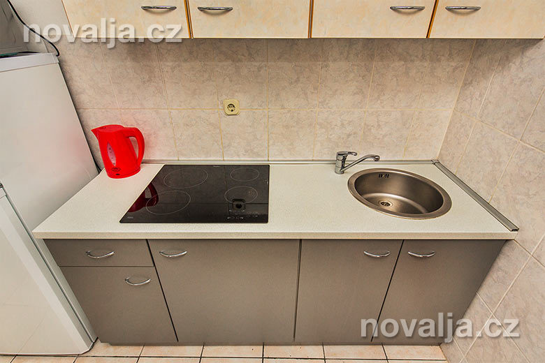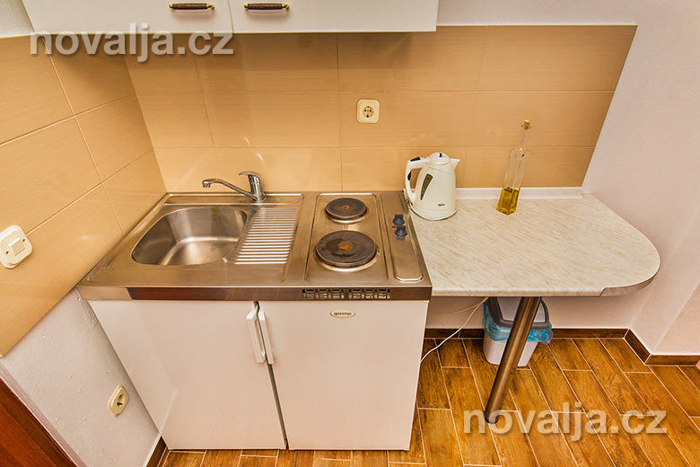 1 ložnice se dvěma lůžky, vybavená kuchyň (lednička, mrazák, myčka, mikrovlnná trouba, varná konvice, toustovač) s rozkládacím gaučem (200 x 155 cm) pro 1-2 osoby (buď 2 děti do 12 let, nebo jen 1 osoba starší 12 let), TV+SAT, sejf, sociální zařízení se sprchovým koutem a WC, fén, terasa s pěkným výhledem na moře. Klimatizace v kuchyni (v ceně).