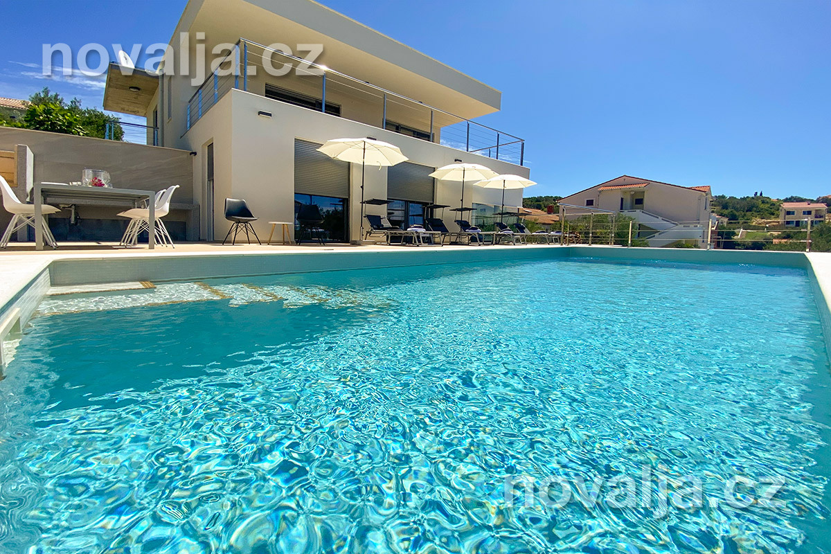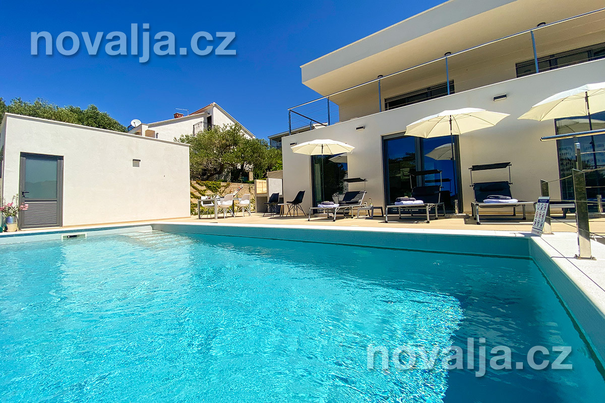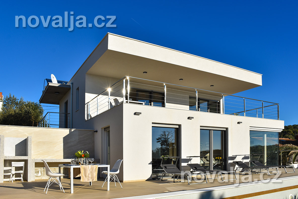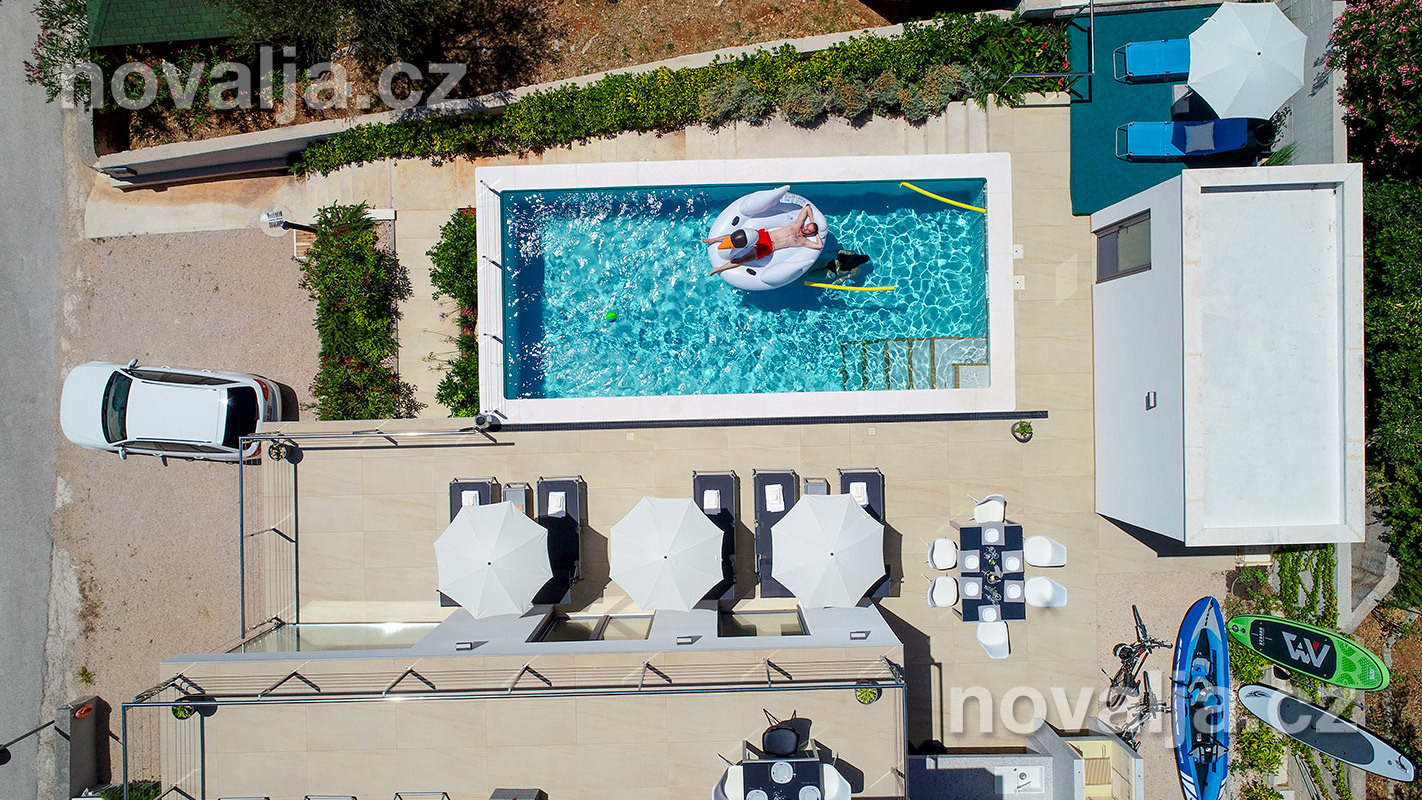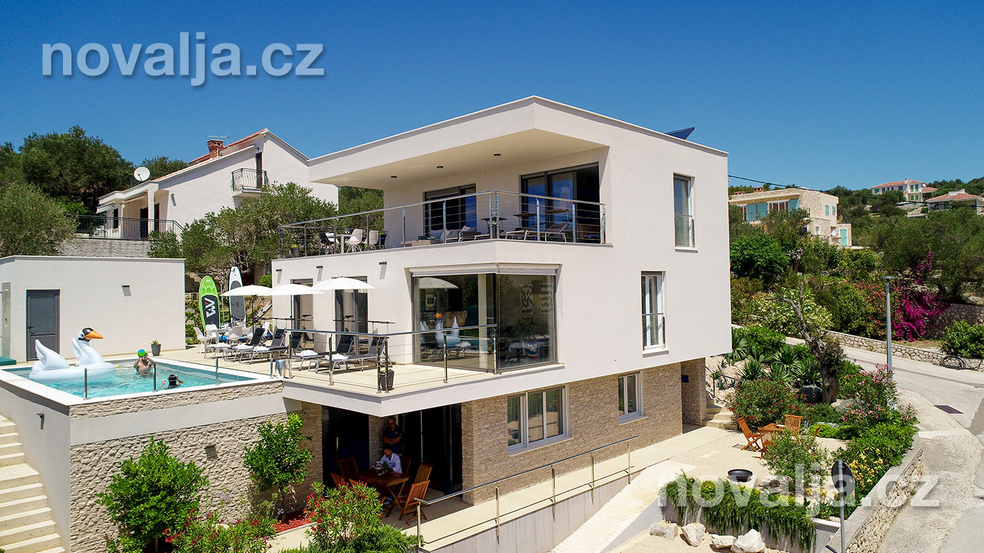 Vila vás zaujme hned na první pohled - je světlá, moderně zařízená, s krásným vyhřívaným bazénem a prostornými terasami s lehátky a výhledem na moře. K dispozici je zde také sauna a u bazénu letní kuchyně a gril. Krásná oblázková pláž se nachází jen 80 m od domu.