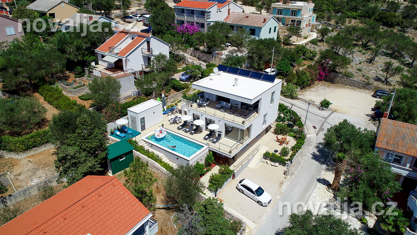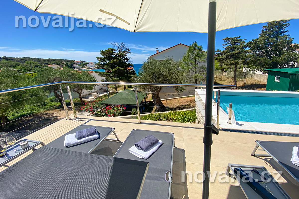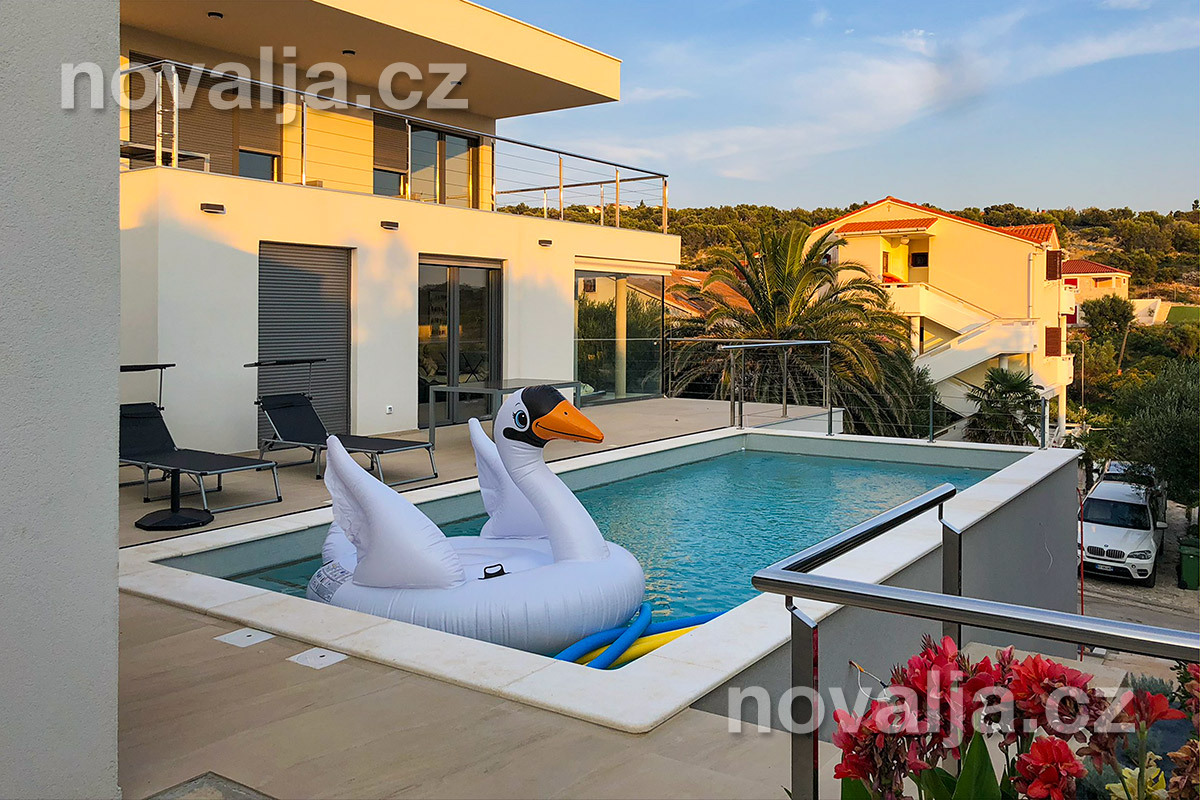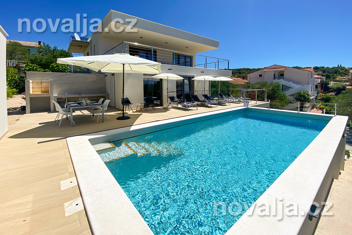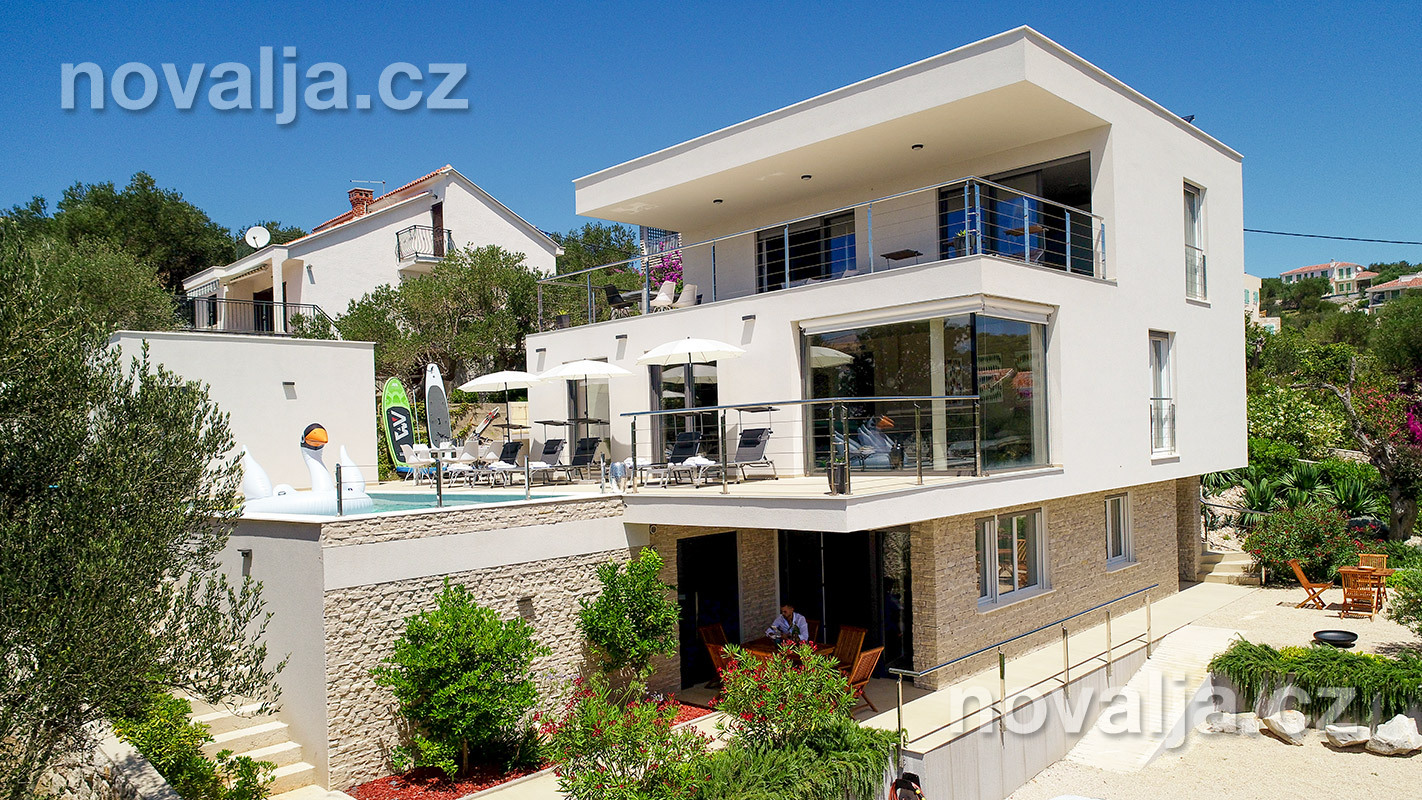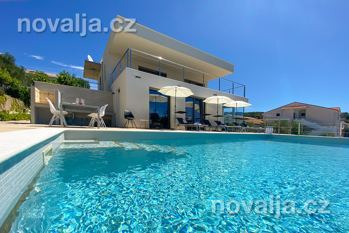 Vila vás zaujme hned na první pohled - je světlá, moderně zařízená, s krásným vyhřívaným bazénem a prostornými terasami s lehátky a výhledem na moře. K dispozici je zde také sauna a u bazénu letní kuchyně a gril. Krásná oblázková pláž se nachází jen 80 m od domu.