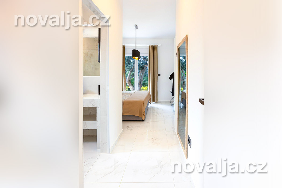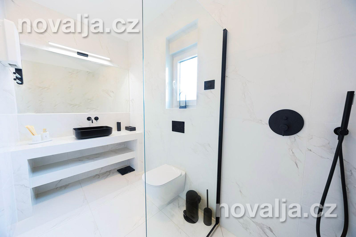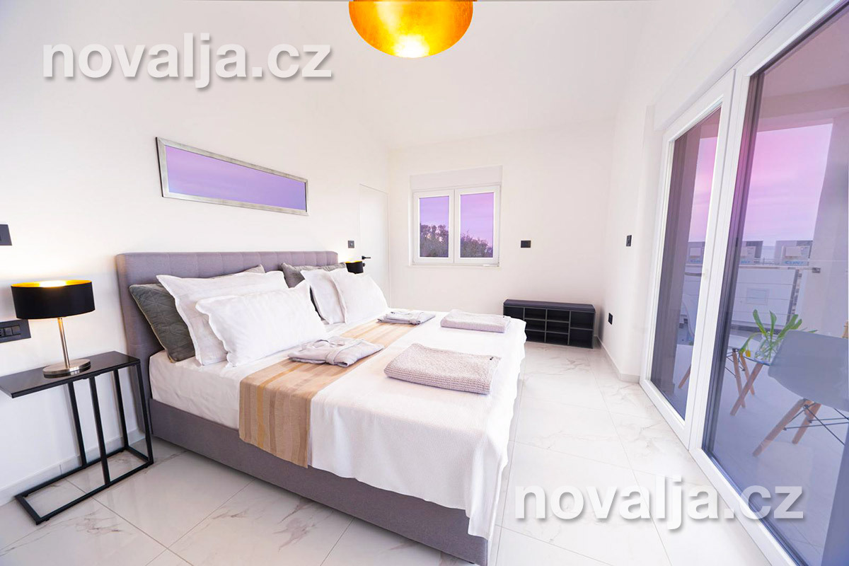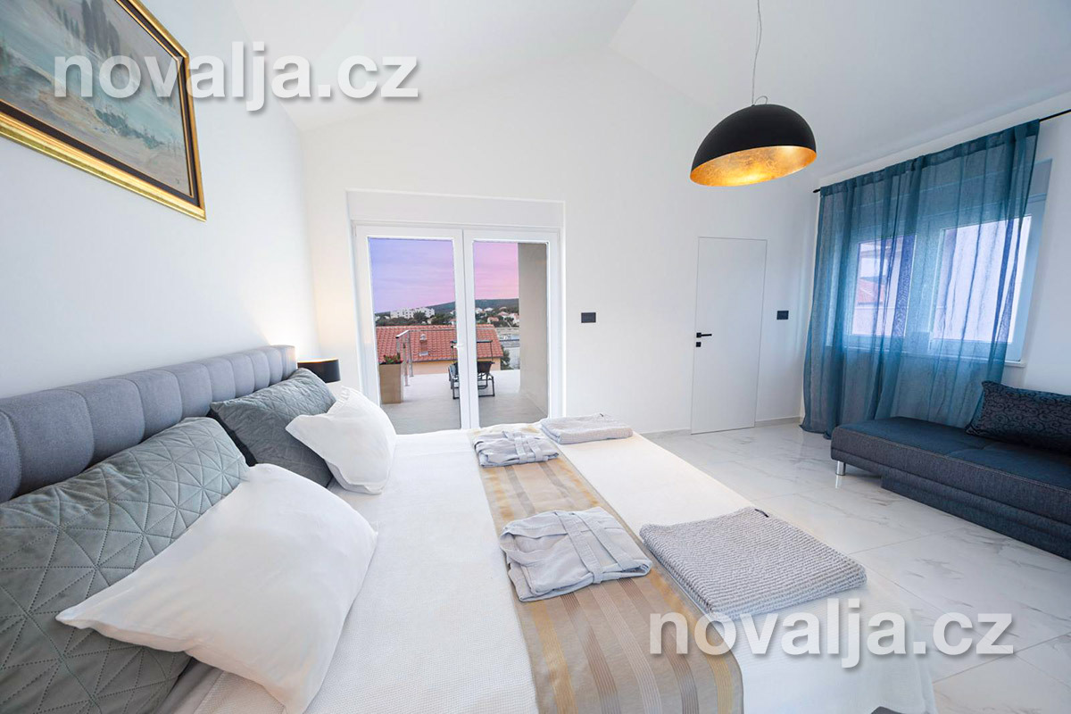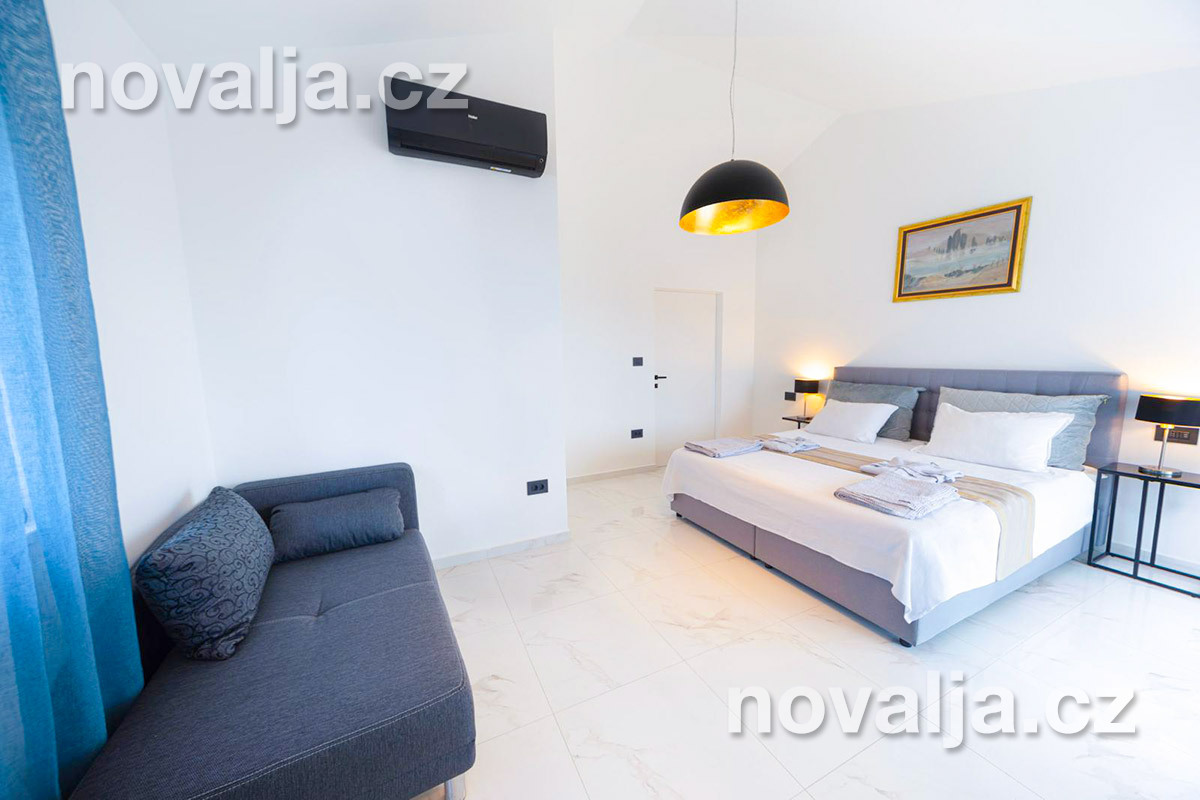2 ložnice - každá ložnice má manželské lůžko a rozkládací pohovku pro 1 dítě, vlastní terasu, LCD TV+Netflix, vlastní koupelnu se sprchovým koutem a wc. Obě ložnice jsou klimatizované (v ceně).