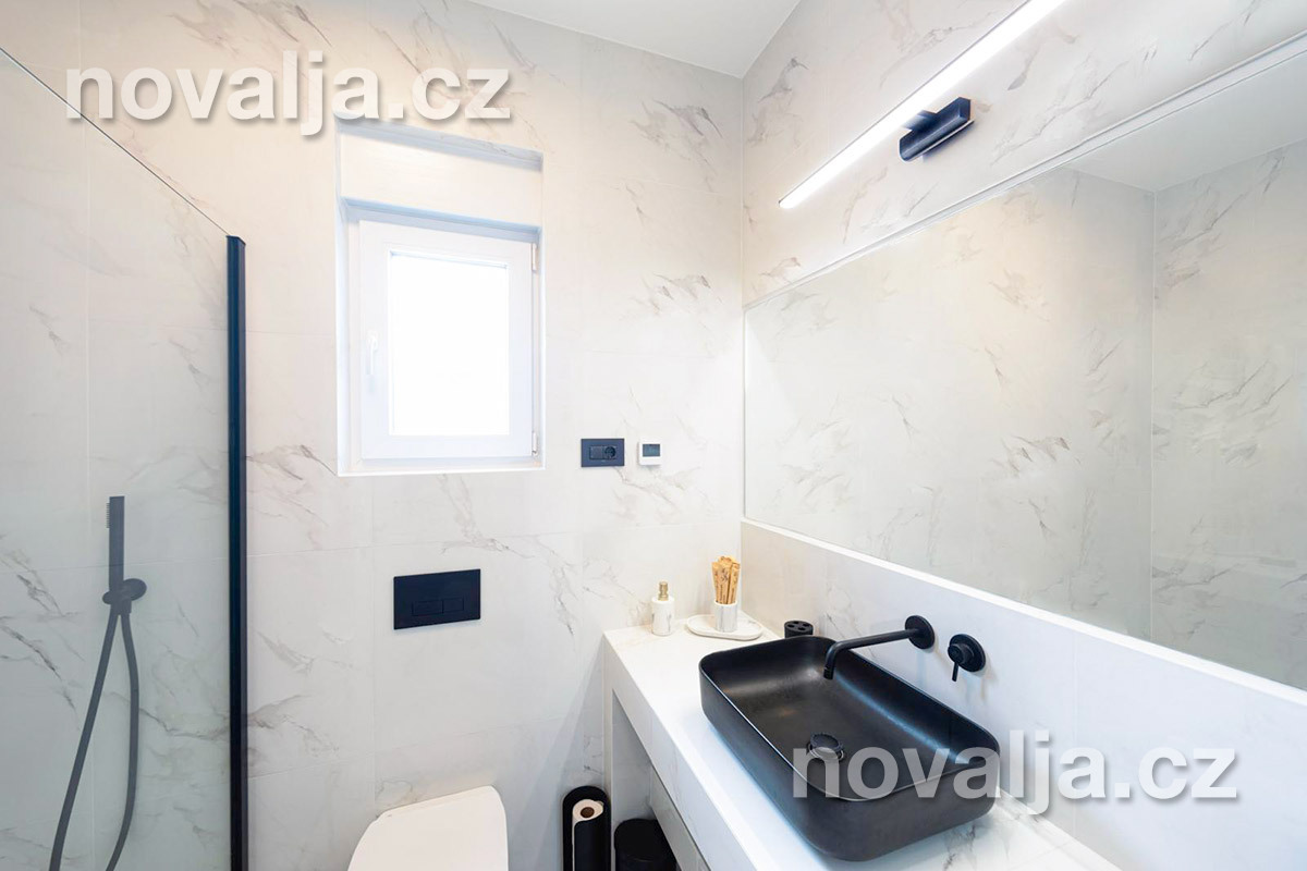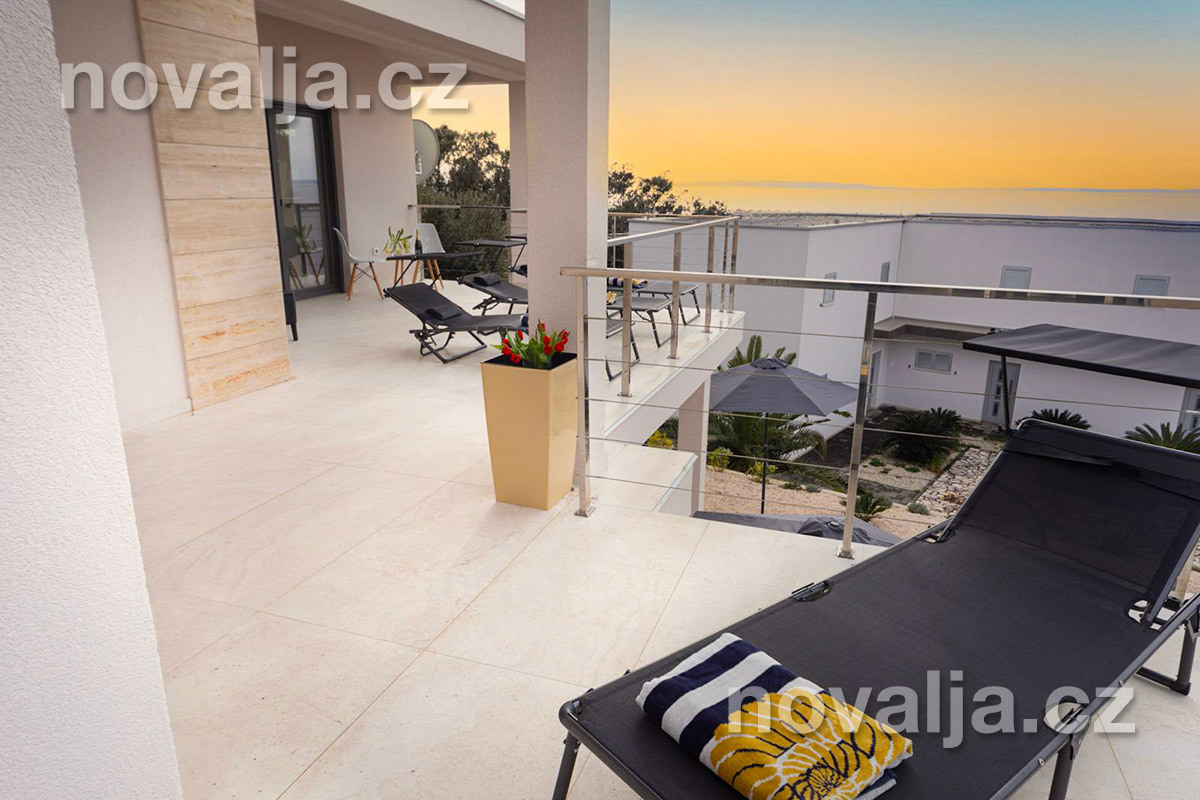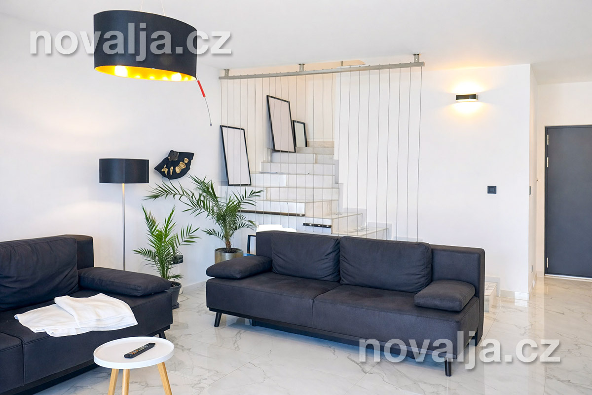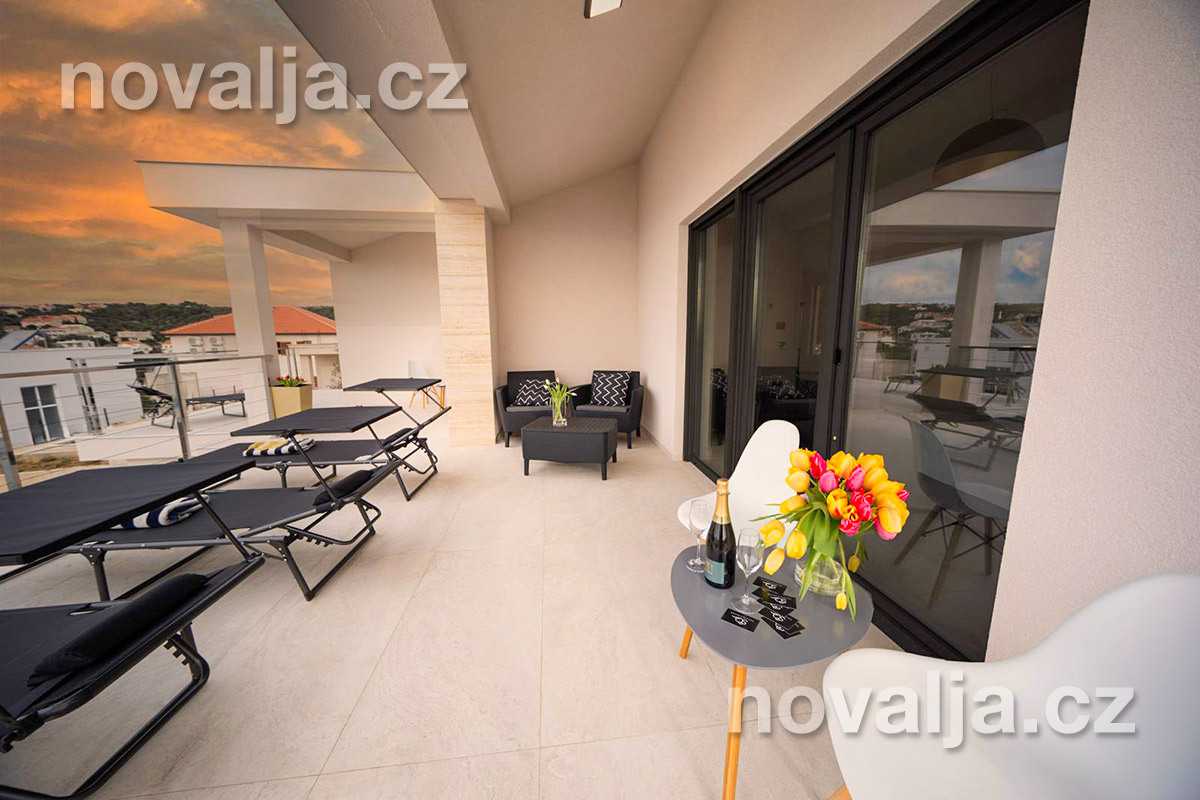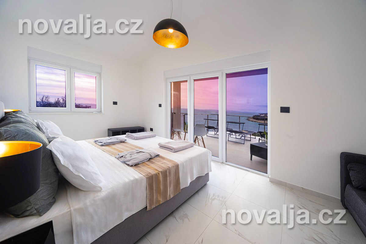 2 ložnice - každá ložnice má manželské lůžko a rozkládací pohovku pro 1 dítě, vlastní terasu, LCD TV+Netflix, vlastní koupelnu se sprchovým koutem a wc. Obě ložnice jsou klimatizované (v ceně).