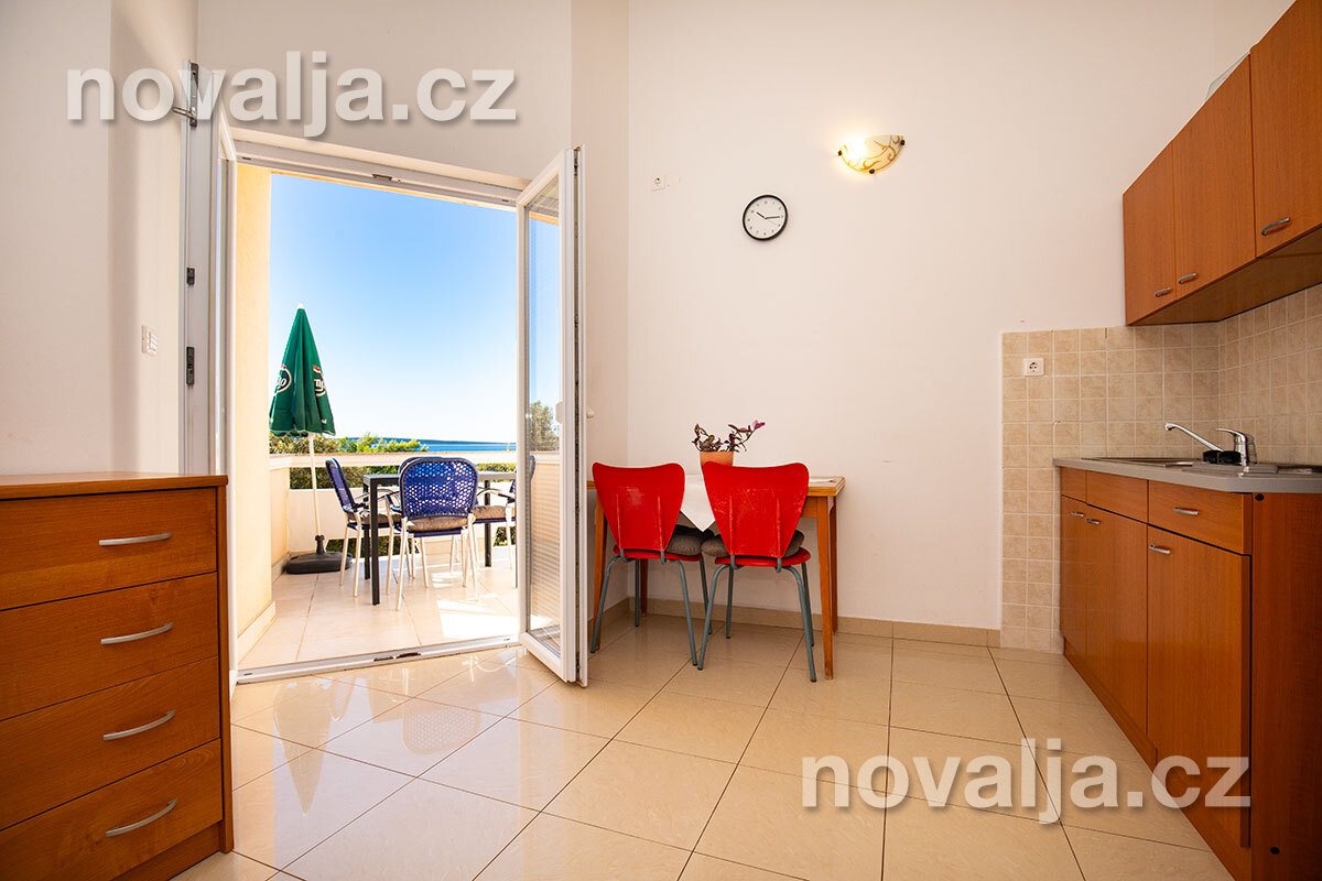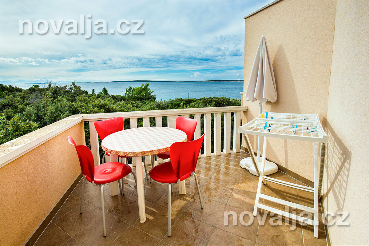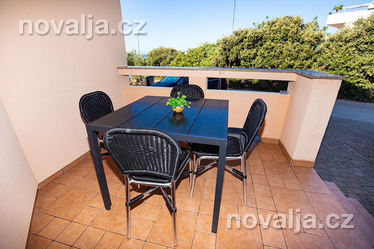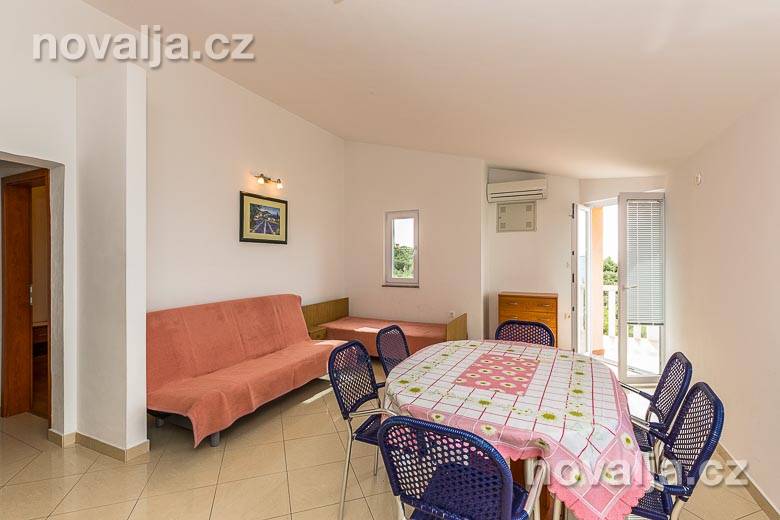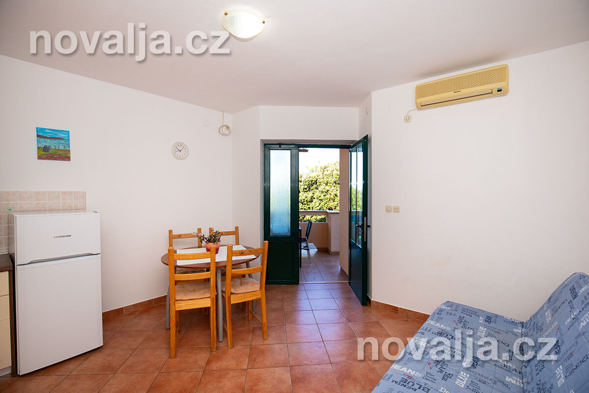 1 ložnice se dvěma lůžky, vybavená kuchyň (lednička, mrazák, varná konvice, toaster) s rozkládacím gaučem (190 x 125 cm) pro 1–2 osoby (buď 2 děti do 12 let, nebo jen 1 osoba starší 12 let), sociální zařízení se sprchovým koutem a WC, terasa s výhledem na moře, slunečník na terase. Klimatizace v kuchyni (v ceně).