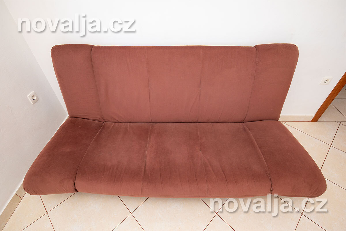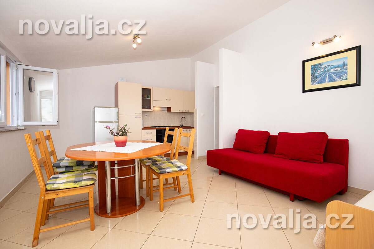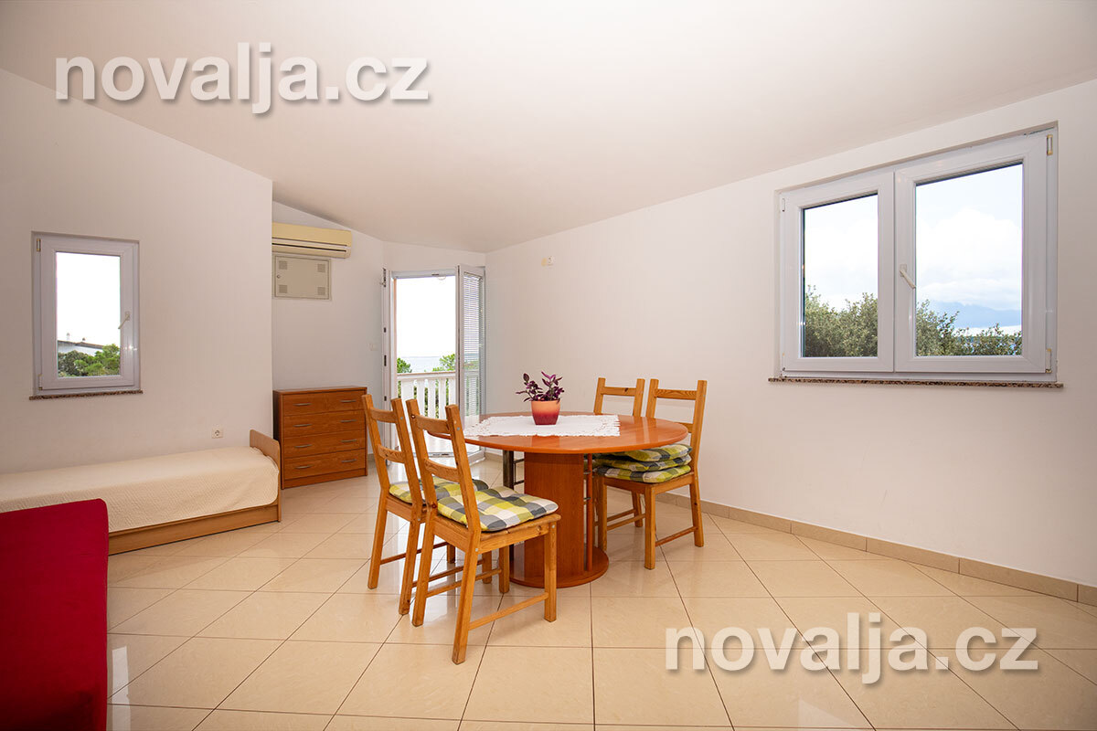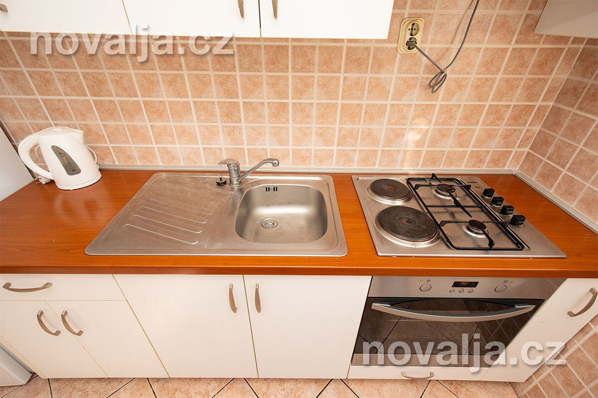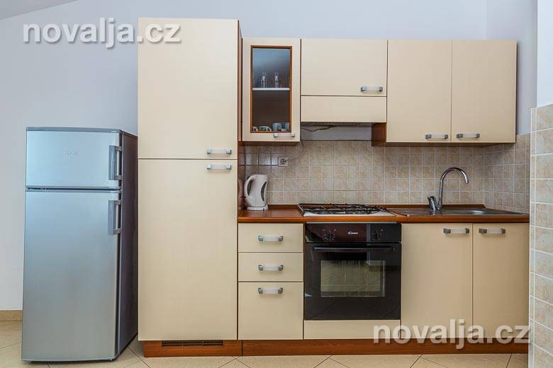 1 ložnice se dvěma lůžky, vybavená kuchyň (lednička, mrazák, trouba, varná konvice) s dalším lůžkem a rozkládacím gaučem (200 x 164 cm) pro 1–2 osoby (buď 2 děti do 12 let, nebo jen 1 osoba starší 12 let), sociální zařízení se sprchovým koutem a WC, krytá terasa s výhledem na moře. Klimatizace v kuchyni (v ceně).