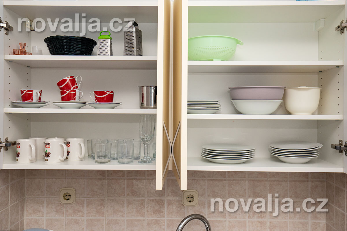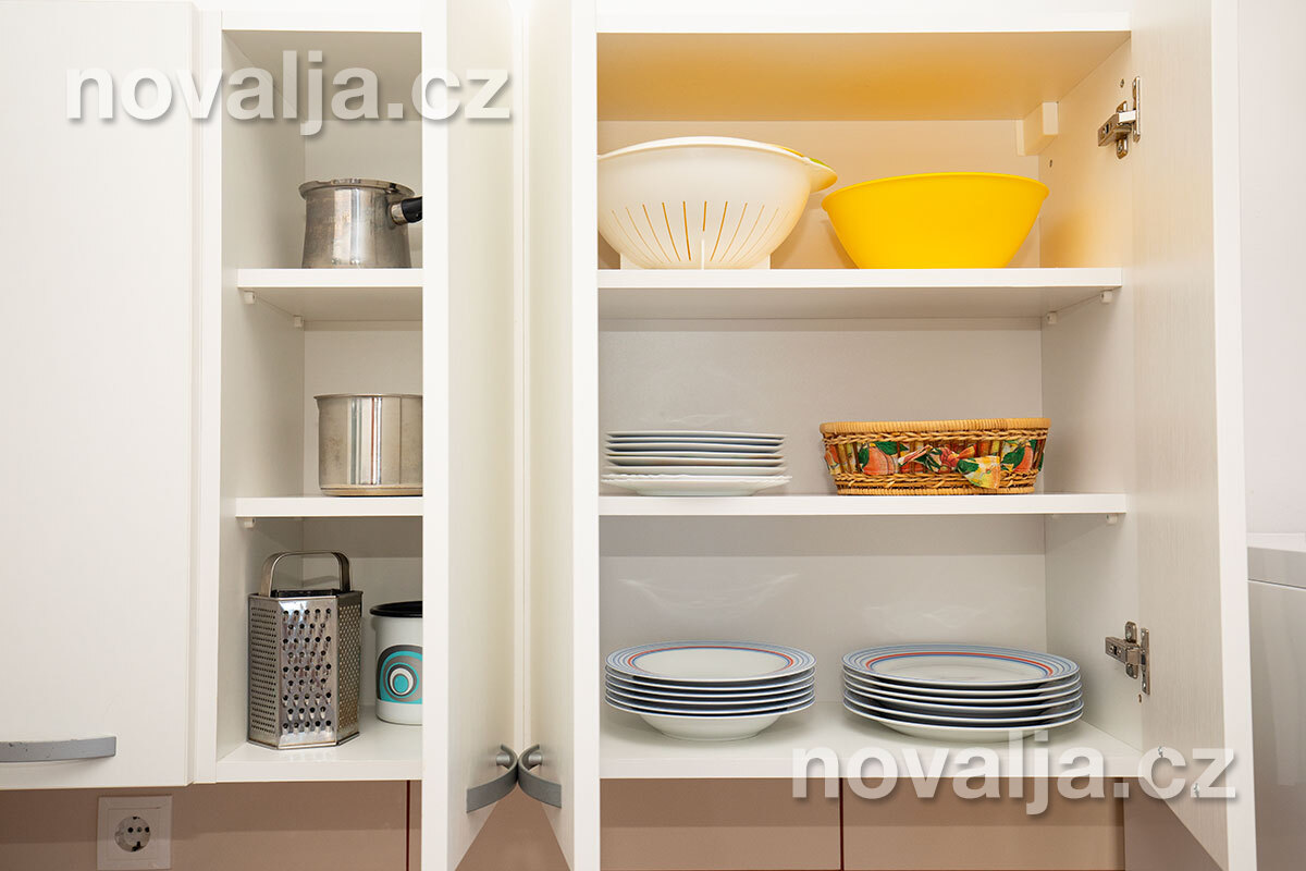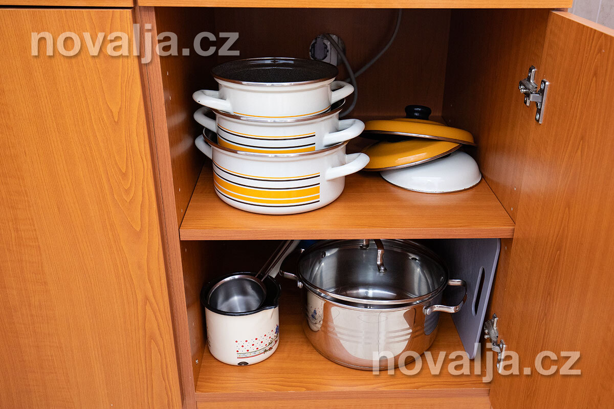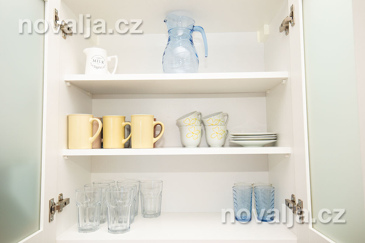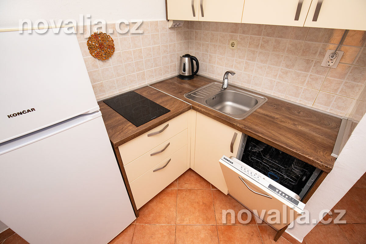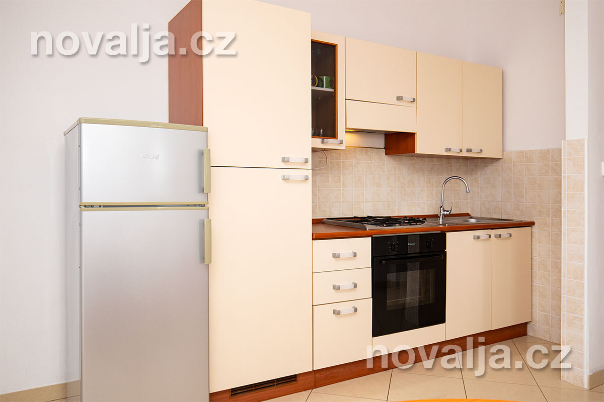 1 ložnice se dvěma lůžky, vybavená kuchyň (lednička, mrazák, myčka, varná konvice) s rozkládacím gaučem (190 x 125 cm) pro 1–2 osoby (buď 2 děti do 12 let, nebo jen 1 osoba starší 12 let), sociální zařízení se sprchovým koutem a WC, terasa. Klimatizace v kuchyni (v ceně).