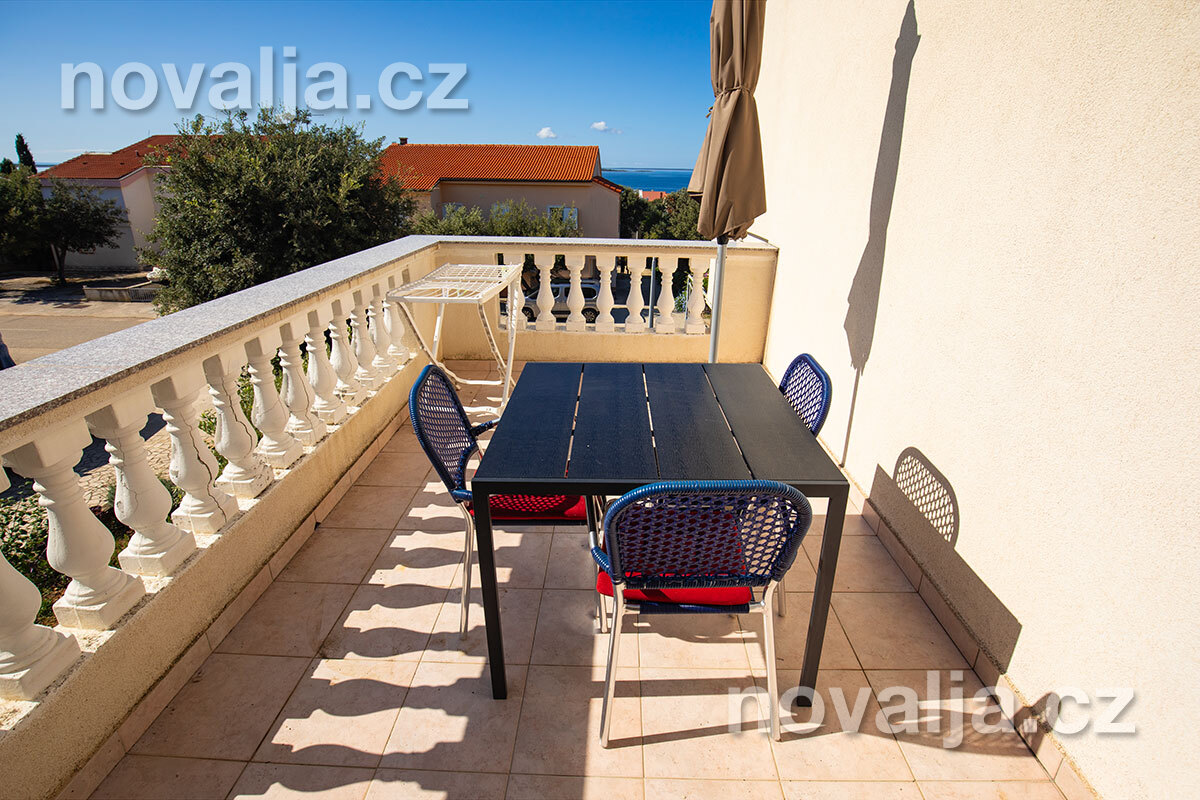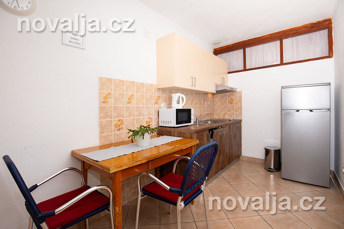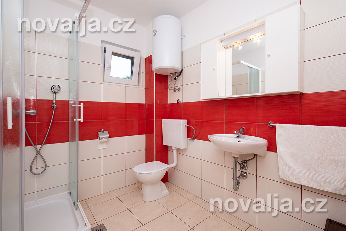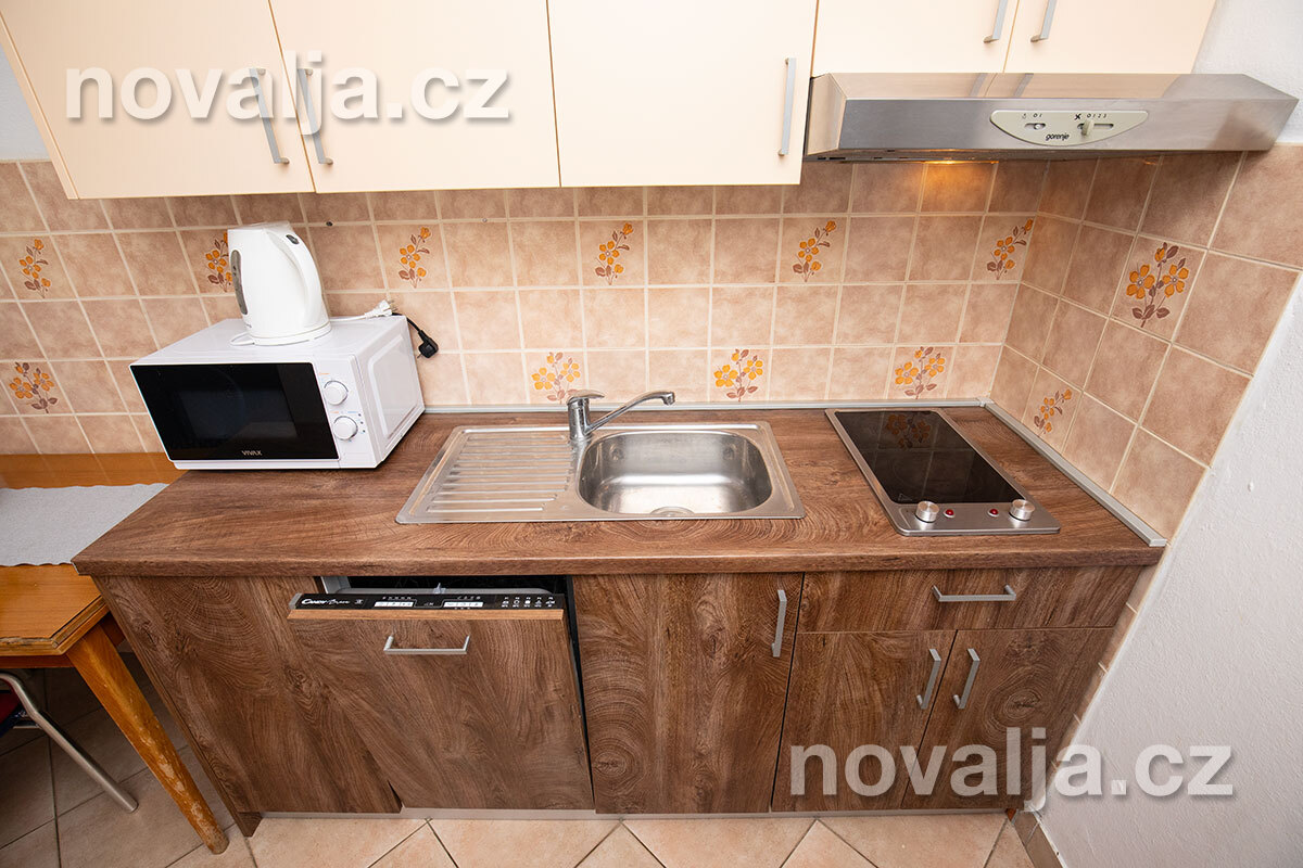 1 ložnice se třemi lůžky, vybavená kuchyň (lednička, varná konvice, myčka, mikrovlnná trouba) - v kuchyni není okno, sociální zařízení se sprchovým koutem a WC, velká terasa s výhledem na moře. Klimatizace v ložnici (v ceně).