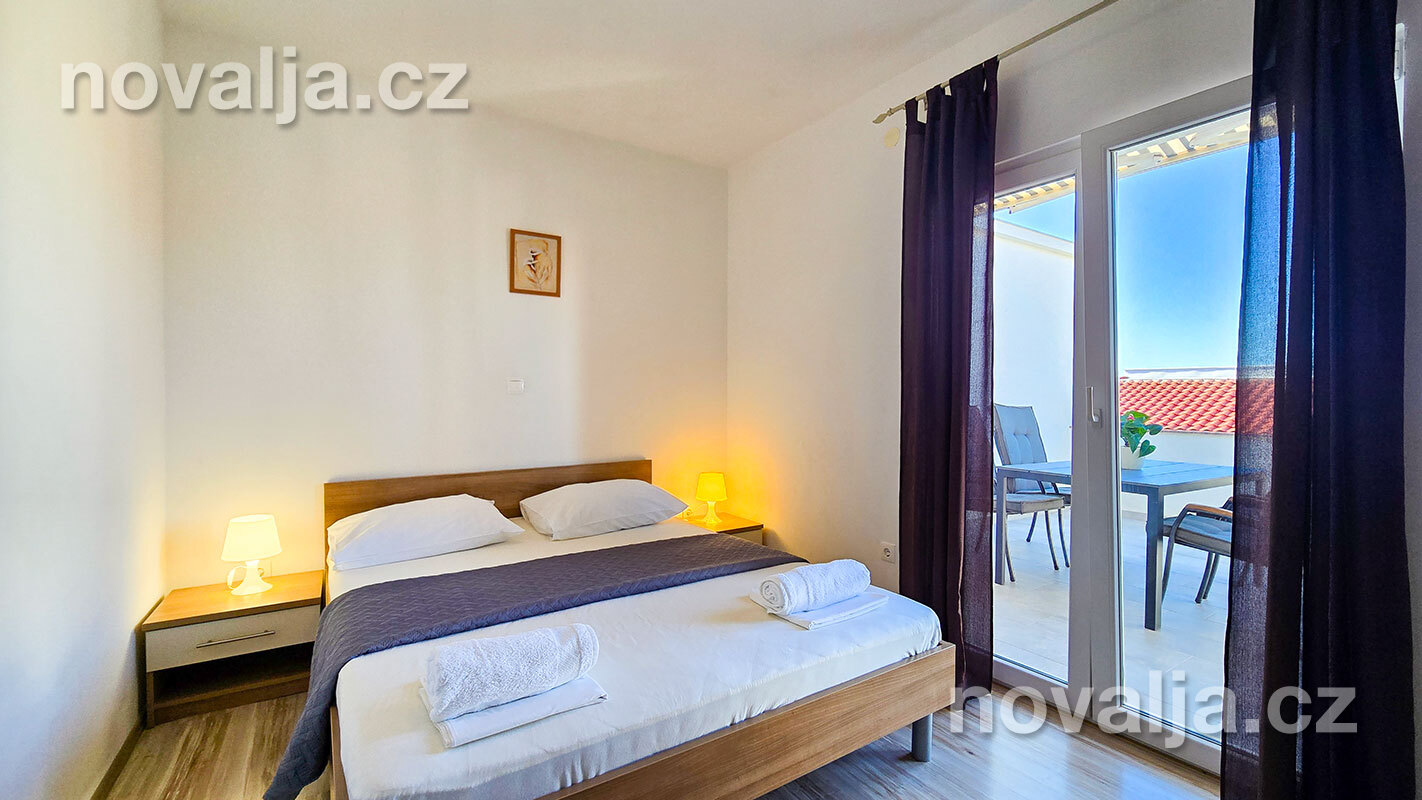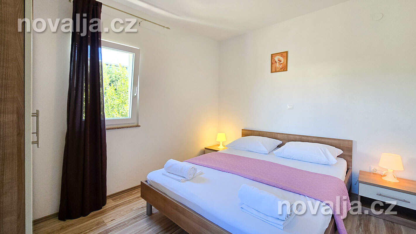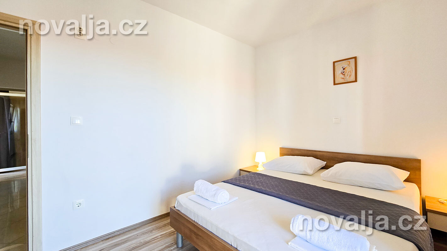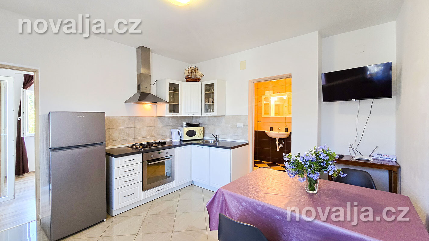 3 ložnice se dvěma lůžky (v jedné ložnici je poschoďové lůžko a spodní výsuvné lůžko), vybavená kuchyň (lednička, mrazák, trouba, myčka, varná konvice), obývací prostor s rozkládacím gaučem pro 1–2 osoby, TV s internetem, šatna, 2x sociální zařízení se sprchovým koutem a WC, fén, prostorná terasa s částečným výhledem na moře (vstup na terasu z kuchyně a z jedné ložnice). Klimatizace v kuchyni (v ceně).