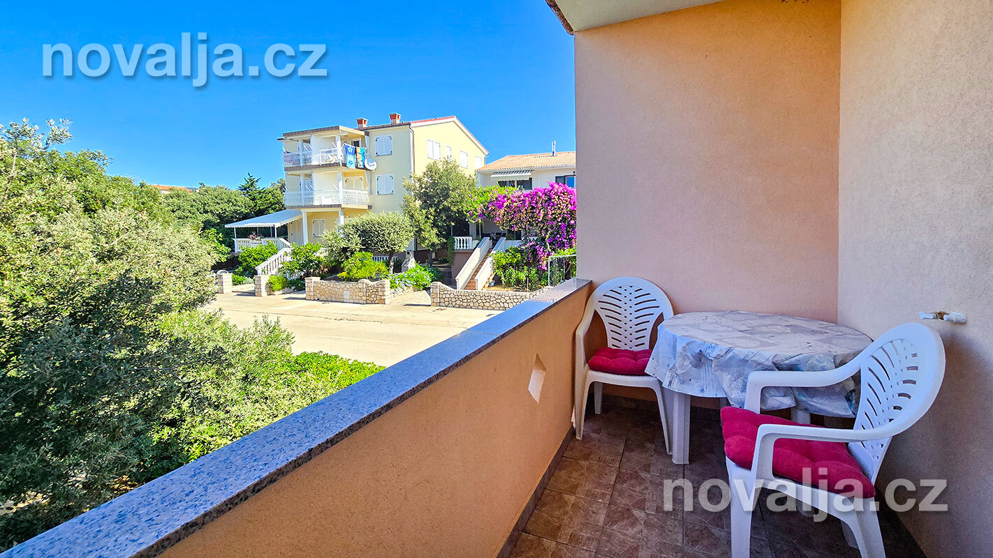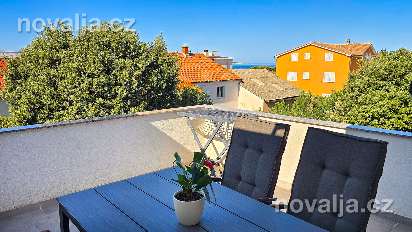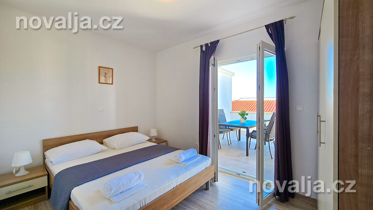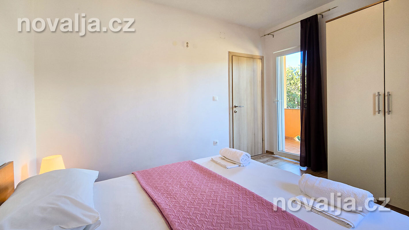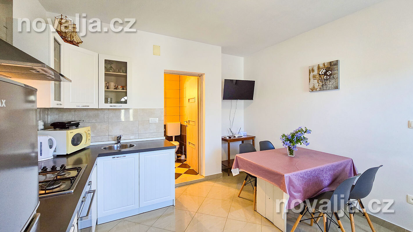 3 ložnice se dvěma lůžky (v jedné ložnici je poschoďové lůžko a spodní výsuvné lůžko), vybavená kuchyň (lednička, mrazák, trouba, myčka, varná konvice), obývací prostor s rozkládacím gaučem pro 1–2 osoby, TV s internetem, šatna, 2x sociální zařízení se sprchovým koutem a WC, fén, prostorná terasa s částečným výhledem na moře (vstup na terasu z kuchyně a z jedné ložnice). Klimatizace v kuchyni (v ceně).