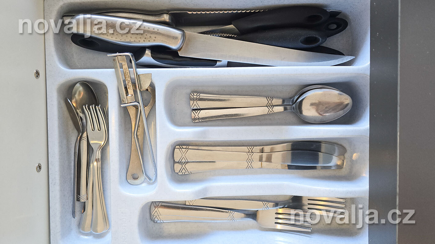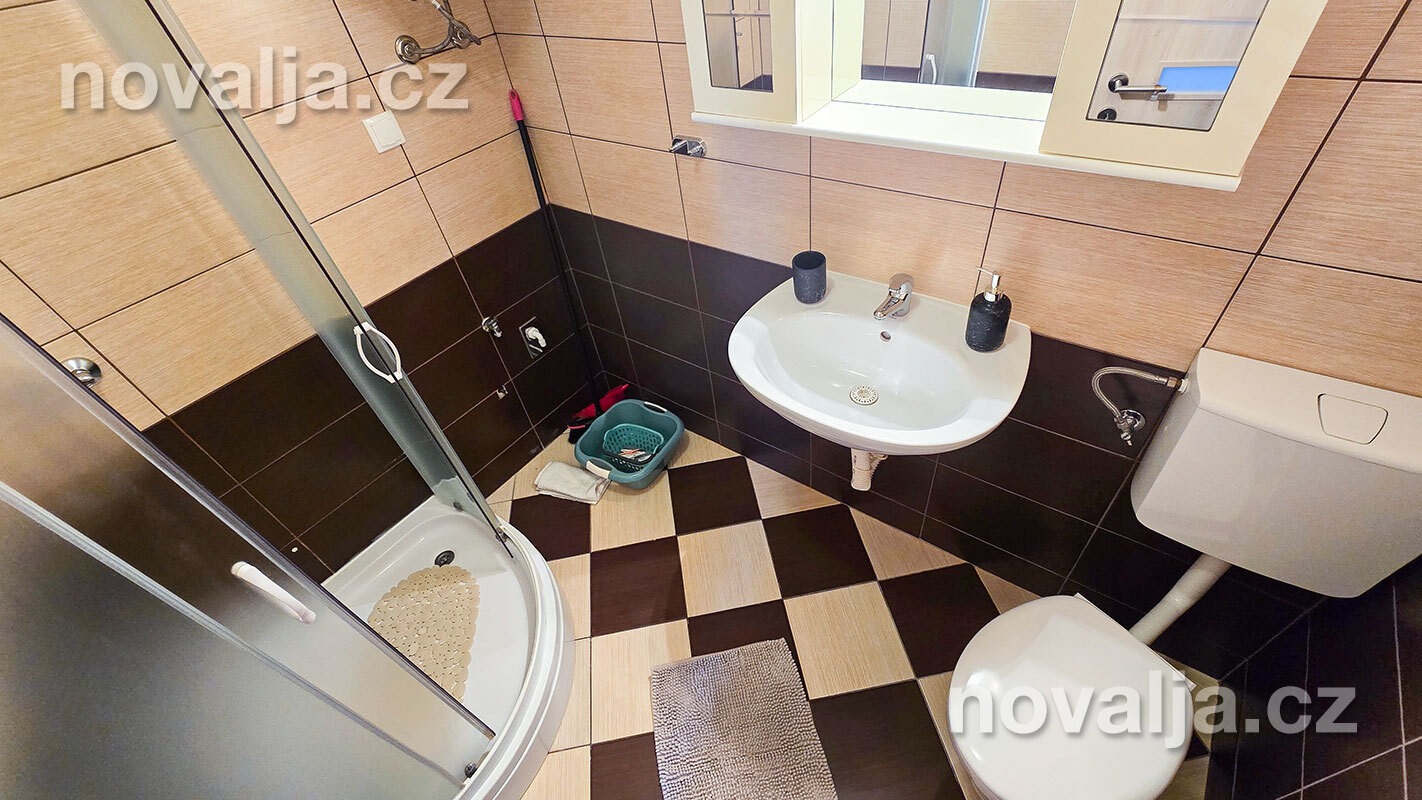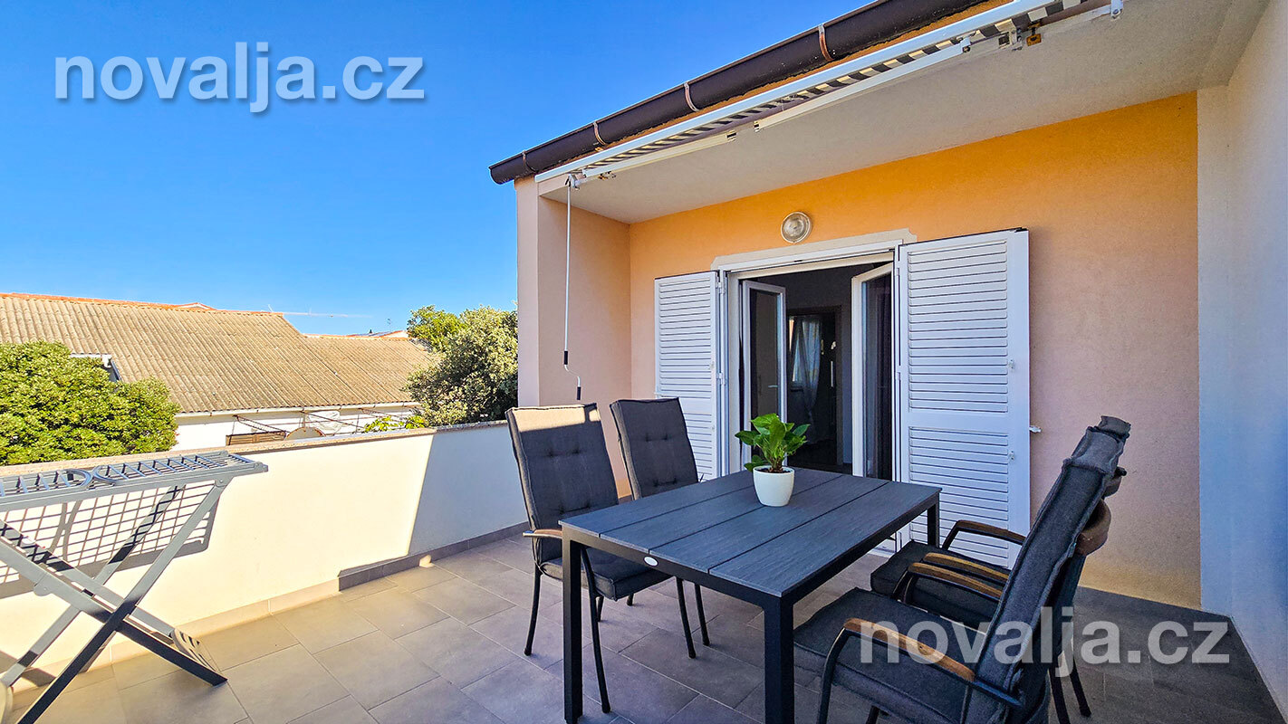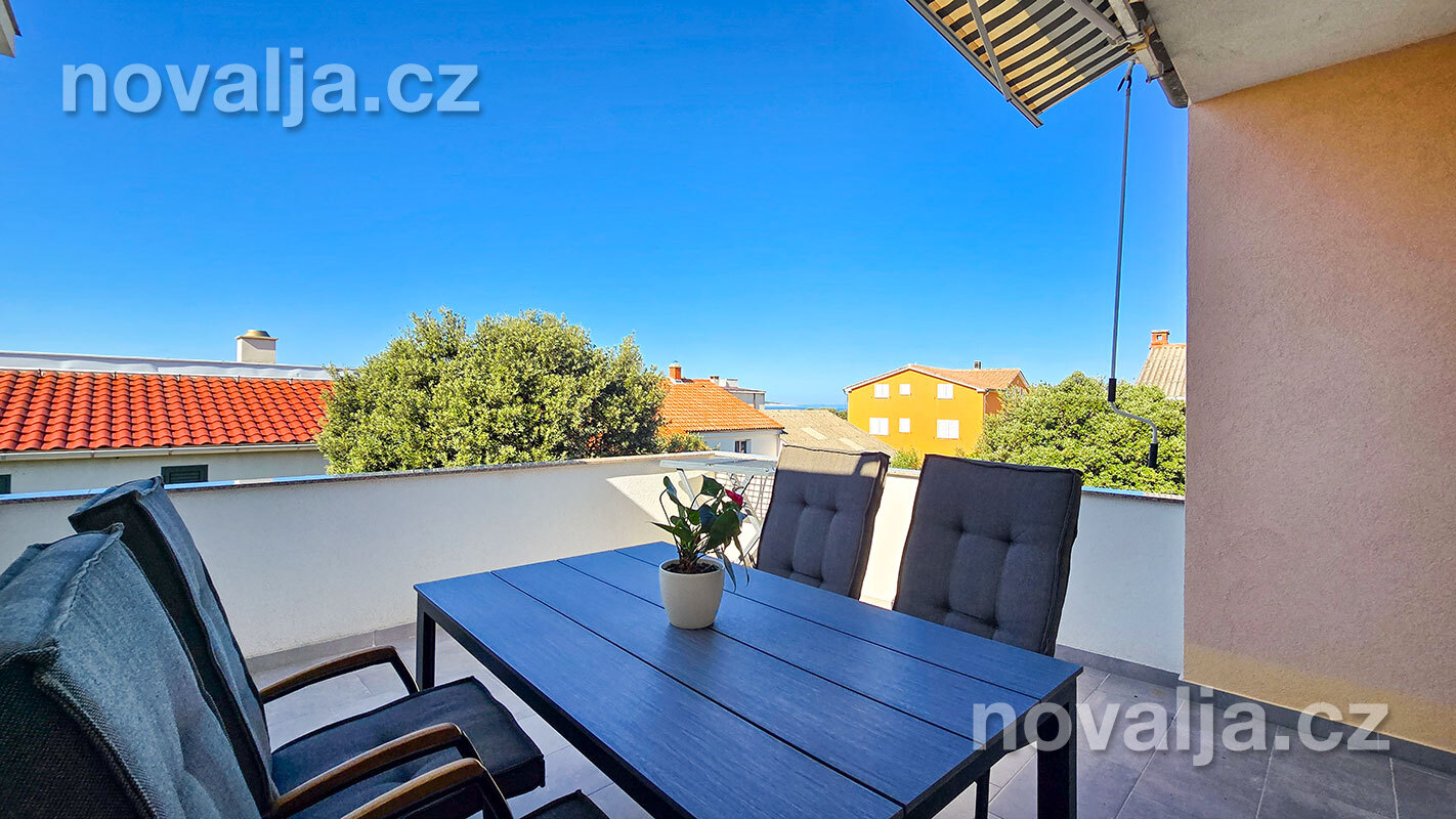 3 ložnice se dvěma lůžky (v jedné ložnici je poschoďové lůžko a spodní výsuvné lůžko), vybavená kuchyň (lednička, mrazák, trouba, myčka, varná konvice), obývací prostor s rozkládacím gaučem pro 1–2 osoby, TV s internetem, šatna, 2x sociální zařízení se sprchovým koutem a WC, fén, prostorná terasa s částečným výhledem na moře (vstup na terasu z kuchyně a z jedné ložnice). Klimatizace v kuchyni (v ceně).