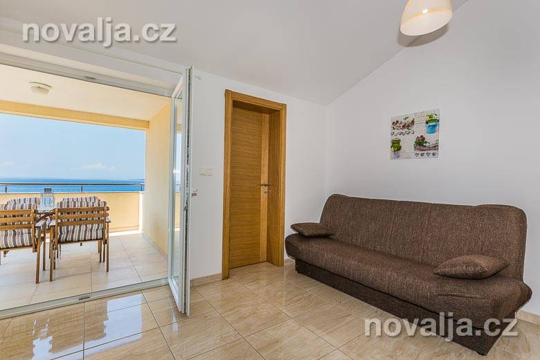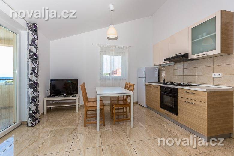 2 ložnice se dvěma lůžky, vybavená kuchyň (lednička, mrazák, trouba, myčka + tablety do myčky, mikrovlnná trouba, varná konvice) s rozkládacím gaučem pro 1 osobu, TV+SAT, sociální zařízení se sprchovým koutem a WC, fén, terasa s výhledem na moře. Klimatizace v kuchyni (v ceně). Rozloha 54 m².