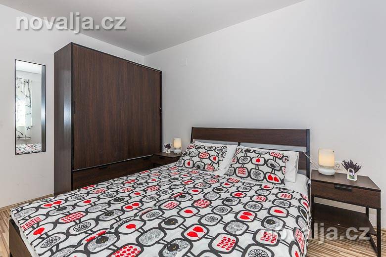 2 ložnice se dvěma lůžky, vybavená kuchyň (lednička, mrazák, trouba, myčka + tablety do myčky, mikrovlnná trouba, varná konvice) s rozkládacím gaučem pro 1 osobu (jen dítě do 12 let), TV+SAT, sociální zařízení se sprchovým koutem a WC, fén, terasa. Klimatizace v kuchyni (v ceně). Rozloha 43 m².